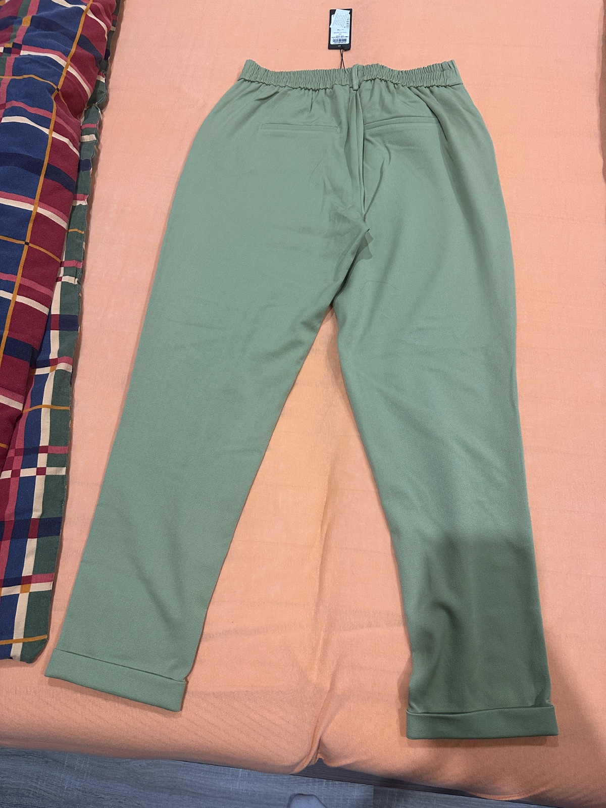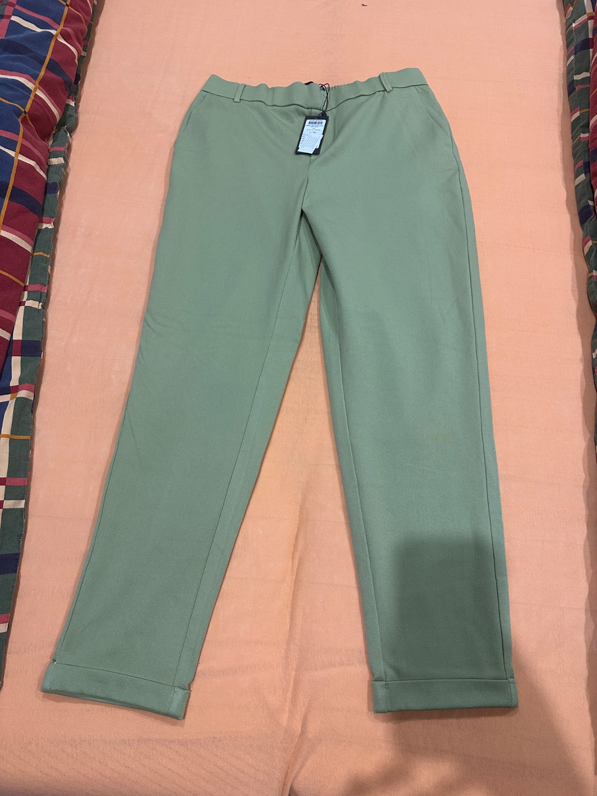 Nohavice svetlo zelenej farby s prijemneho elastickeho materialu. Celkova dlžka-99 cm sirka v pase-44cm x2,sirka cez boky-58cm x2,a sirka stehna-31cm x2+postovne