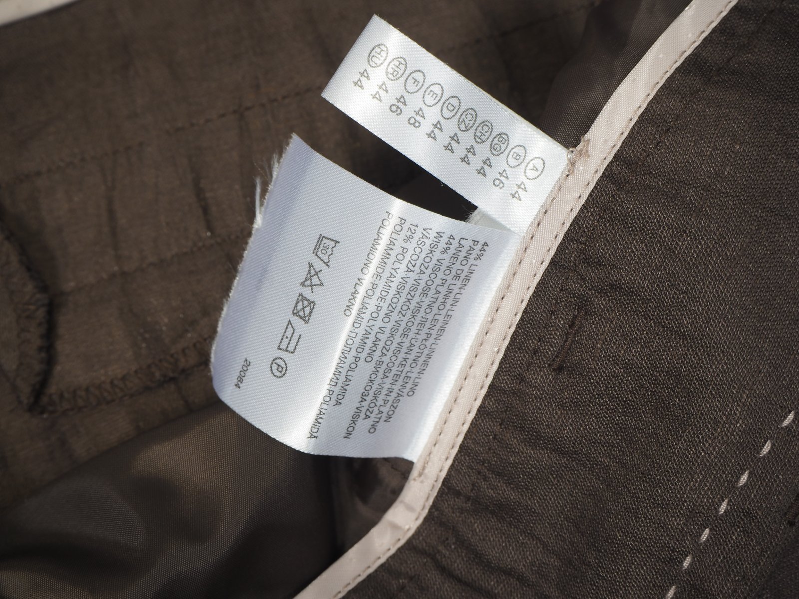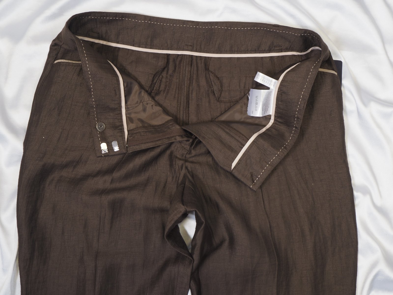 Luxusné elegantné nohavice tmavohnedej farby, zapínanie na zips a 2 háčiky, materiál 44% ľan, 44% viskóza, 12% nylon, nové s visačkou, bez opasku.