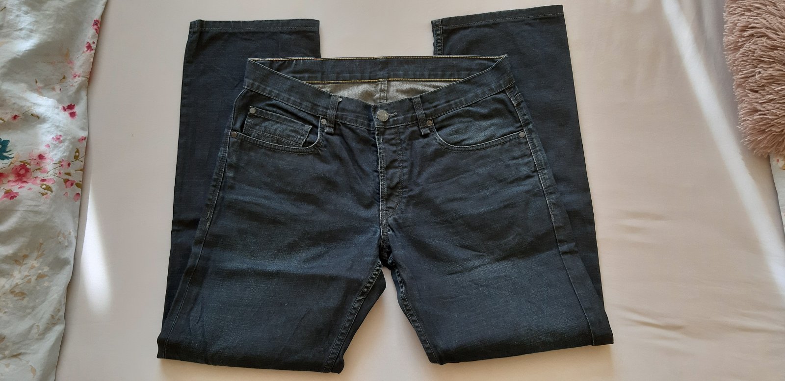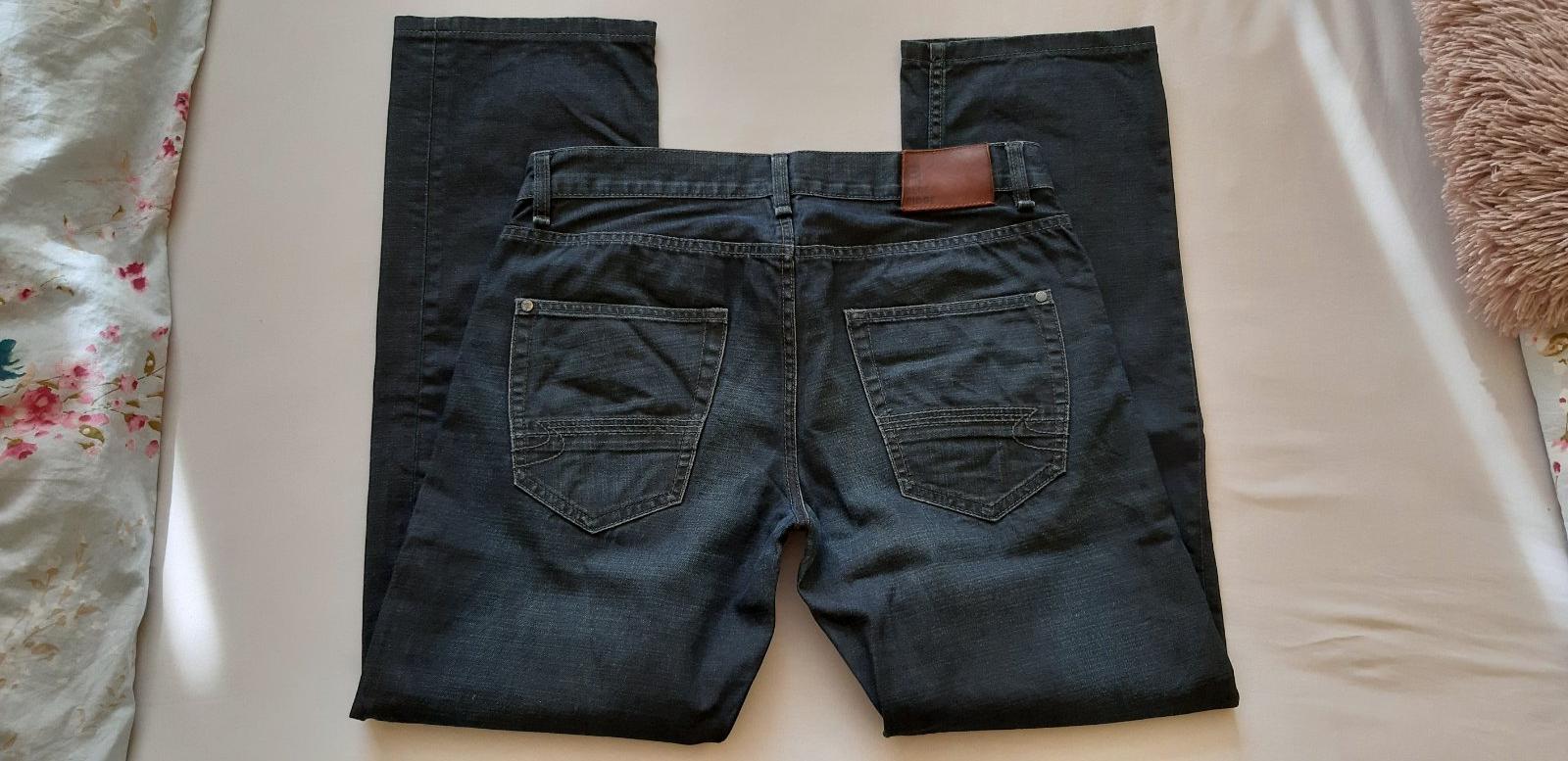 pánske rifle bez poškodení a známok nosenia. oblečené pár krát. veľkosť W32 L30. rozmery sú pás 43cm, boky 57cm, sed vpredu 28cm, vzadu 41cm, dĺžka 104cm, šírka nohavice 19cm. Kvalitny prijemny mat...