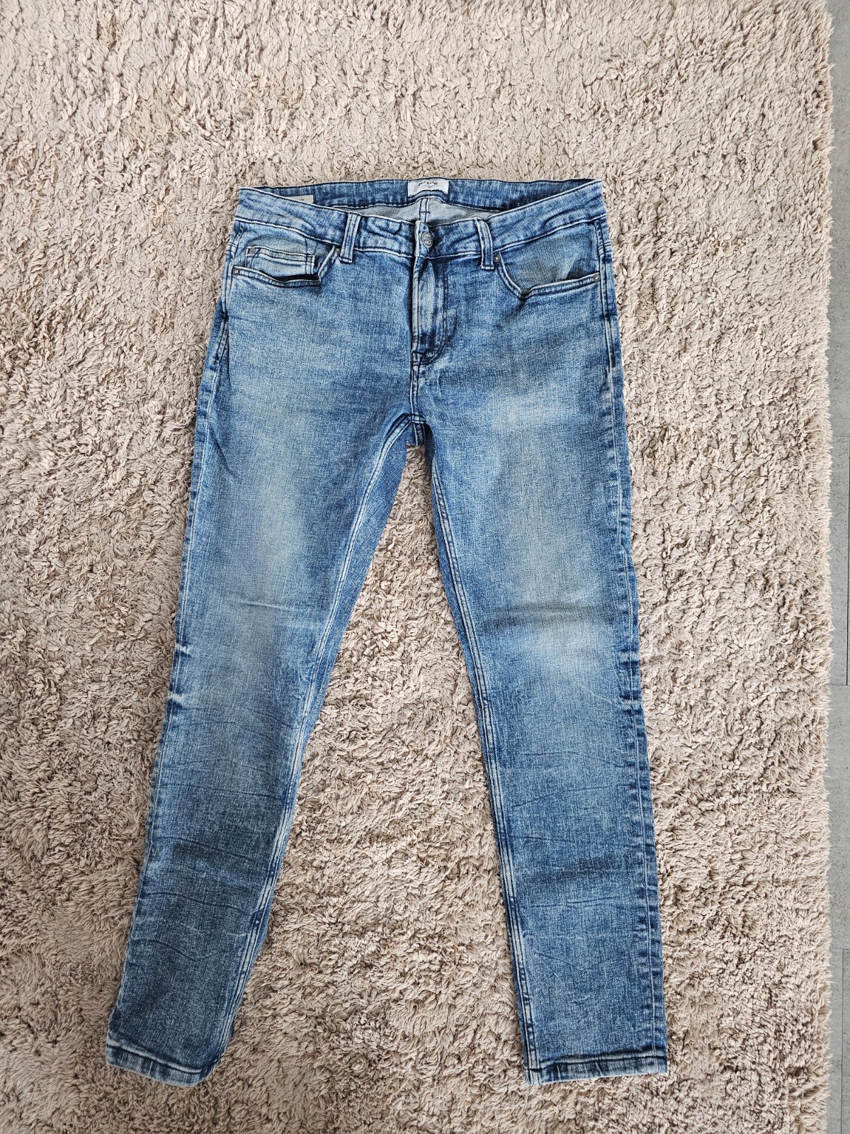 Predám rifle, bledo modrej farby, zapínanie na zips a gombík, vrecká Vpredu i vzadu, pútka na opasok. Rovný strih. Dĺžka cca 78cm Šírka v páse 34cm x2