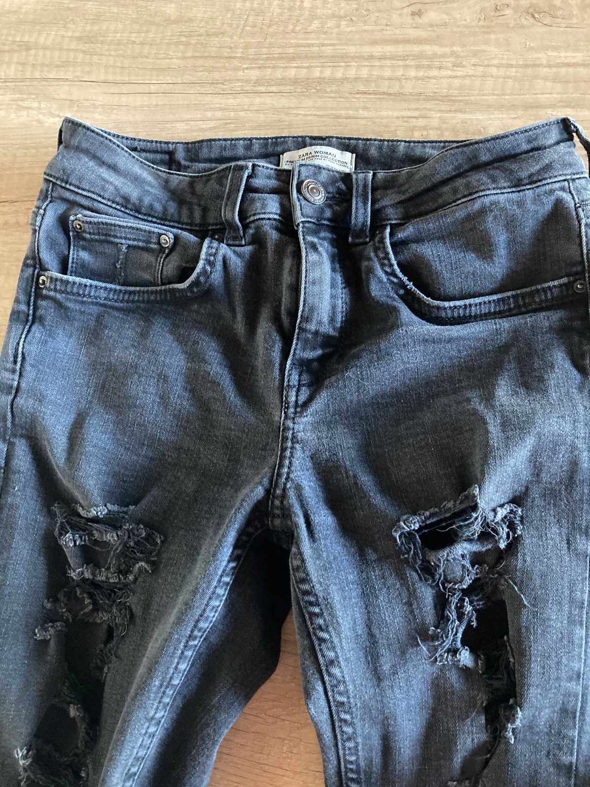 Farba je taká sivo-cierna riflovina. Elastická a pekne tvaruje postavu. Rozmery: pás 32-36cm x 2 ( skôr pevnejší), boky 37-42 cm x2 (poddajne), vnútorná dĺžka 71cm, celková dĺžka 98cm.