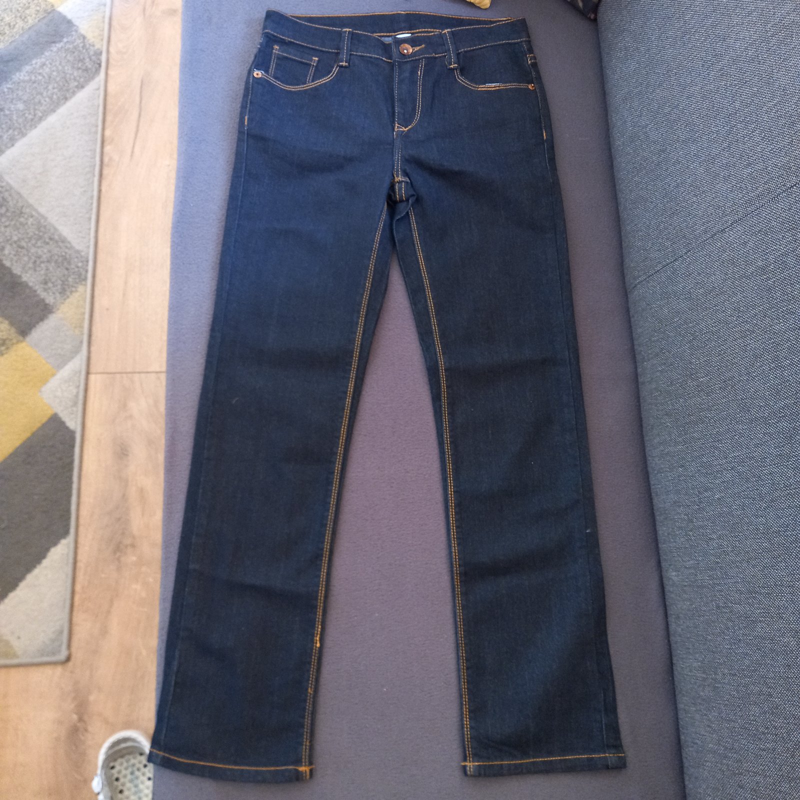 Dievčenské rifle na štíhlu postavu, v super stave, s nastaviteľným pásom, zapínanie na zips + háčik, vpredu aj vzadu 2 vrecká. Dĺžka od pása dole - 89-90 cm, šírka v páse - 31 cm. Materiál: 99% bav...