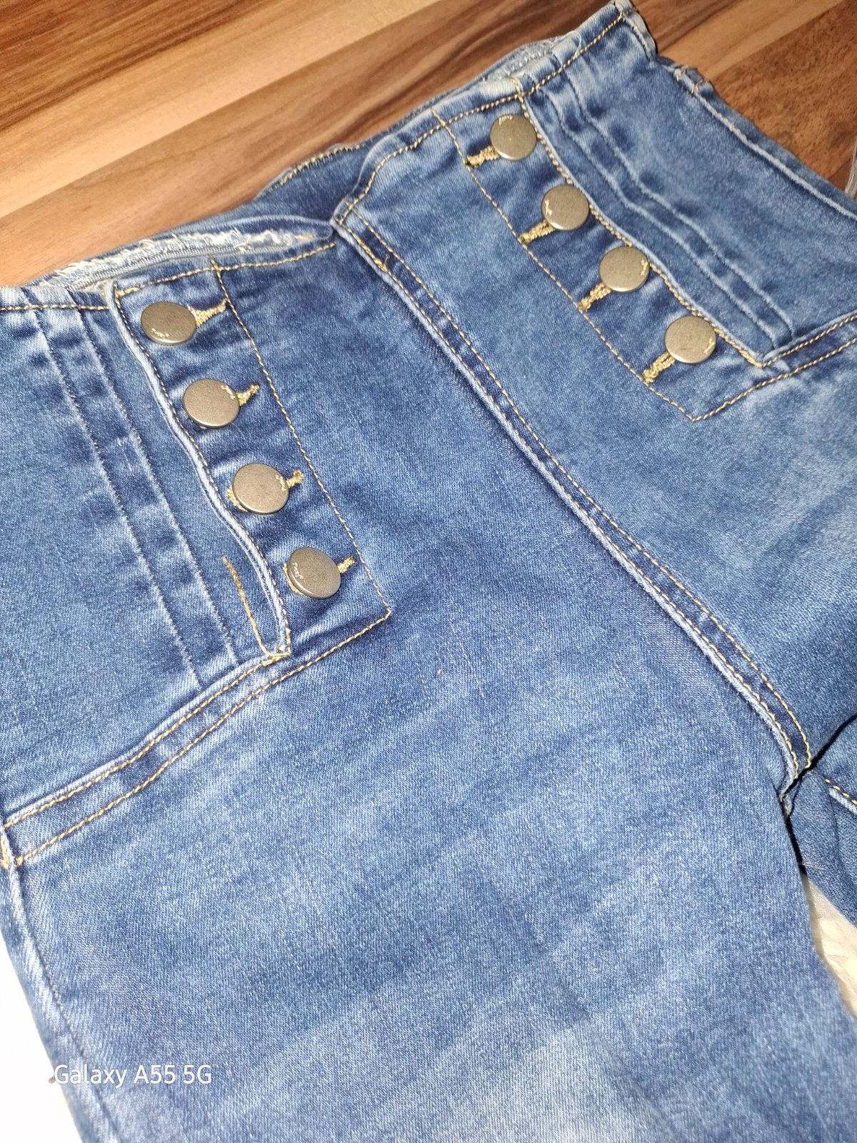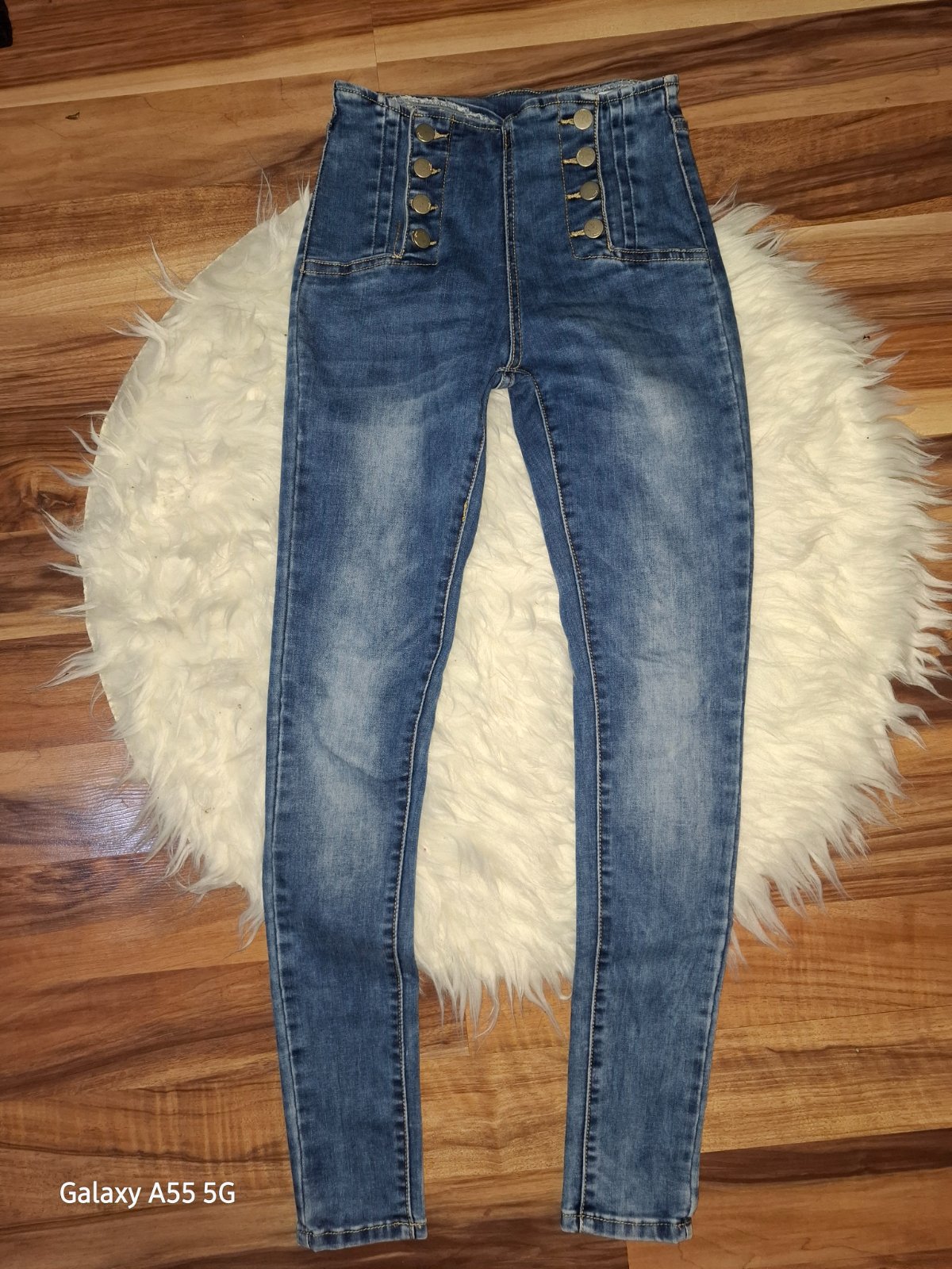 Predám rifle. Veľkosť na štítku 25 Veľkosť. Maju vysoký pás a zapinanie je z boku na gombíky z jednej strany.Rifle sú pružné elastického materiálu . Veľmi dobrý stav.Cena 7,50 eur