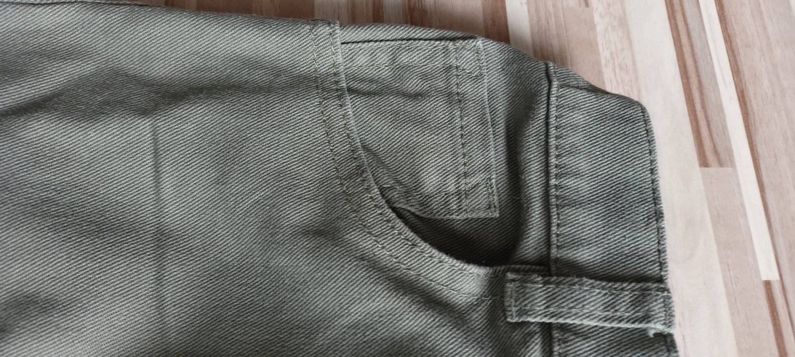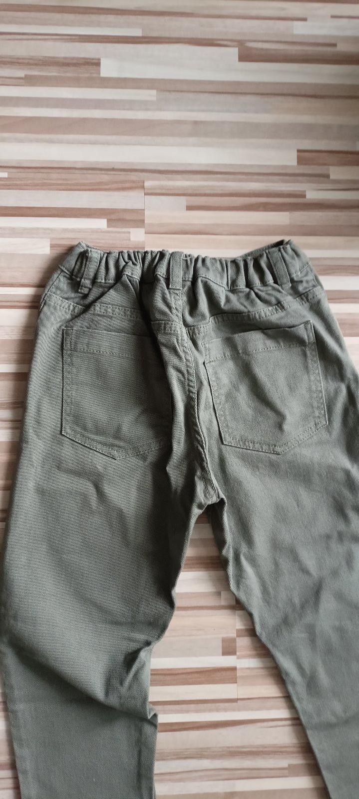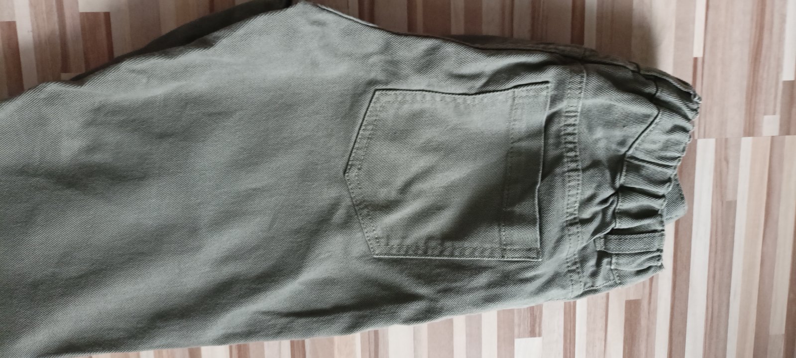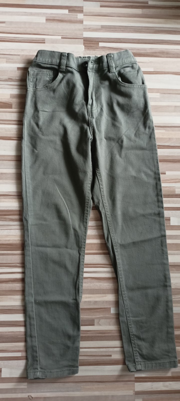 Málo nosené nohavice zelenej farby. Materiál podobný riflovine (denim). Pás nastaviteľný pomocou všitej gumy...