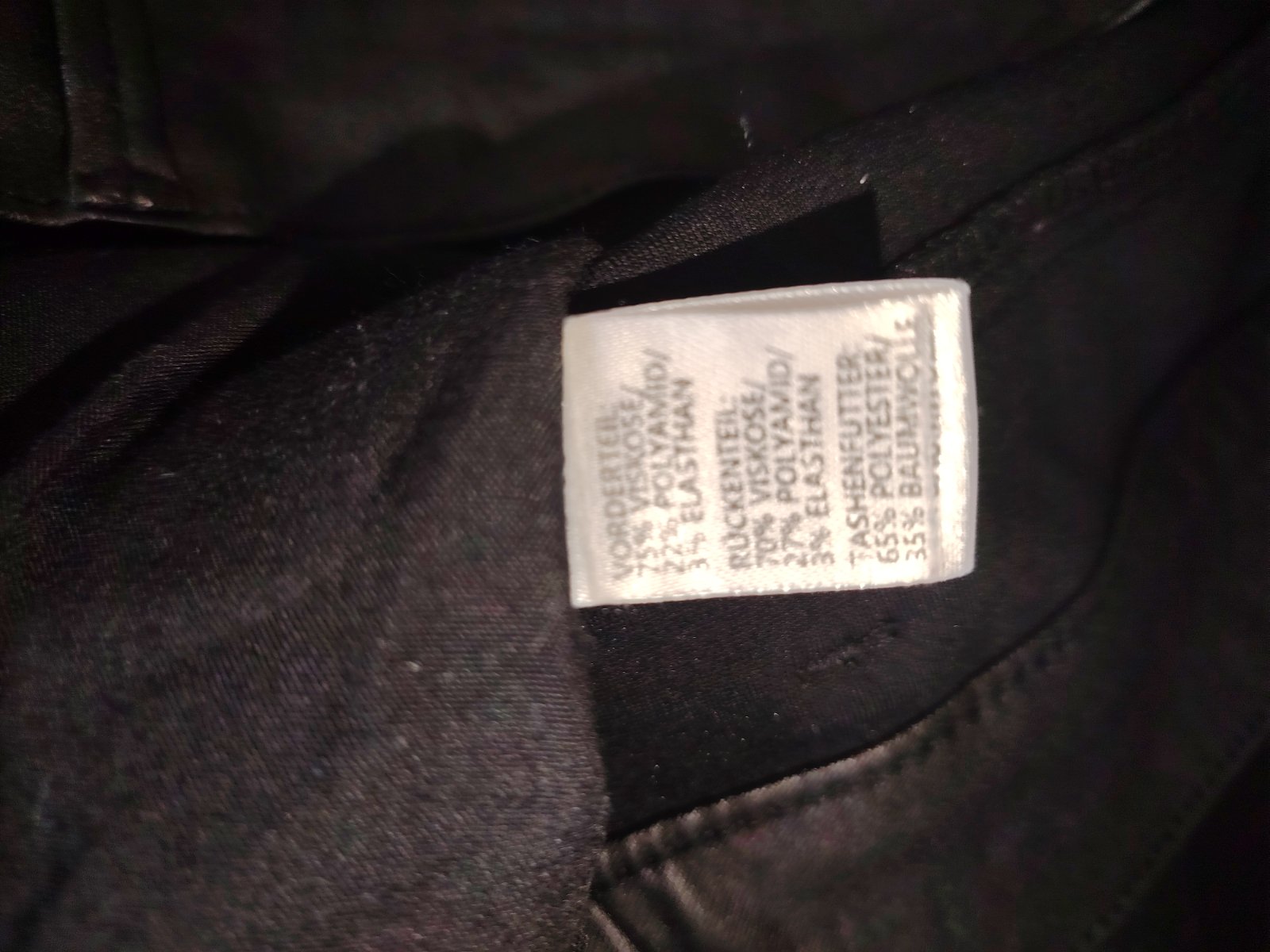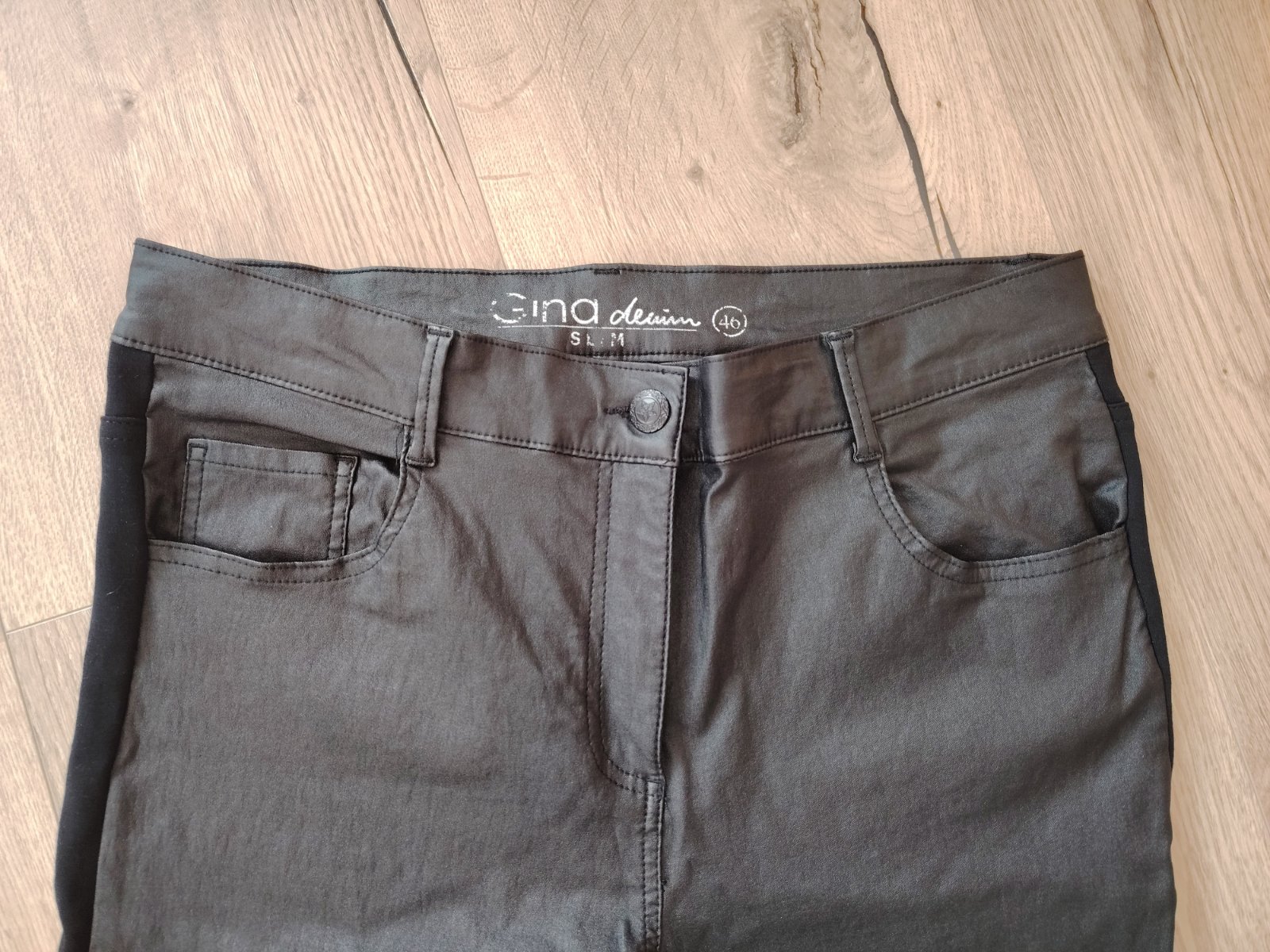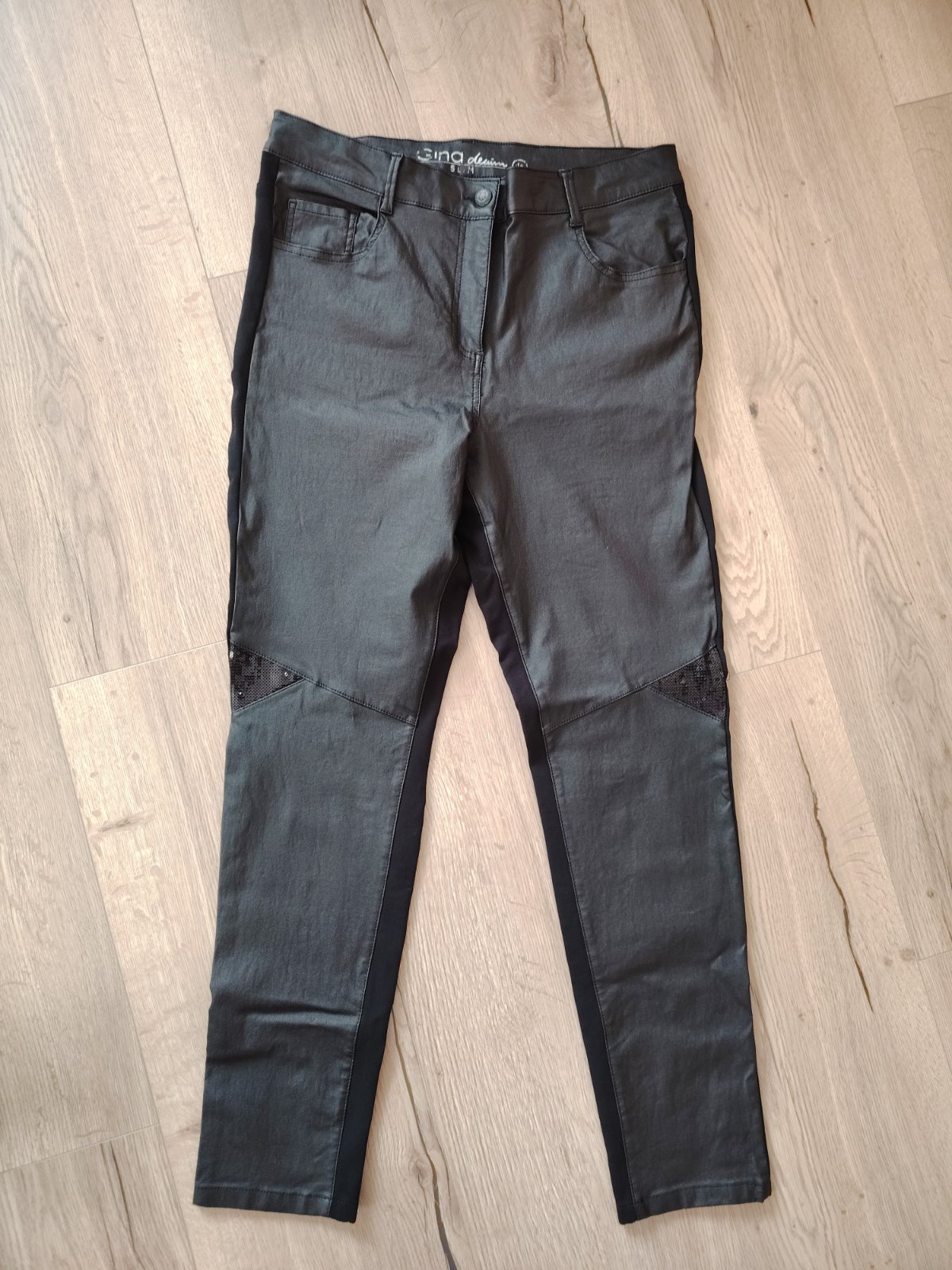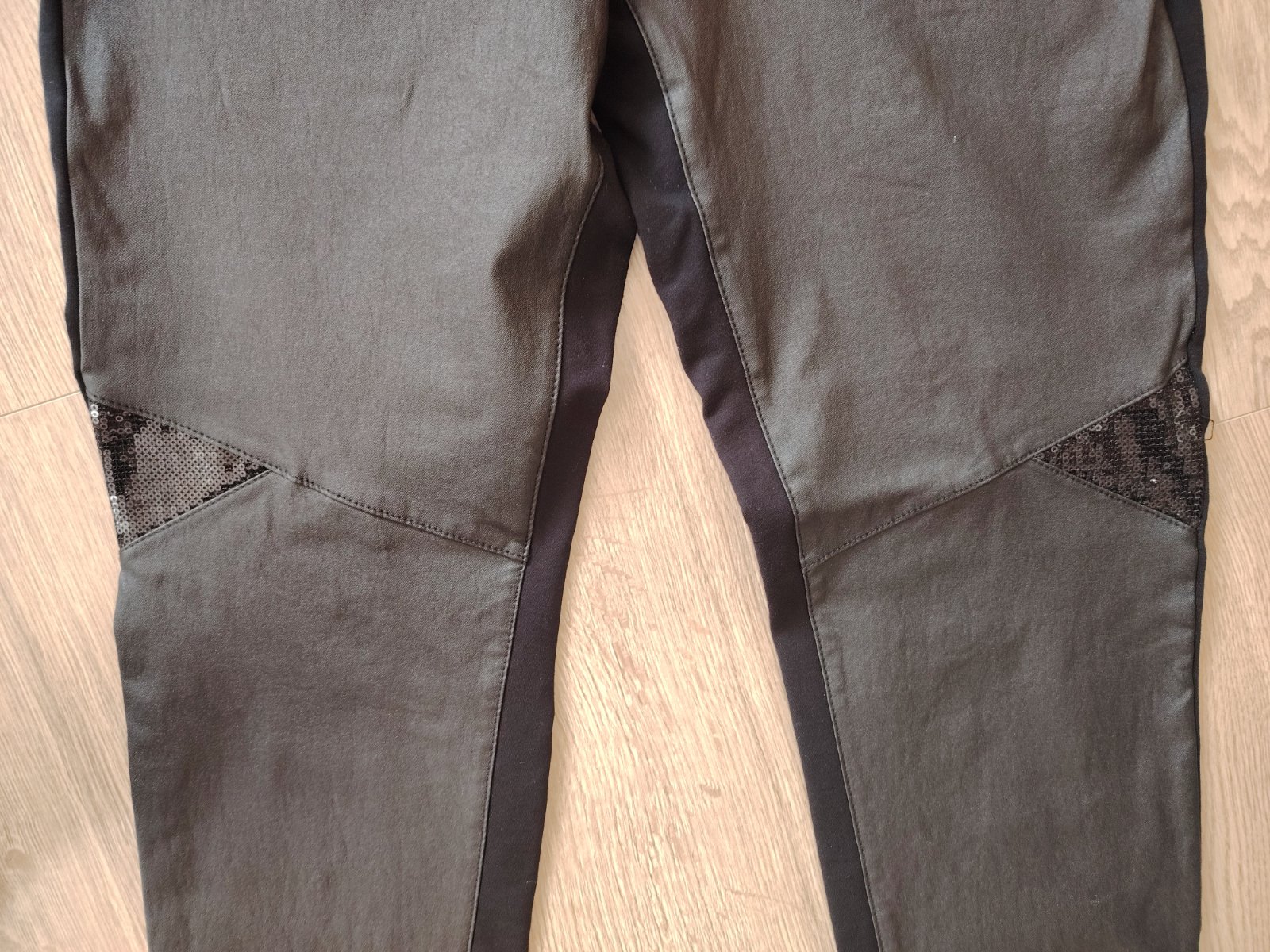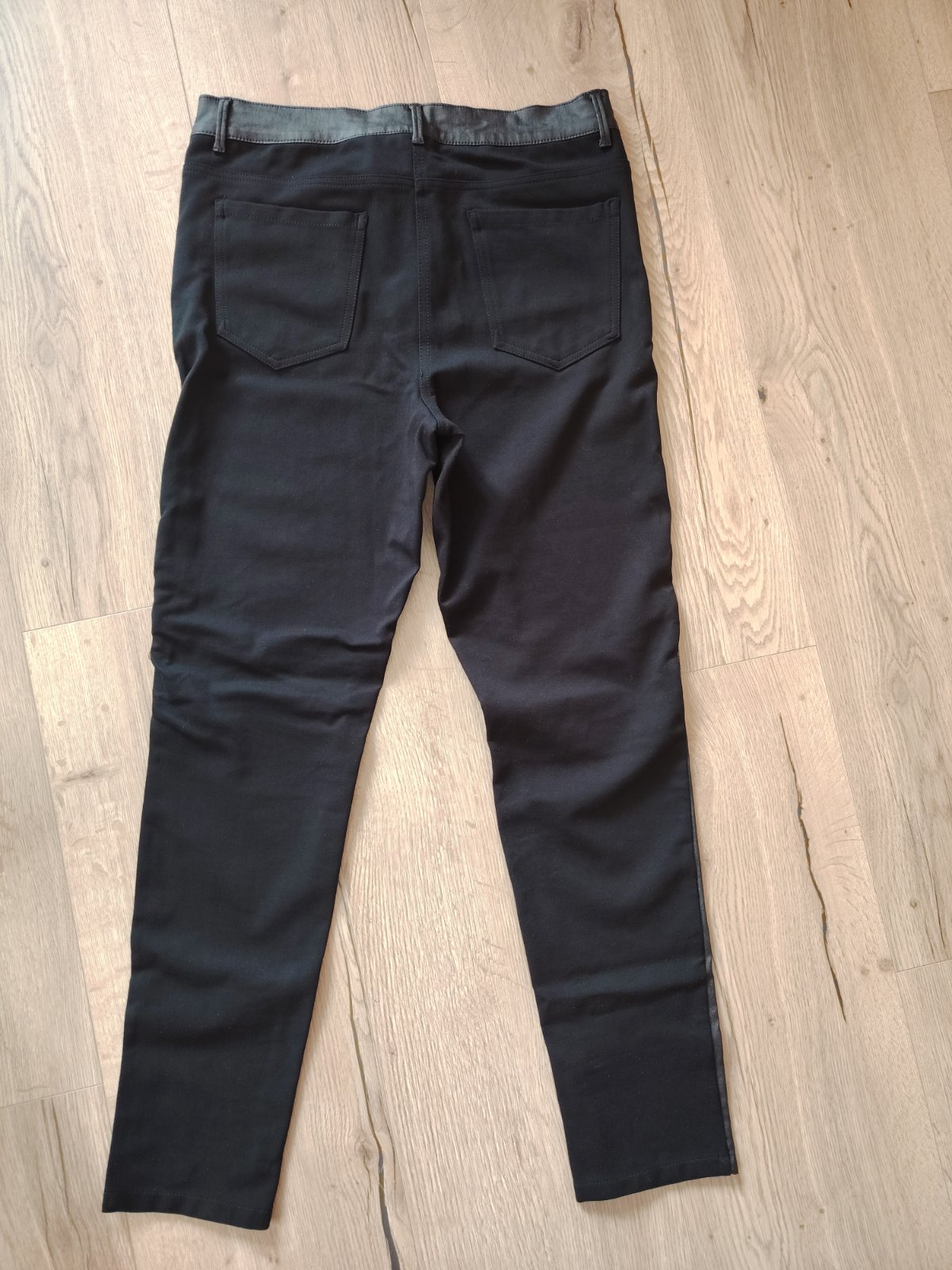 Čierne nohavice, vpredu kožené, vzadu bavlna. Sú príjemné na nosenie a elastické. Sú v používanom, veľmi dobrom stave. Rozmery: pás 43-46cm, dĺžka 104, vnútorná dĺžka 75cm, stehno pri rozkroku 29cm, predný sed 29cm, zadný sed 41cm.
