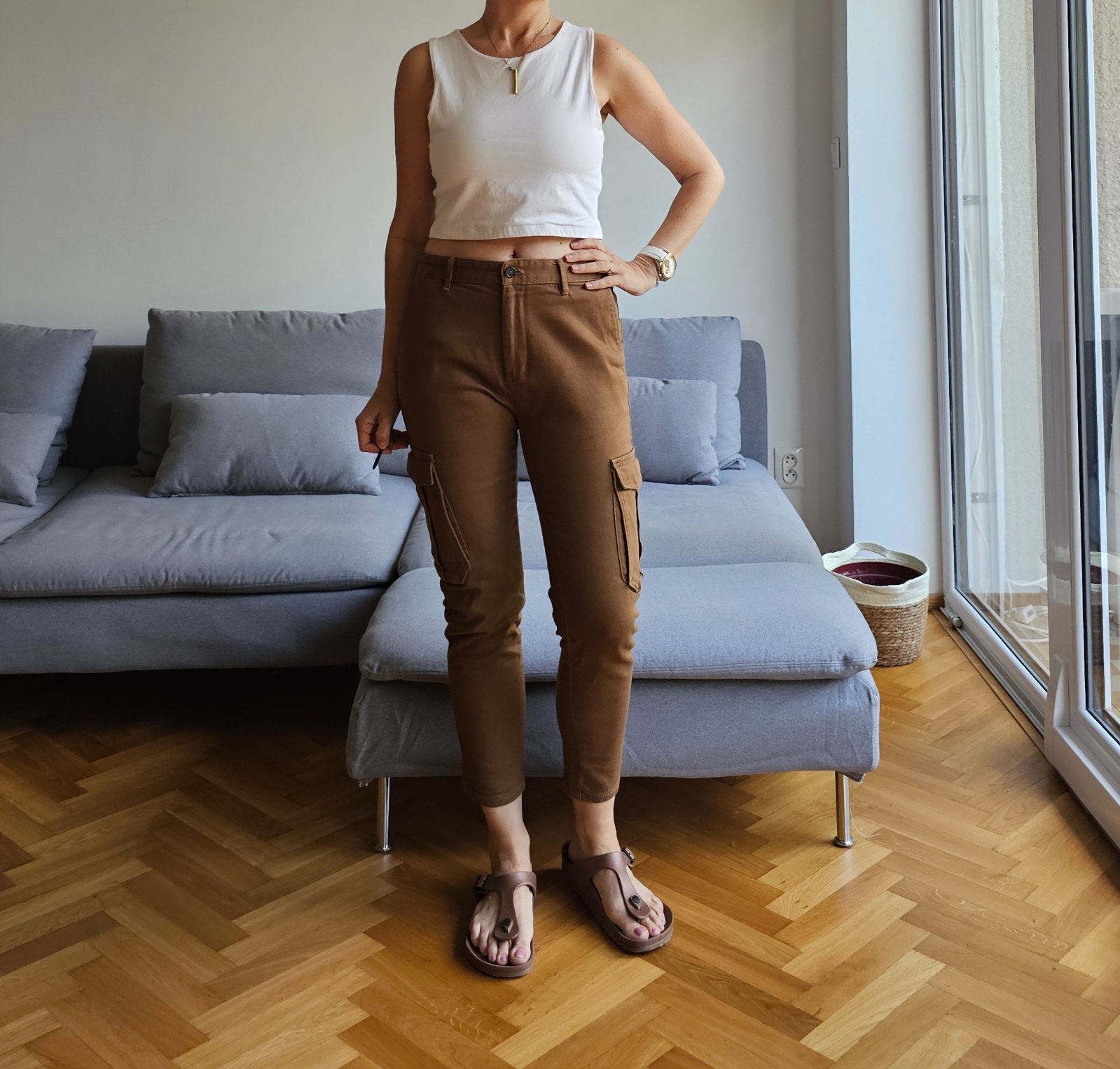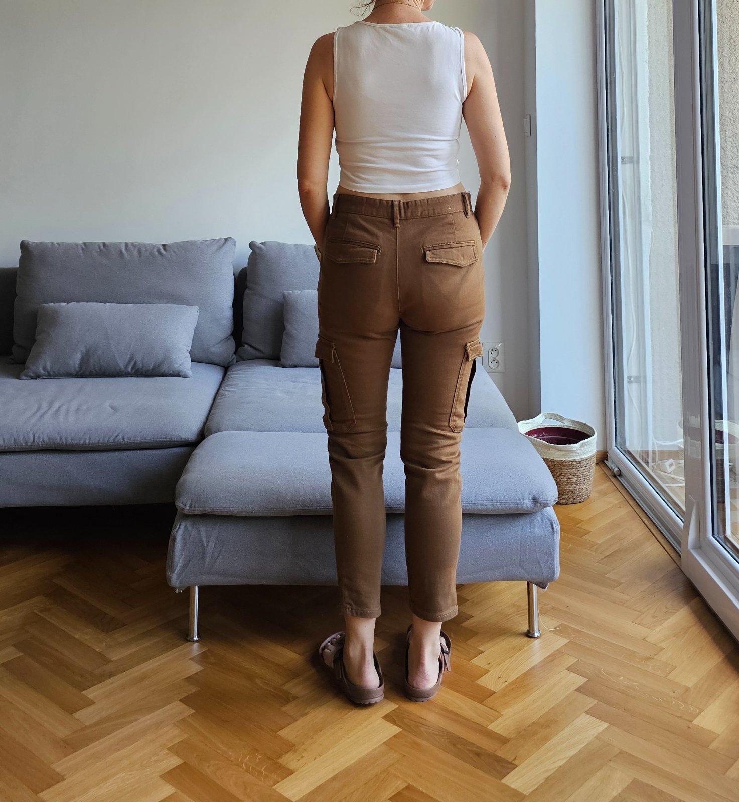 Vysoky pas, farba taká karamelovo hnedá. Bočné vrecká.