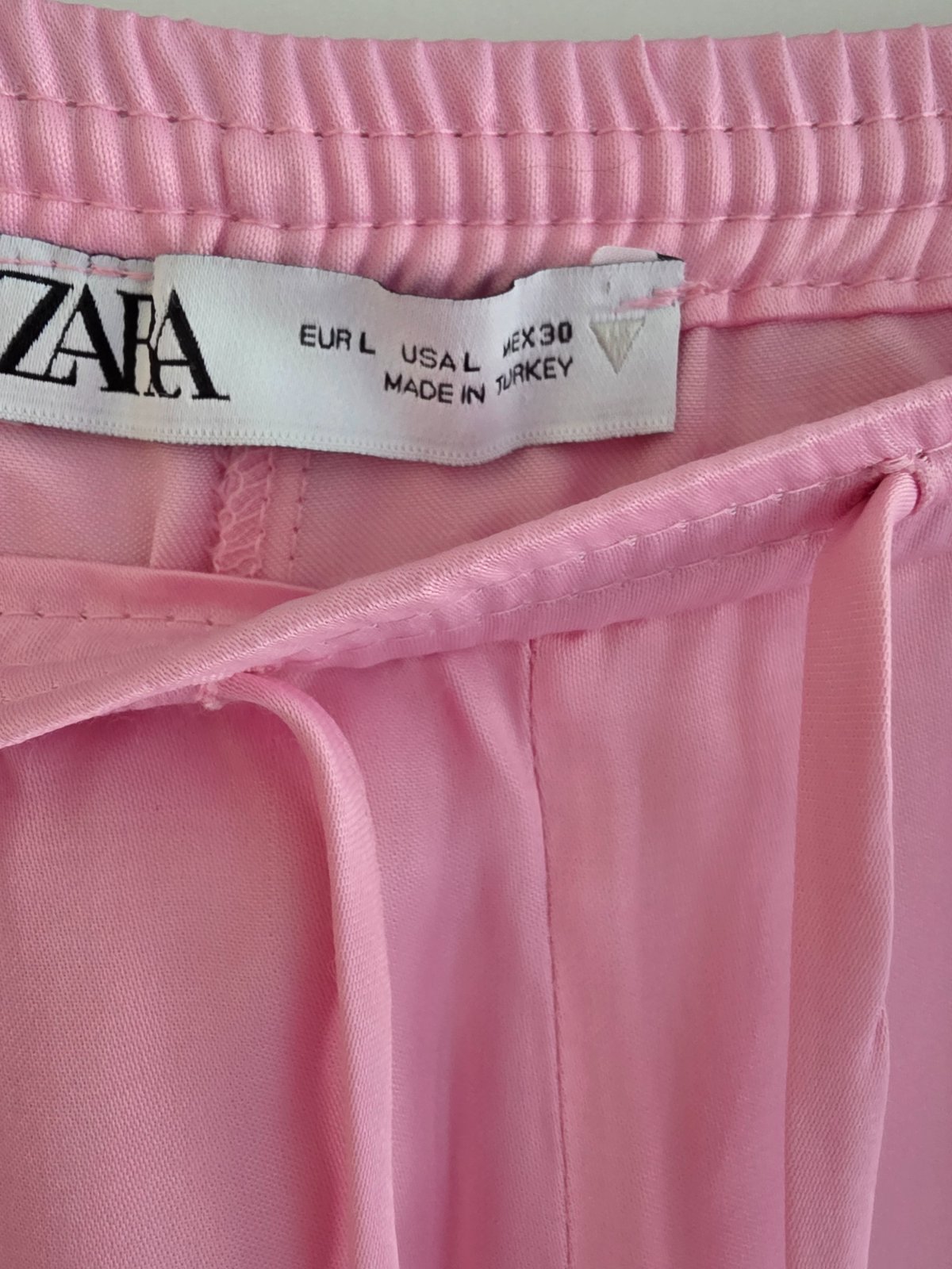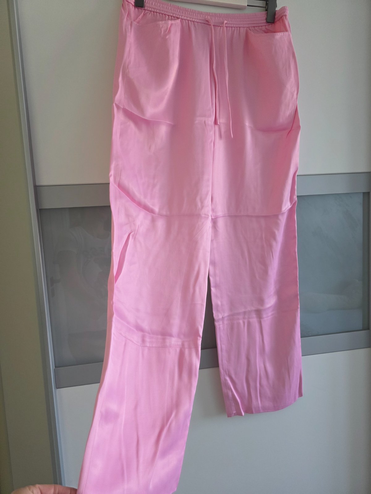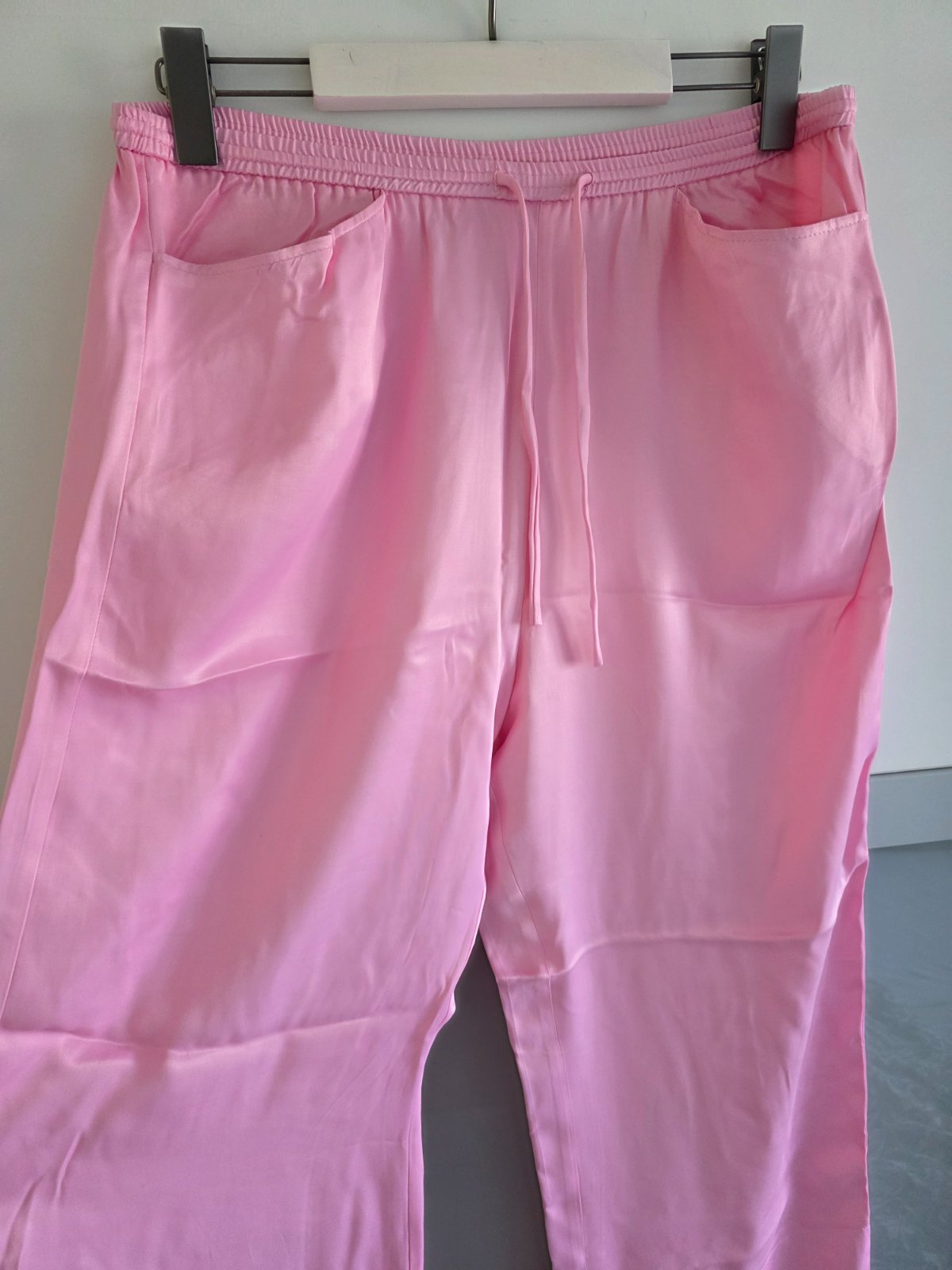 Široké ležérne nohavice so saténovým odleskom. Pás do gumy, bočné a zadné vrecká. Top stav.