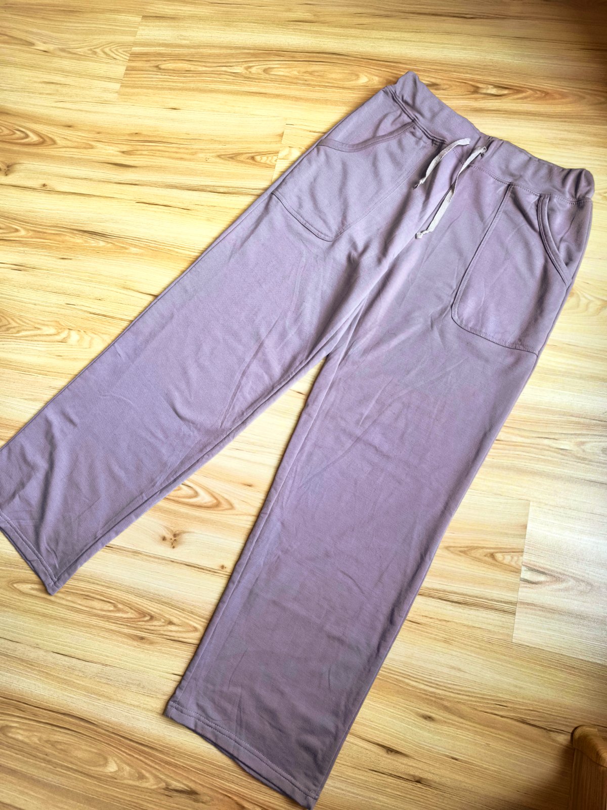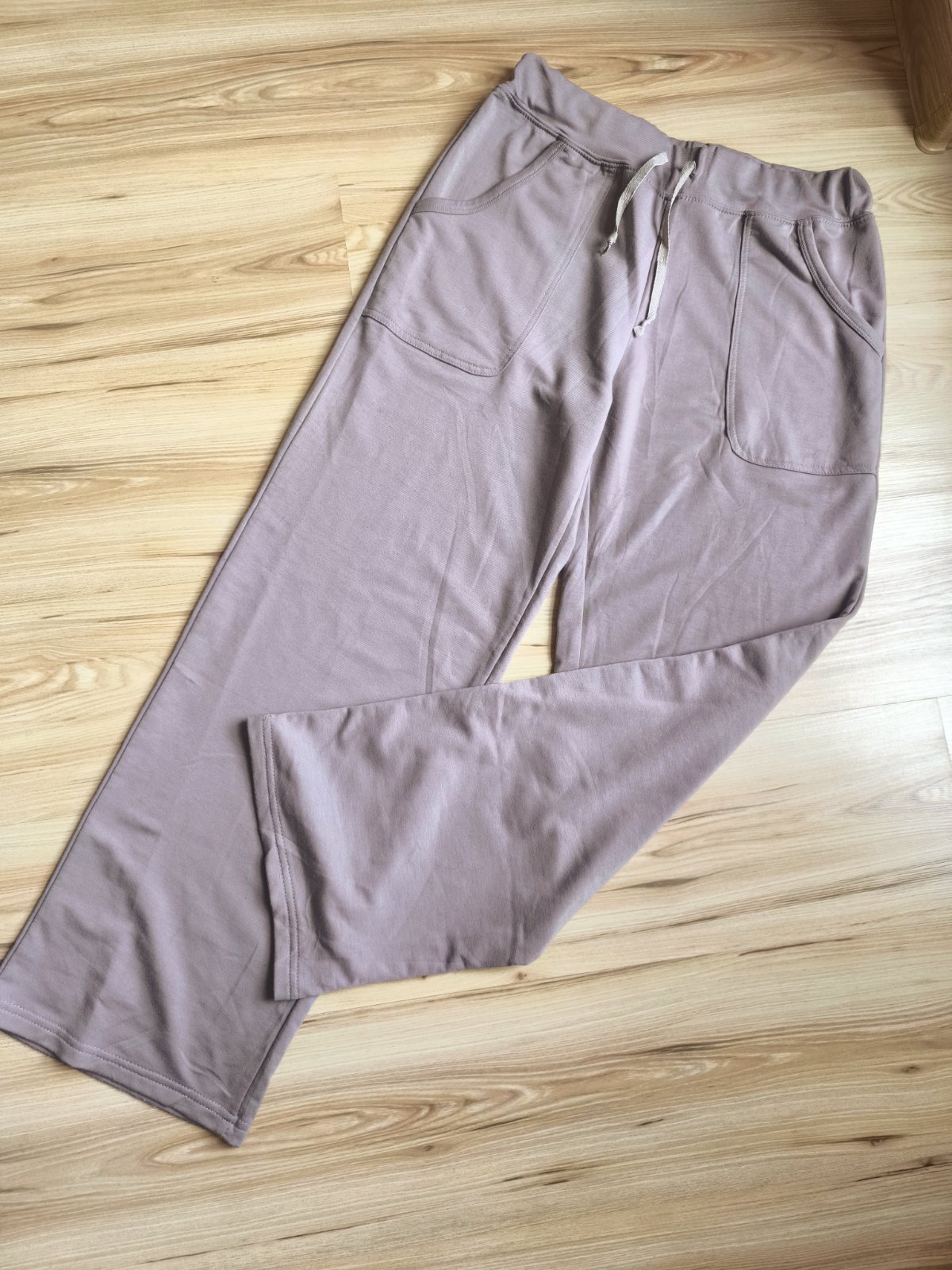 Farba je šedo-hnedá, párkrát oblečené, pohodlné. Šírka v páse 39-49 cm na gumu, dĺžka celková 102 cm, dlzka od rozkroku 75 cm.