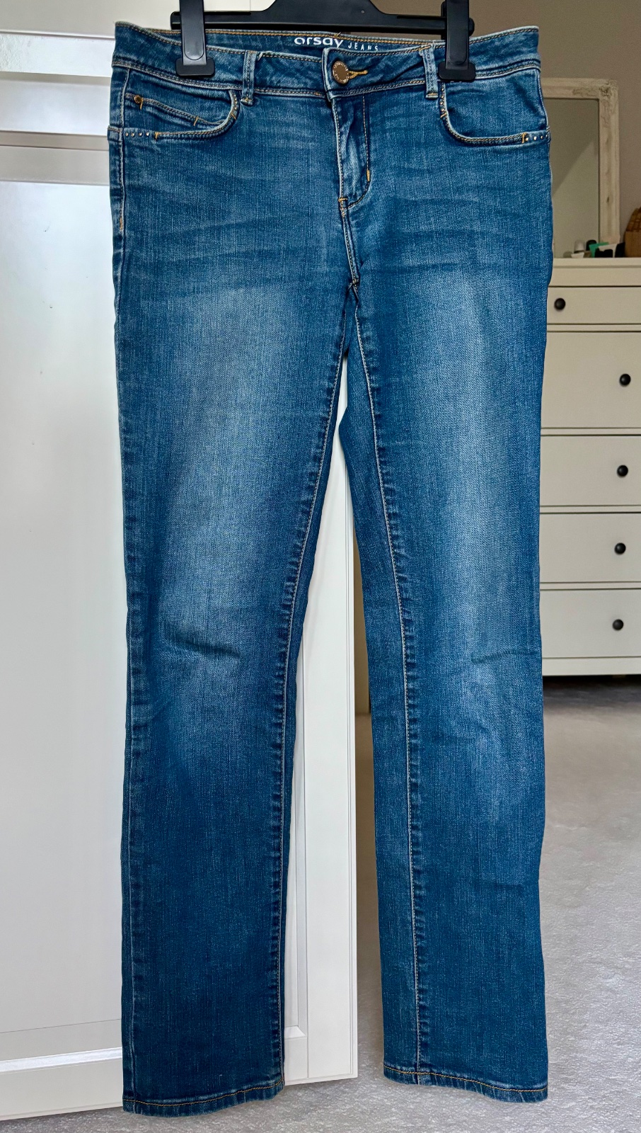 Je to skôr mäkká riflovina, trochu elastická, vonkaj. dĺžka 101 cm, vnút. 80 cm, pás 78 cm, sú mierne bedrové.