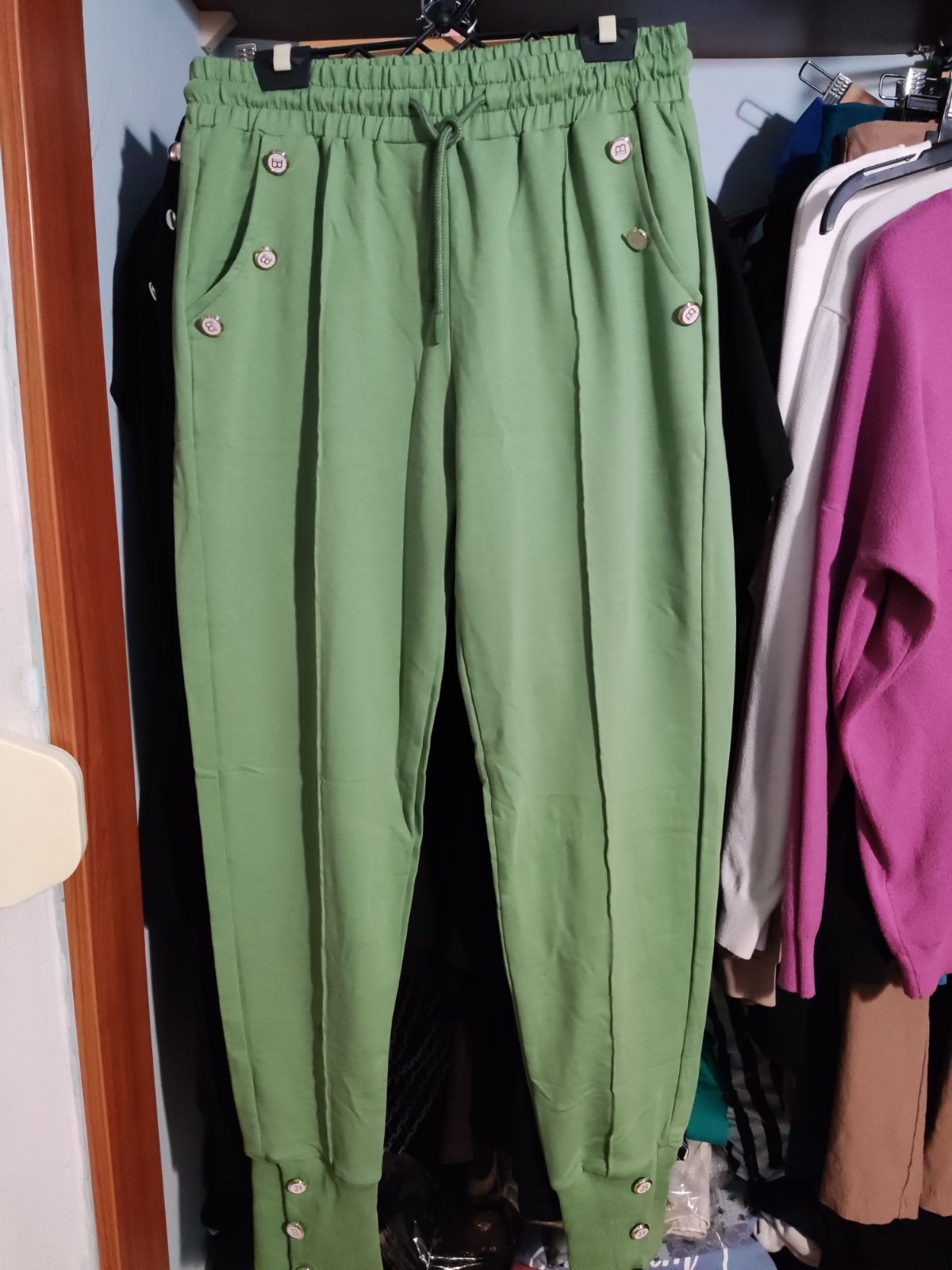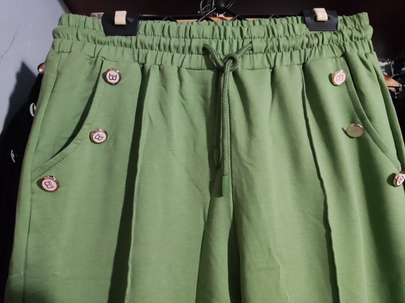 Kvalitné bavlnené tepláky značky Megi, vpredu pukove prešitie, dole patent, ozdobné gombíky.