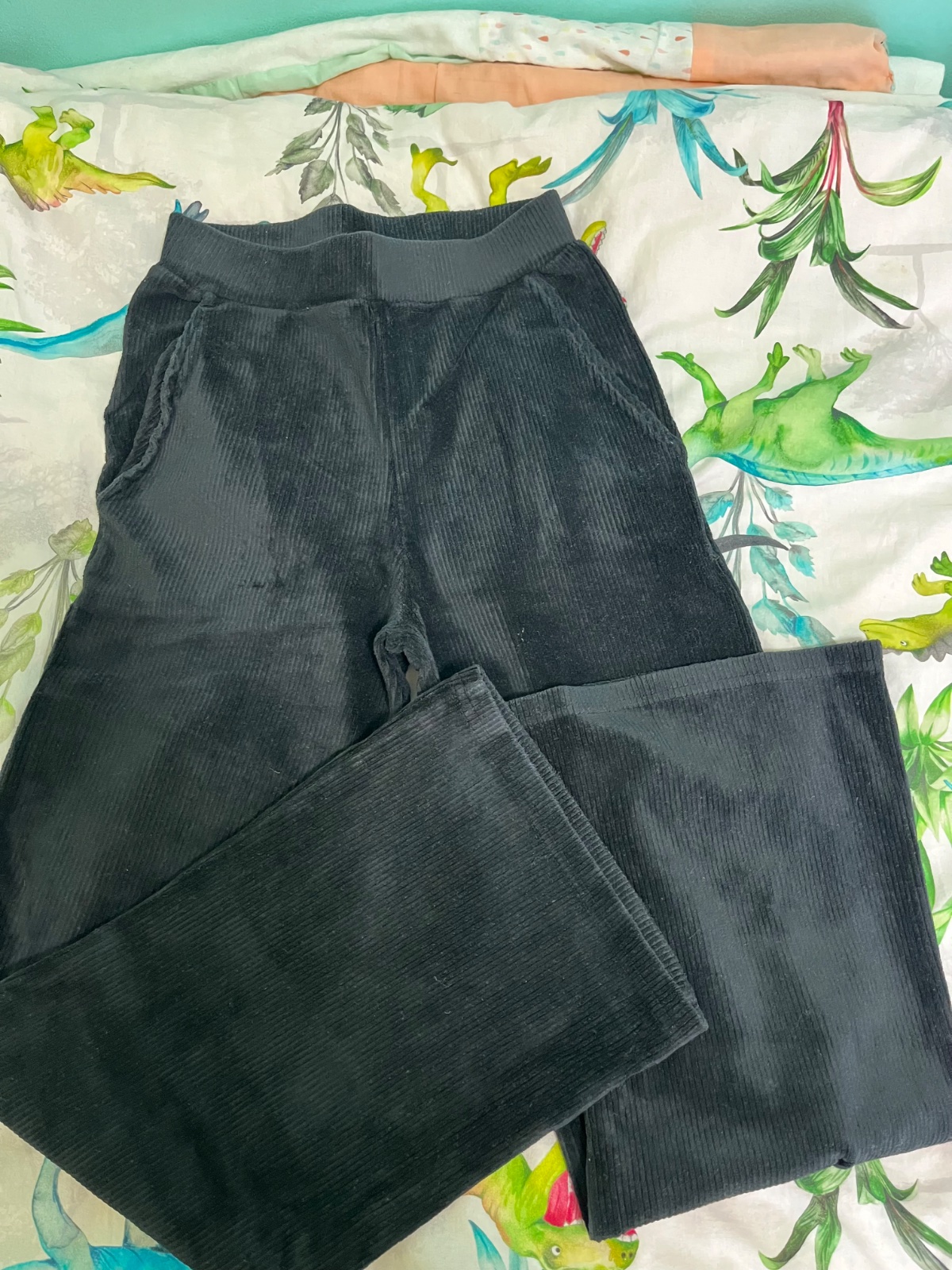 nohavice z imitácie kože, voľné nohavice, zvýšený pás, vzadu aj vpredu vrecká, zapínanie na cvok a zips, v 100% stave, minimum použité, po jednom dieťati, kúpené nové rozmery: pás-32 cm/nastaviteľ...