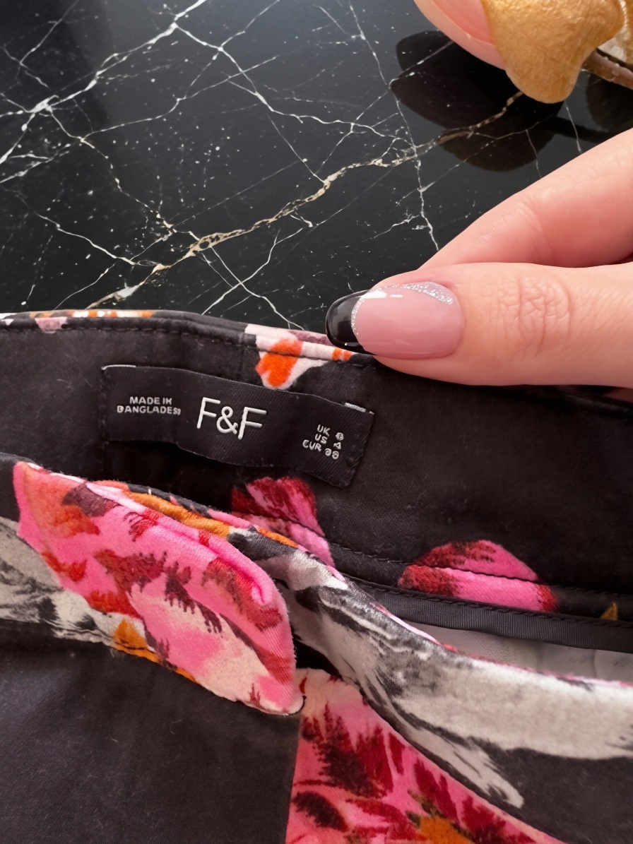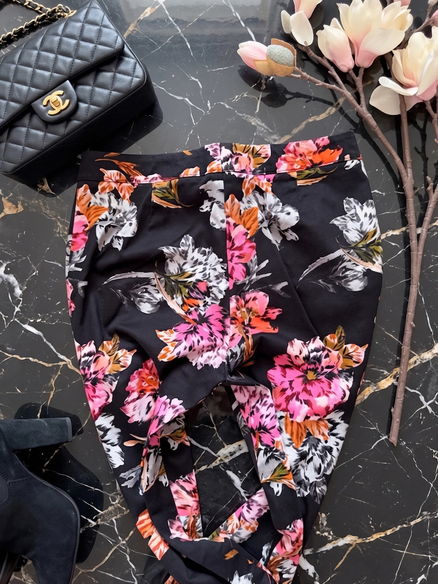 Elegantné čierne nohavice s kvetmi, top stav, nosené pár x do práce bez jedinej chybičky, sedia pekne, vyšší pás, k blúzke alebo tielku, odporúčam.