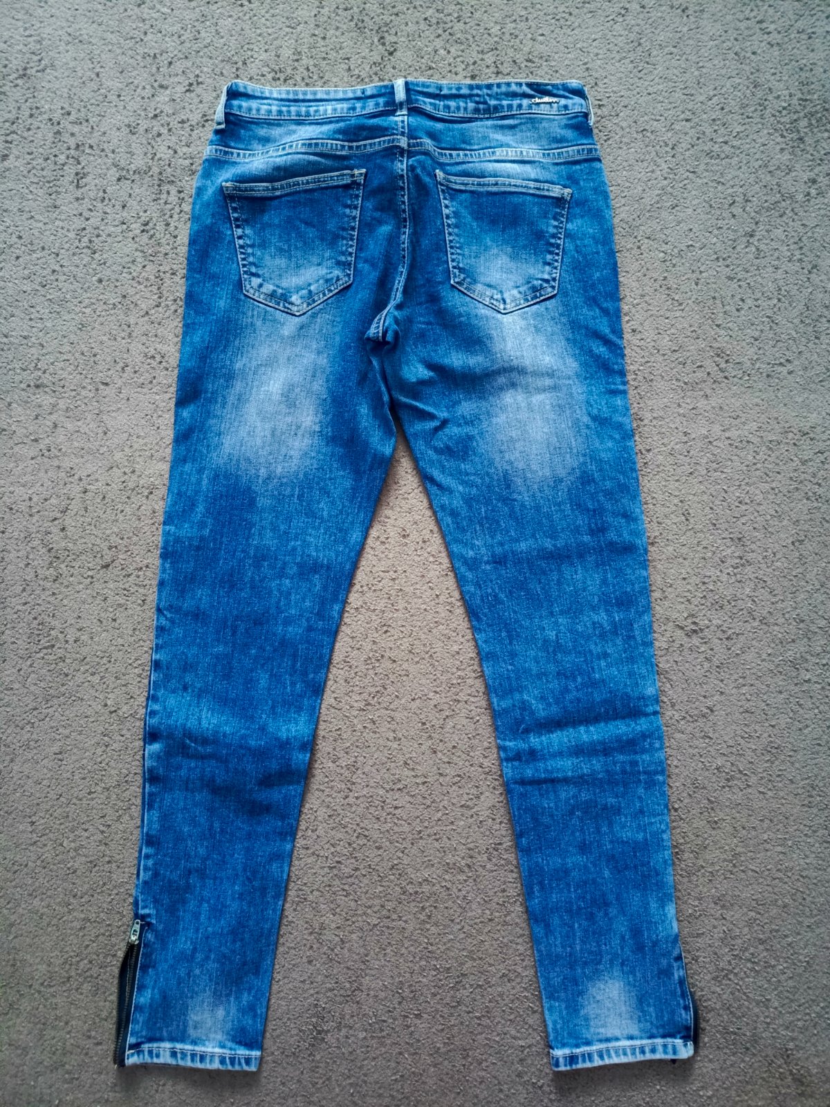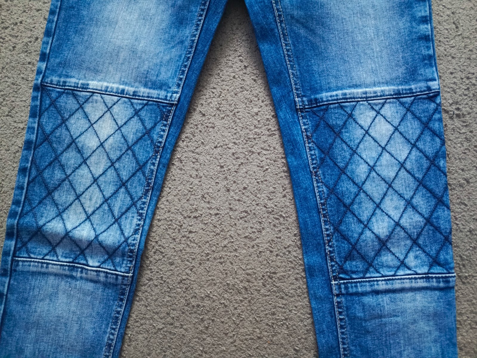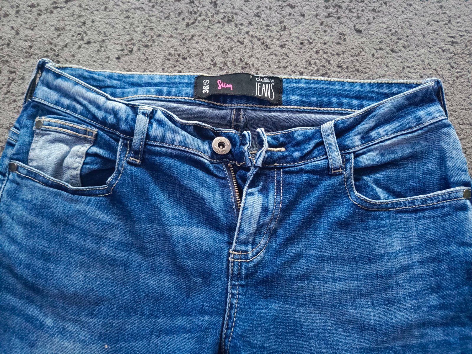 Nenosene rifle na nižšiu postavu rovného strihu s elastanom. Su velmi pohodlne. Zn. John Baner objednane v Bonprixe. Dl. 97 cm, od rozkroku 74 cm, pas je znížený 74-75 cm.