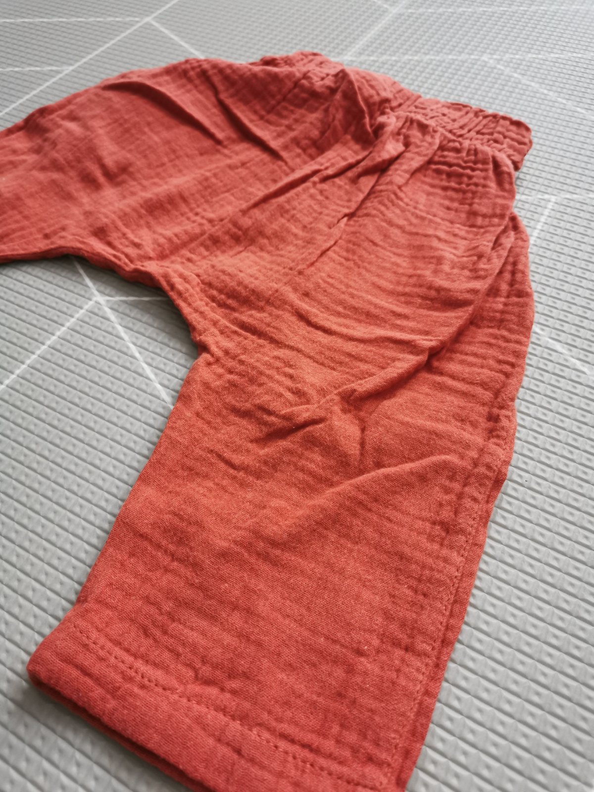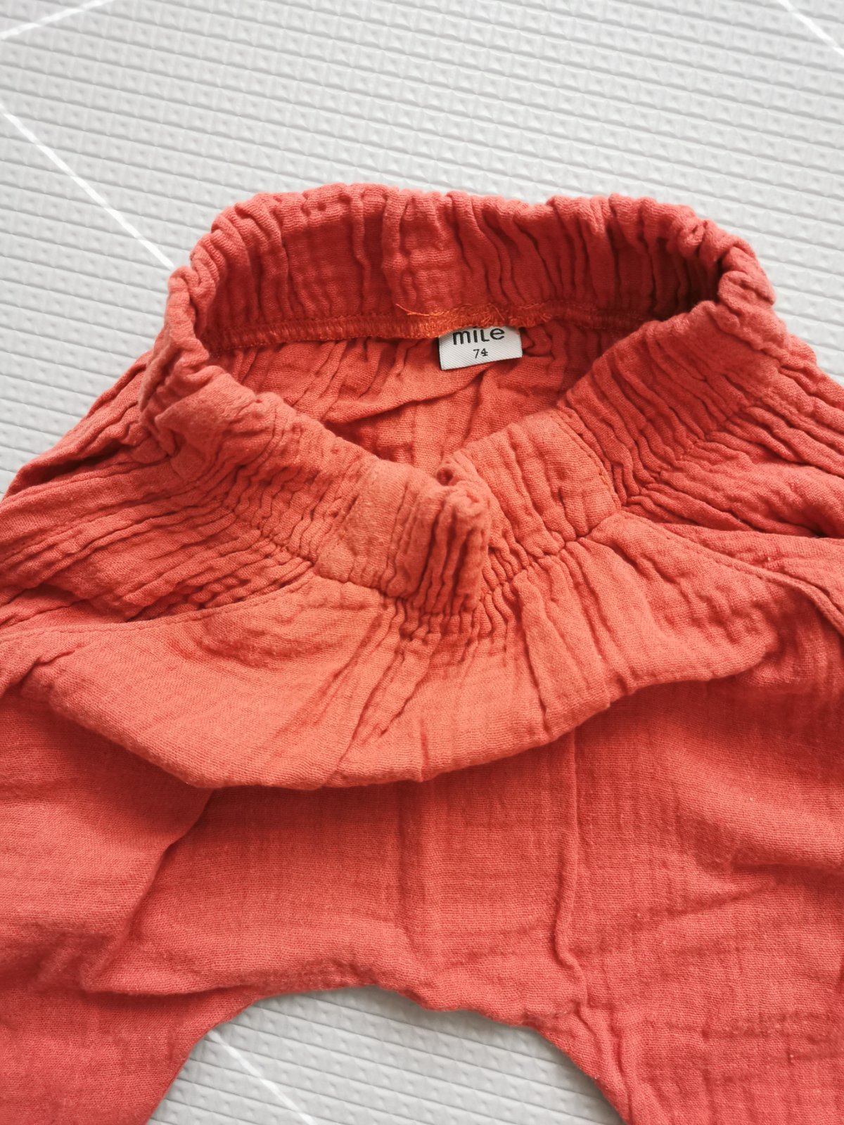 Vzdušné letné gate z bavlneného mušelínu. Praktický strih s variabilnou dĺžkou a mäkkou gumou v páse.