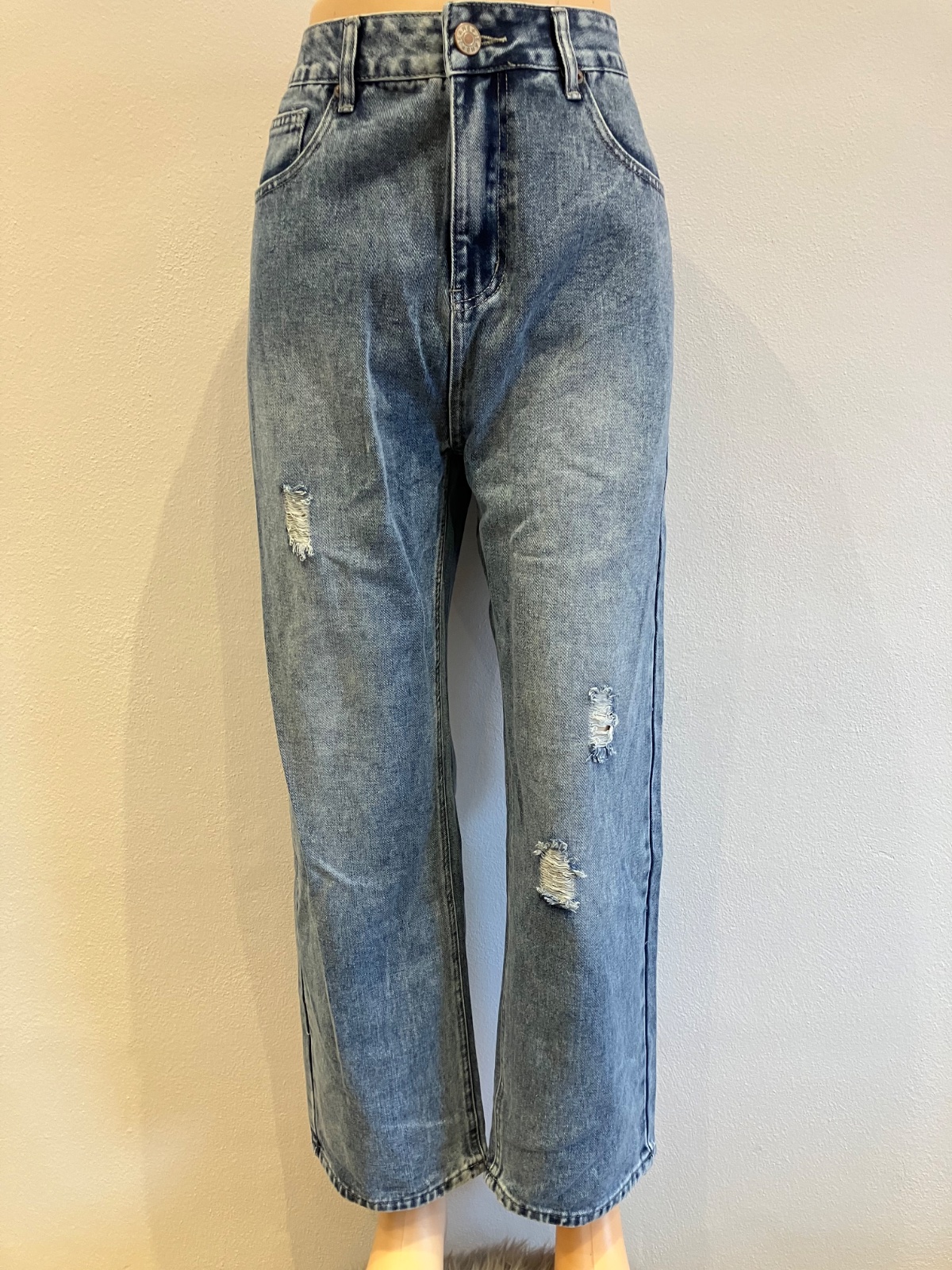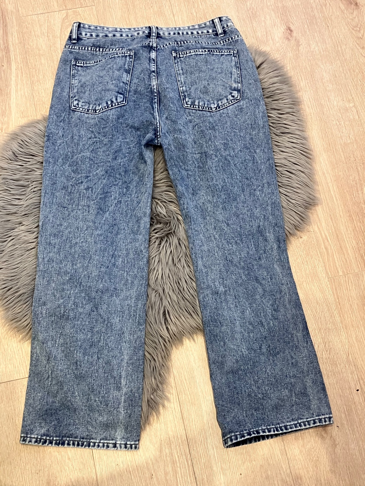 Pánske džínsy, roztrhané, nie sú elastické, zapínanie na gombík a na zips, pútka na opasok. Veľkosť cca L.