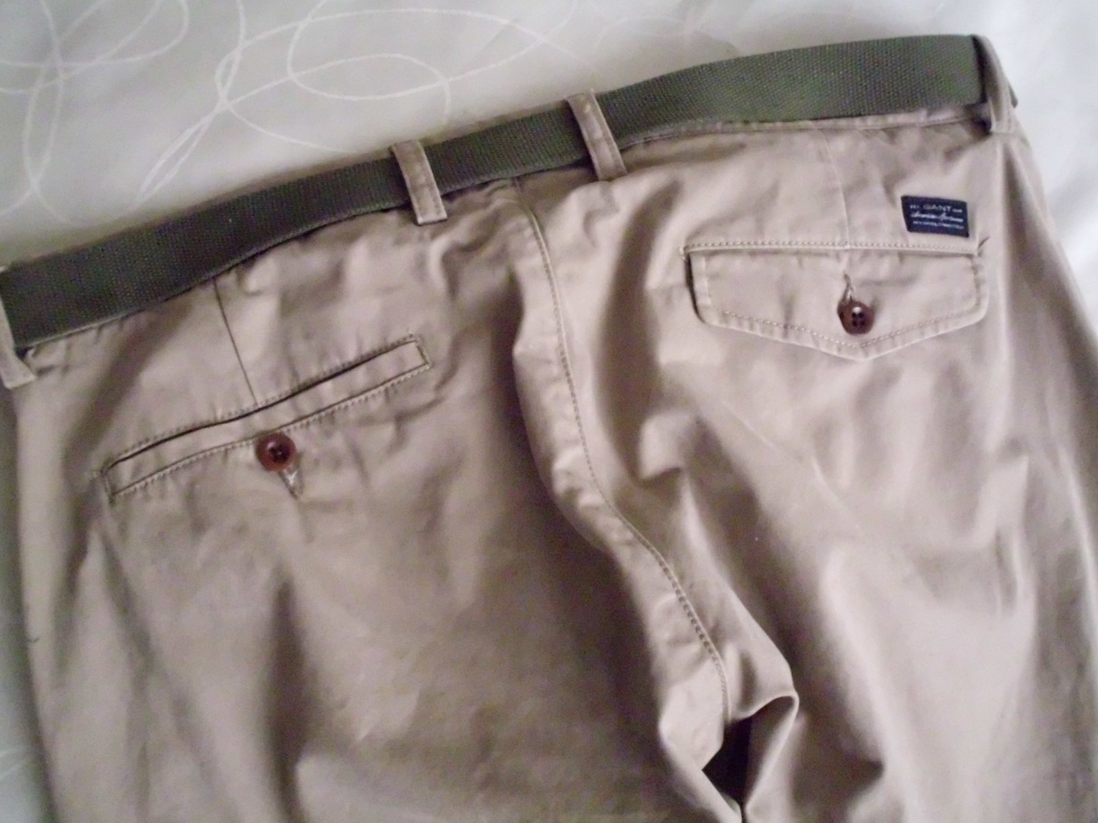 Predám pánske chino nohavice Gant vel. XL-L 36/36 , pás 50 cm, predný sed 25 cm, zadný 42 cm, stehno 30 cm, celková dĺžka 115 cm, spodok 19 cm, 5 vreciek, príjemná bavlna látka, béžová farba, 2x oblečené, top 100% stav