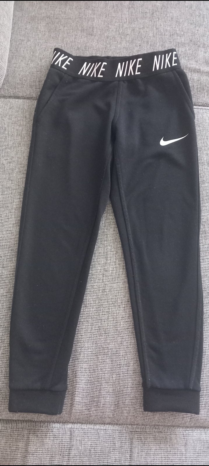 Tepláky nike veľkosť 128 - 137 cm, 8- 10 rokov. Bez poškodení. V páse gumička a šnúrka. Pás je vyšší, dá sa zhrnúť. Čierne. Rozmer: bočná dlžka 76 cm ( + výška pásu 9 cm), pás v kľude 29x2 cm. Dole...