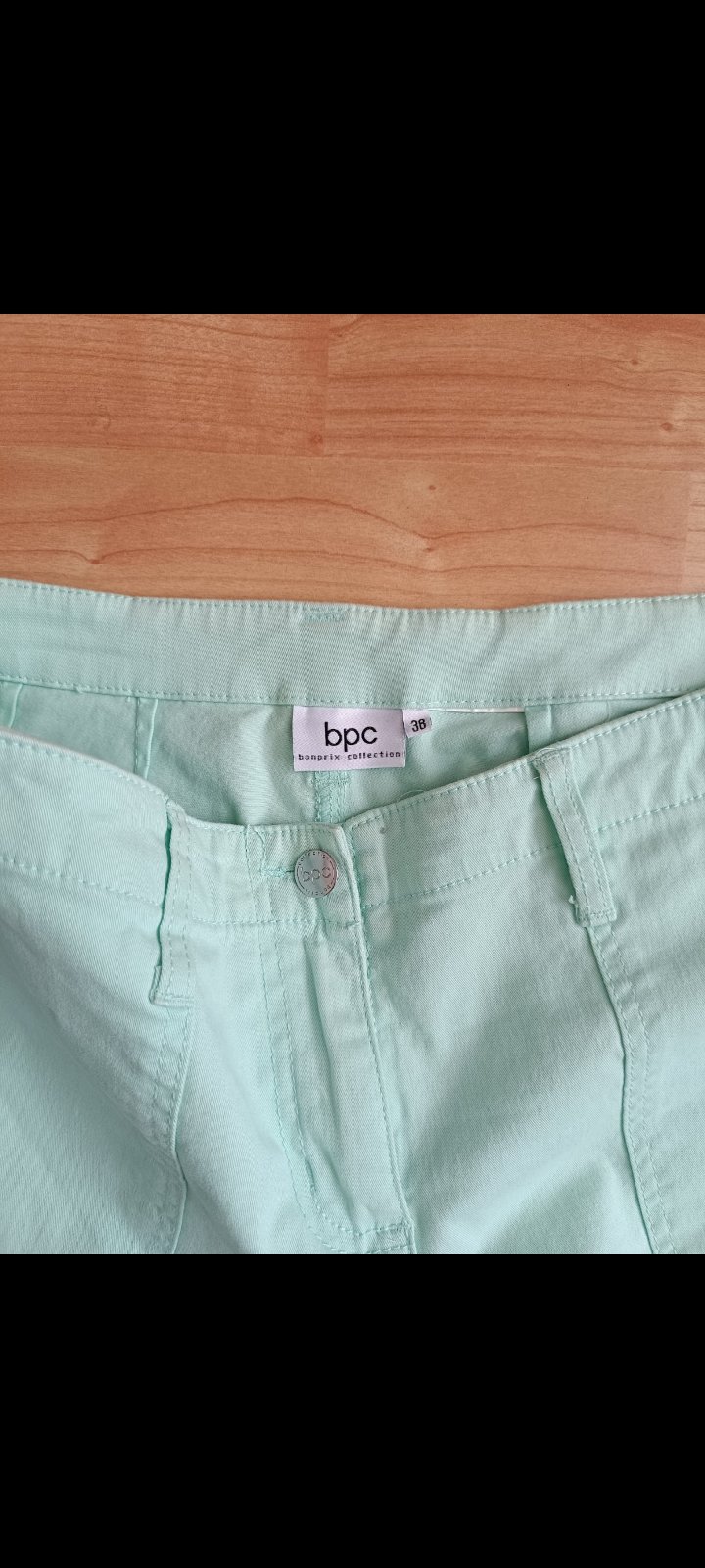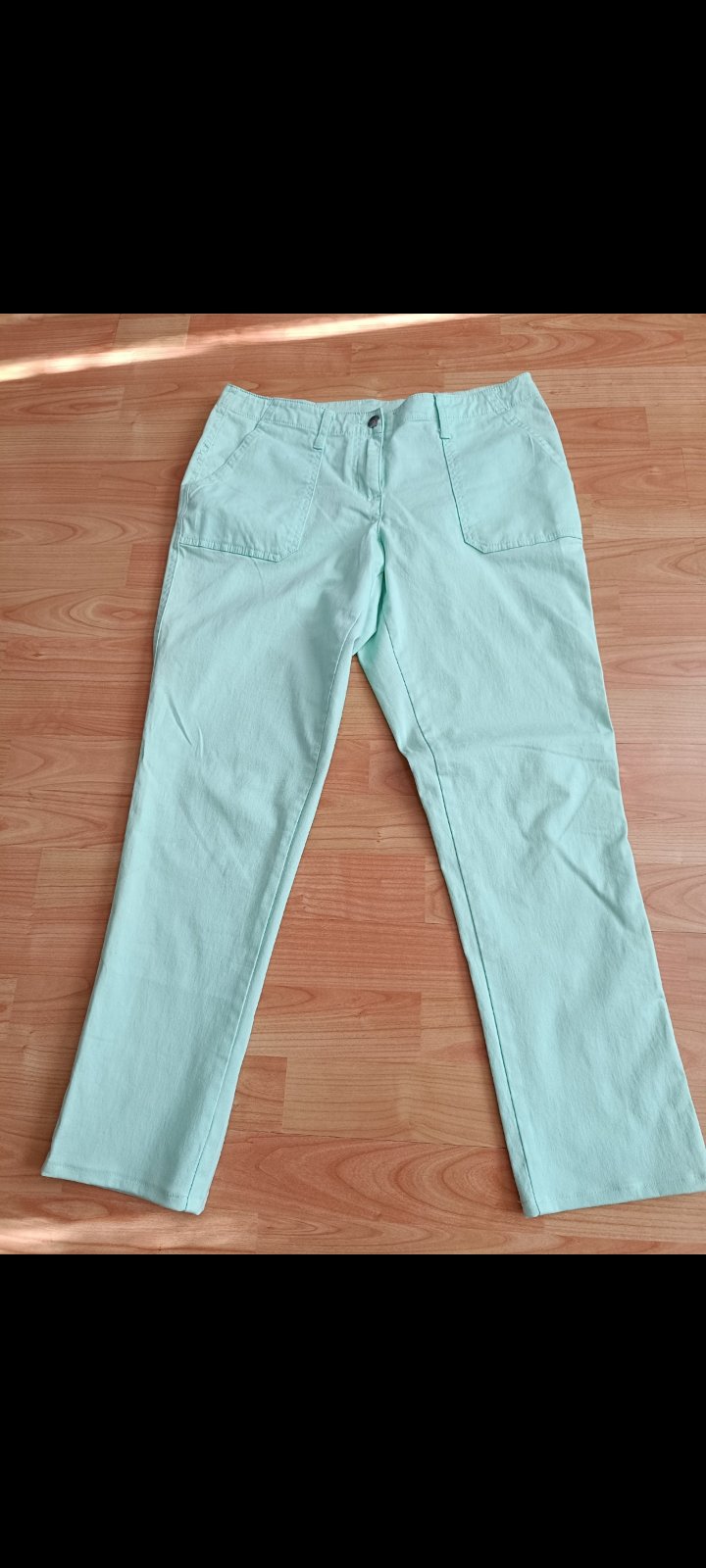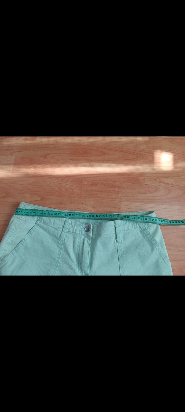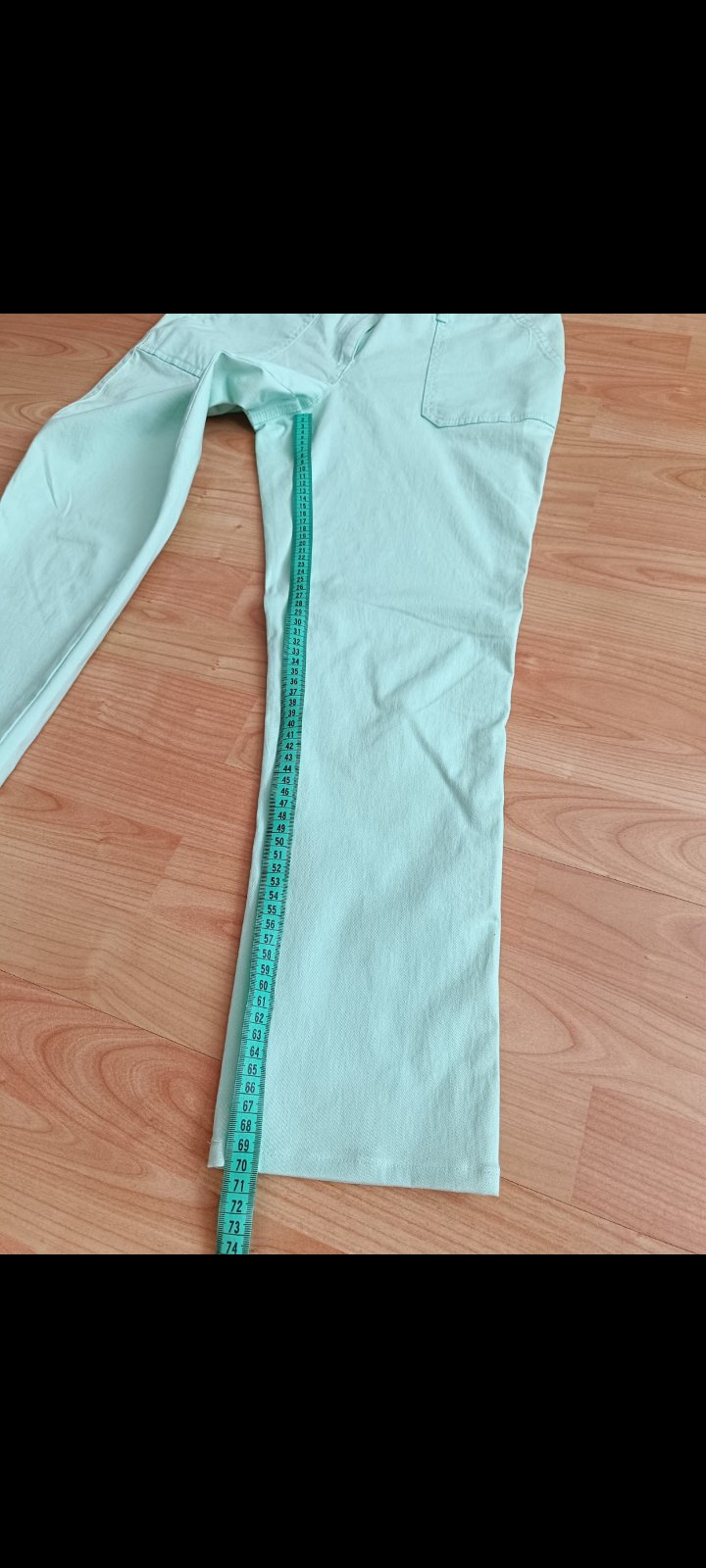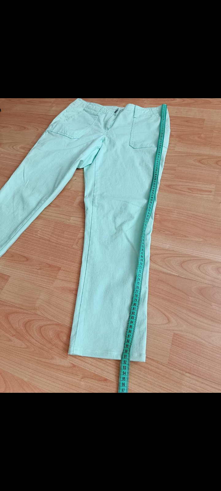 Nohavice na štýl riflí v jasnej mätovej farbe ako stvorené na leto. Obvod v páse majú vďaka ich elastickosti cca 84-92 cm, postranná dĺžka 94 cm, od pudla 74 cm. Veľkosť 38/40.