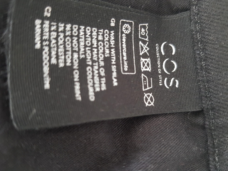 džínsy zn. COS , farba čierna, zlozenie materialu je výborné, obsahuje bavlnu, polyester, elastan. Su pocitovo veľmi príjemné. Pás rozmery 42 x 2 cm, dĺžka 105 cm .