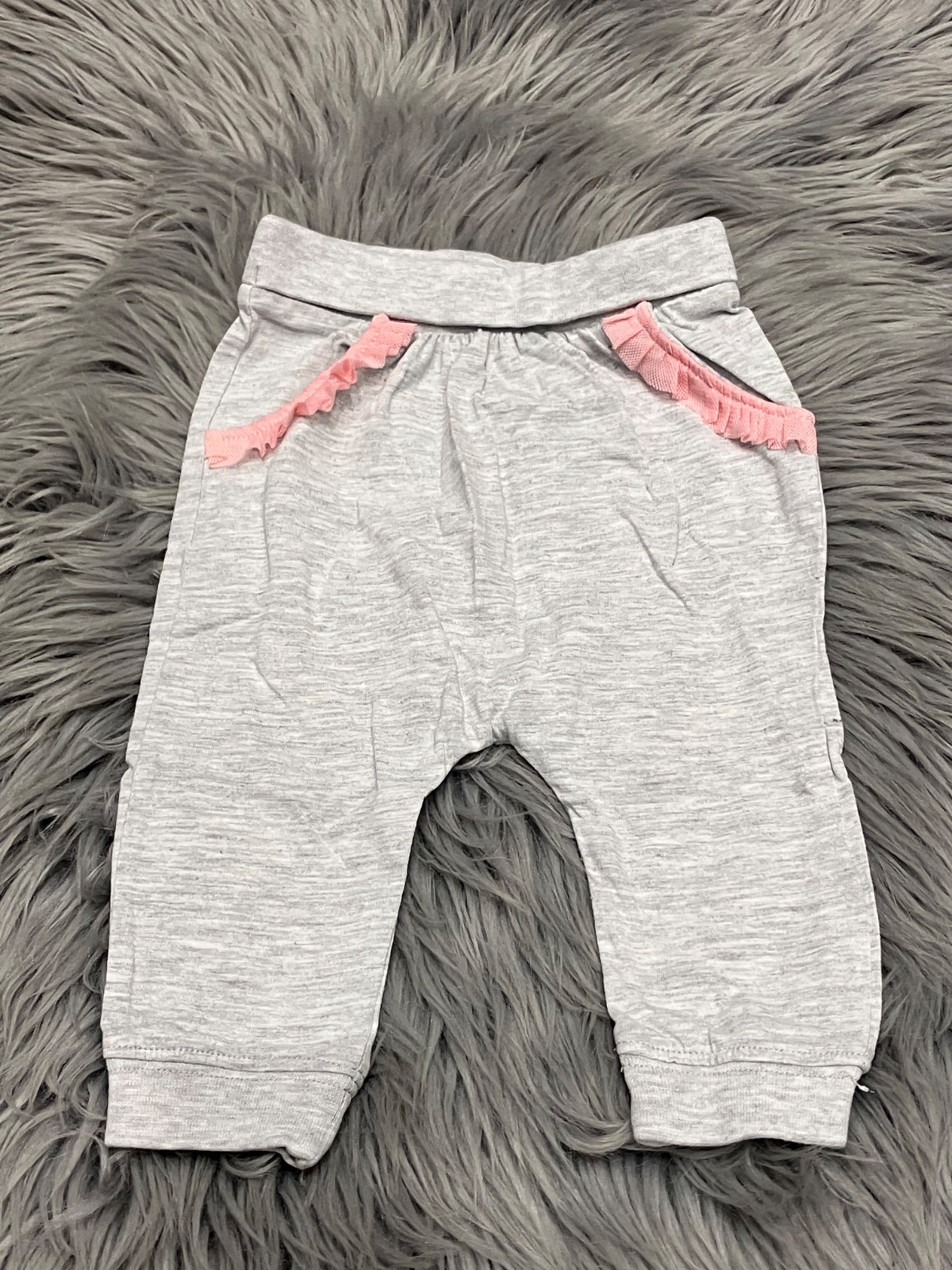 Dievčenské tepláky, dve bočné vrecká s fodričkami, tenké, elastické, melírované, veľkosť cca 68.