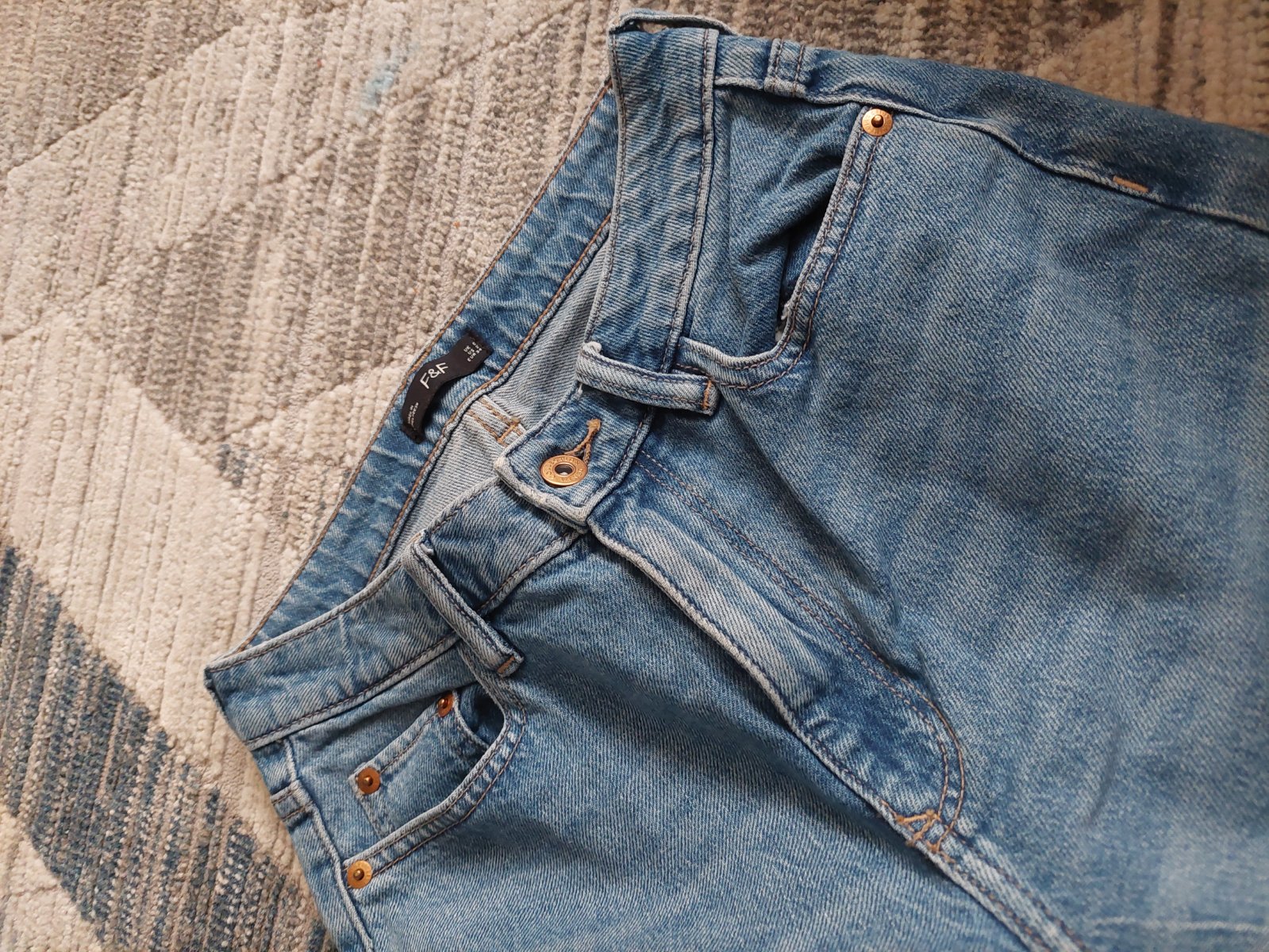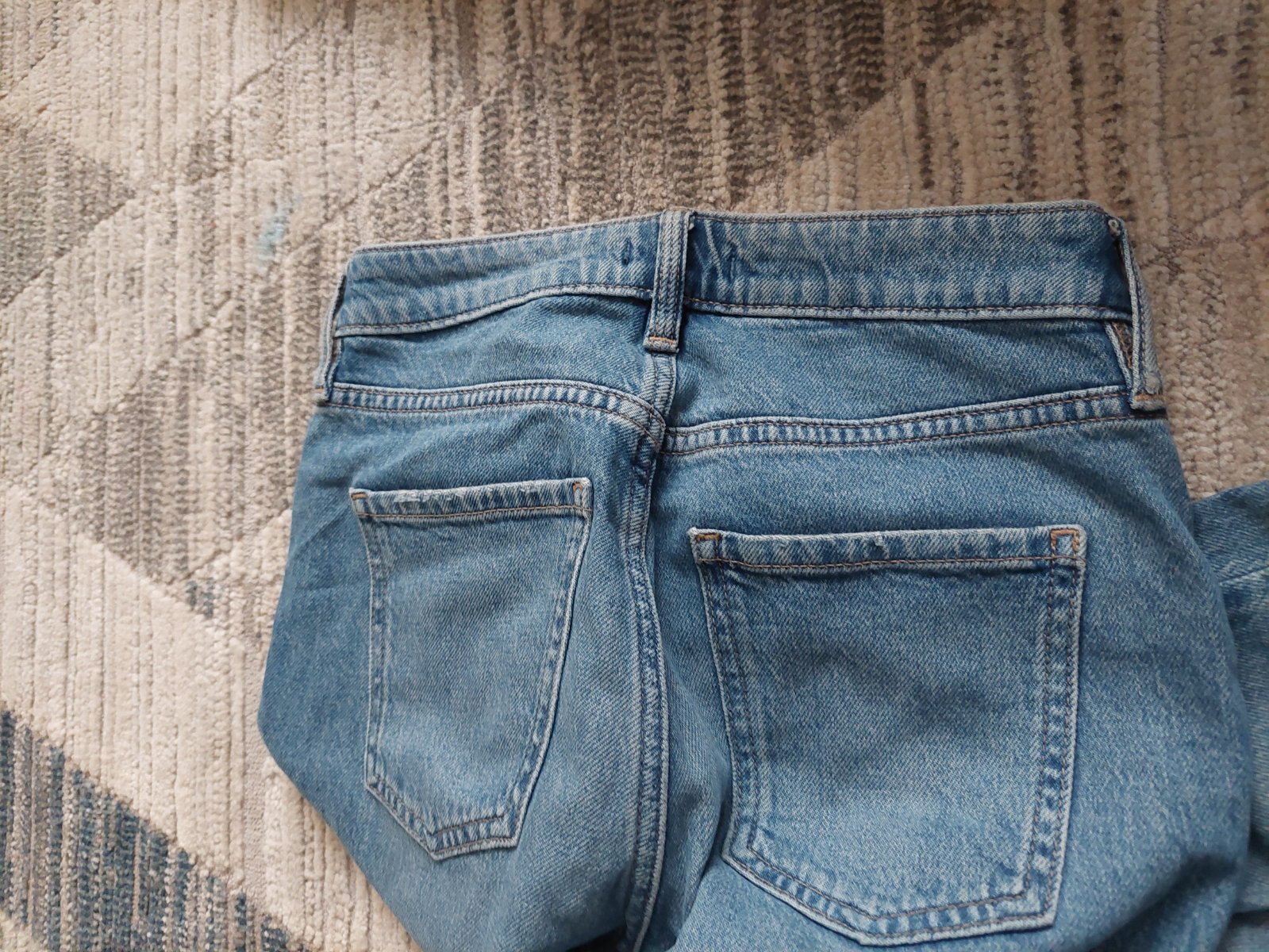 Rifle,raz oblečene Rozmery: Pás 68 cm Predný sed 26,5 cm Zadný sed 33 cm Boky 84 cm Stehno 47 cm Dĺžka 95 cm Dolná šírka nohavice 25 cm