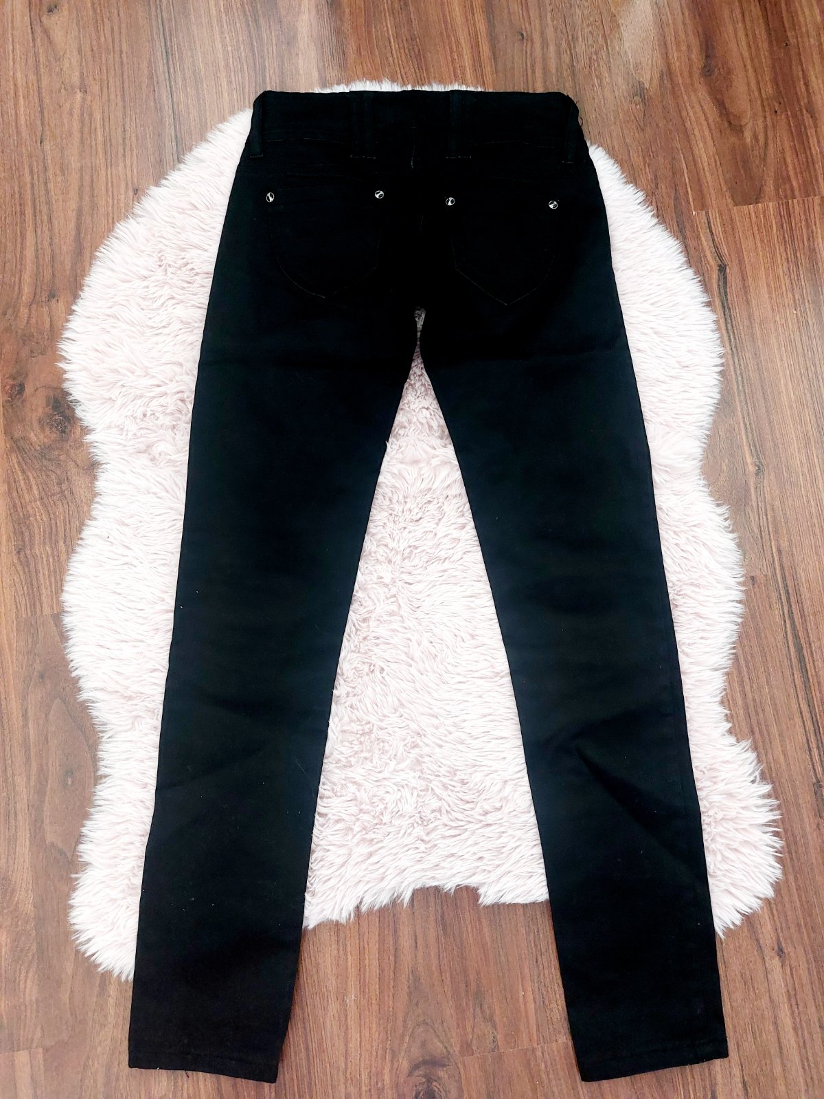 Nosené, ale sú ako nové. Pevný materiál. Pás 39 cm - 49 cm po natiahnutí, boky 48 cm, stehno 26 cm, dĺžka 101 cm, vnútorná 80 cm :) Sú naozaj veeľmi pekné!