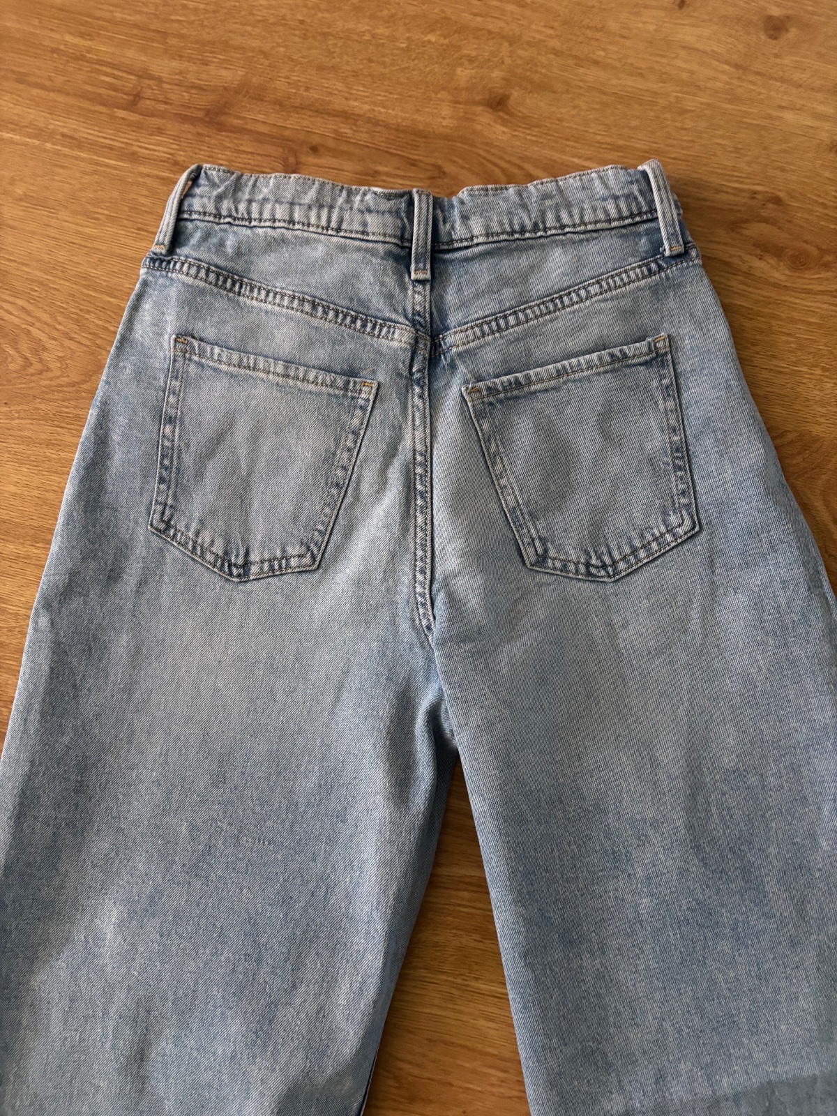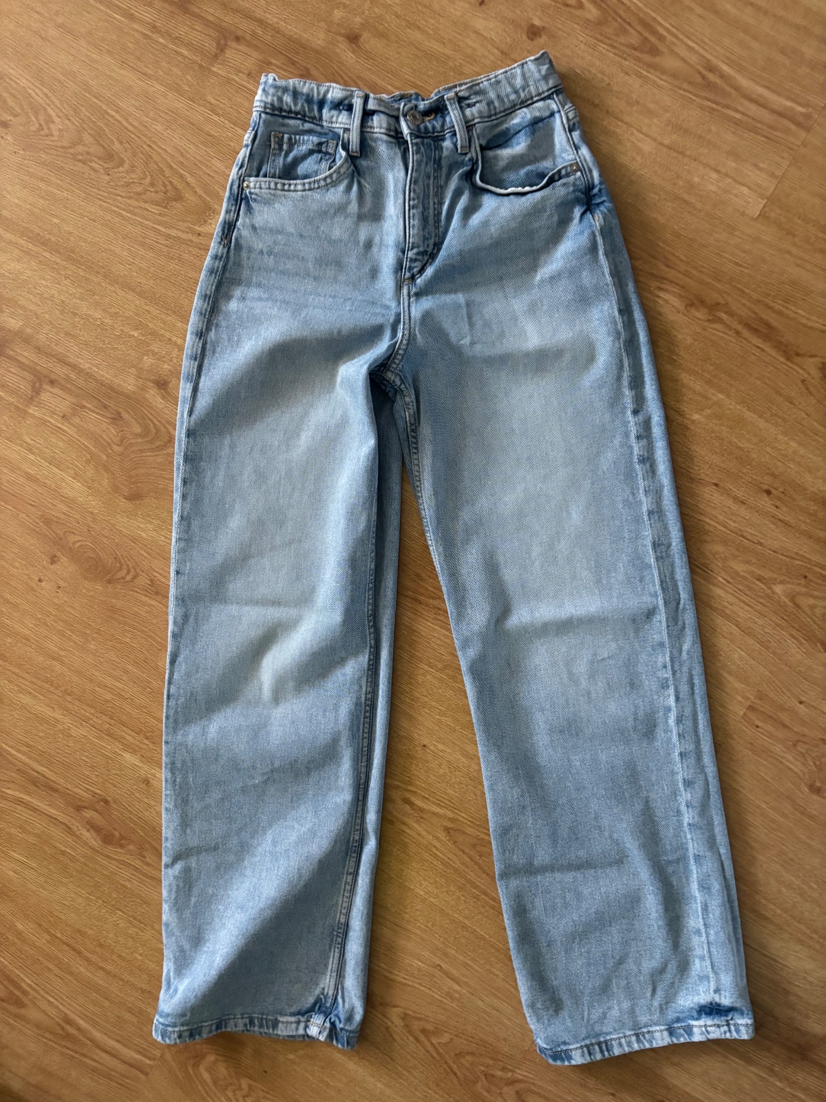 Bledomodré džínsy, široký strih, pás je regulovateľný, dĺžka 97cm, pás 30x2 cm
