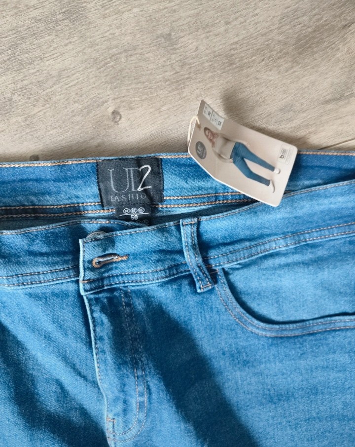 Svetlomodré rifle, veľkosť 50, značka UP 2 fashion, rovný strih, nové, s visačkou.