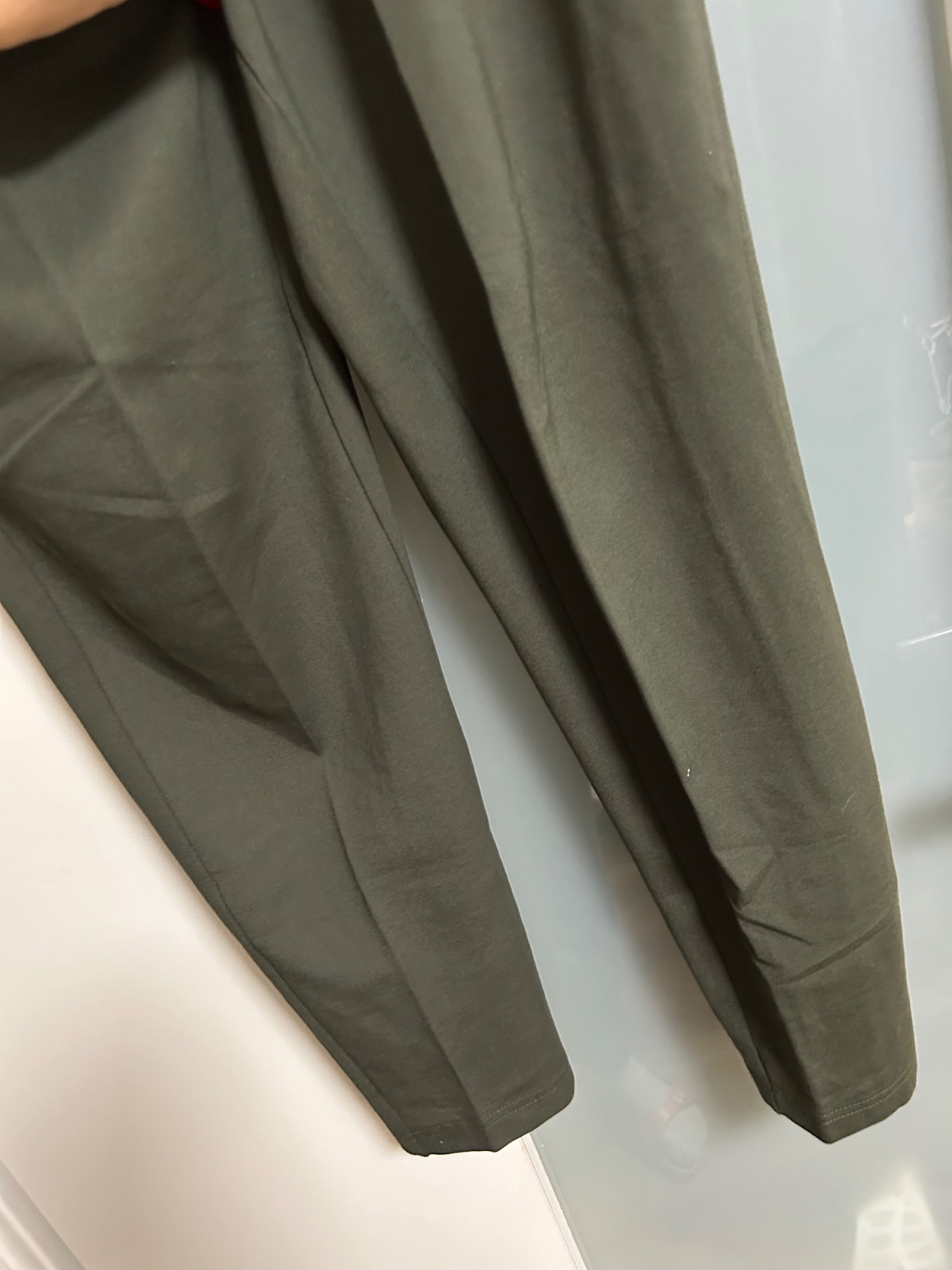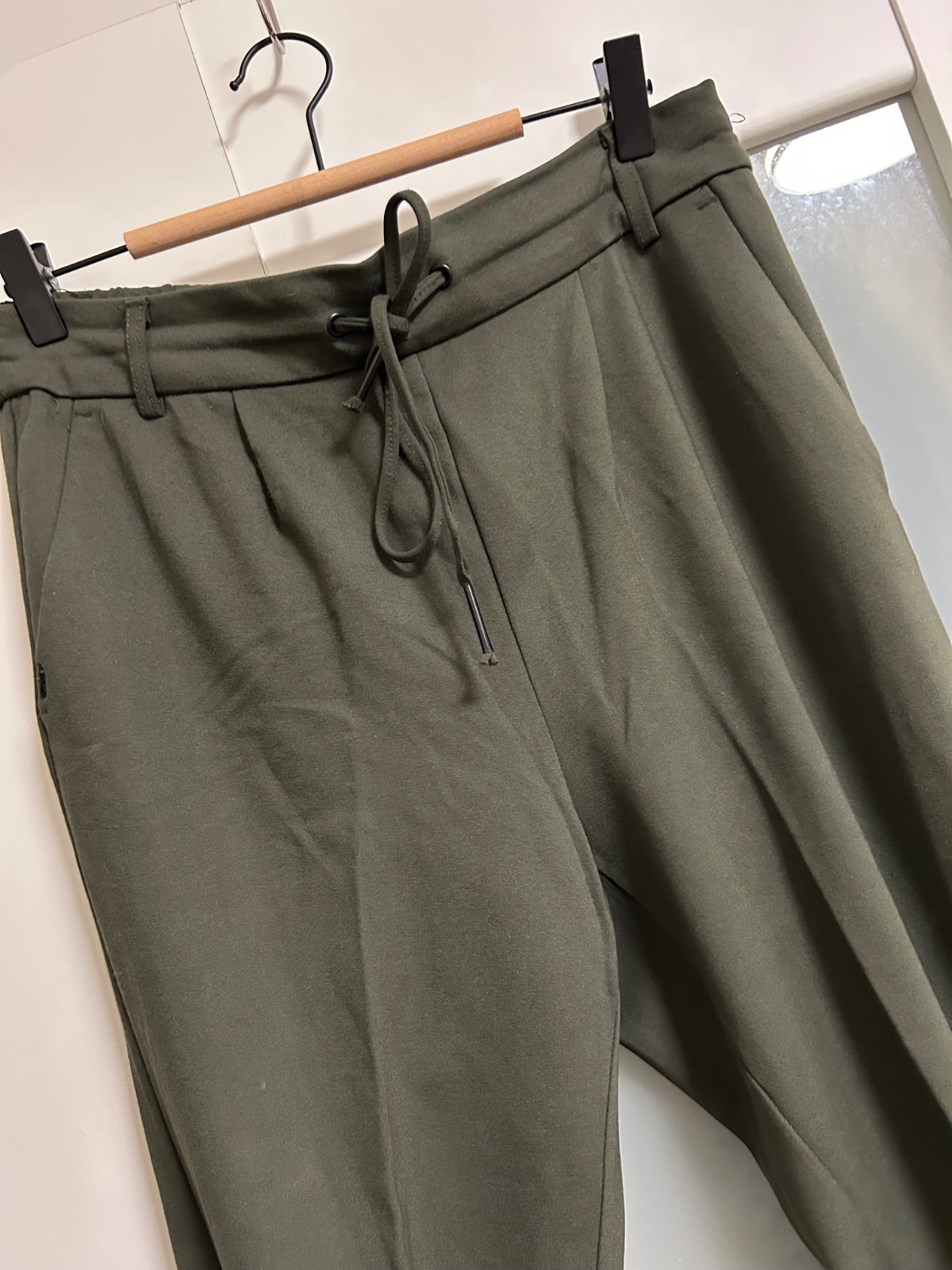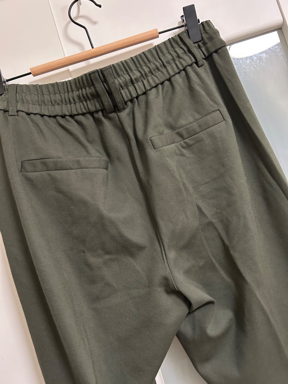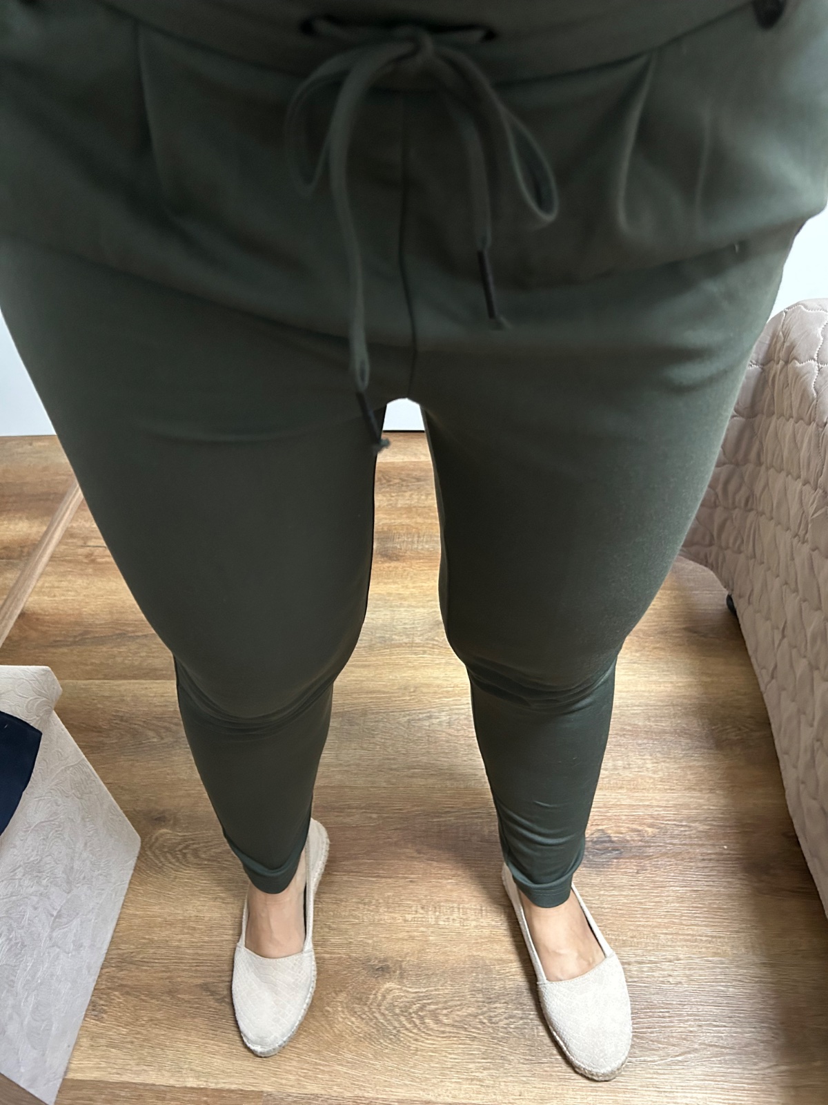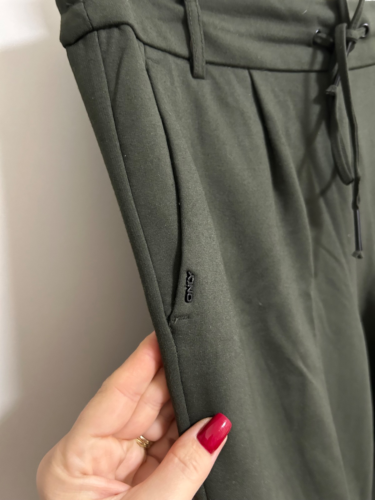 Top stav, farba tmavá khaki zelená, príjemný upletový materiál, dole zužené, vhodné k teniskám i lodičkam, v pase funkčná šnúrka, veľ. M/34, dl.95, š.38,5 v klude, sed 30/43, dole 13