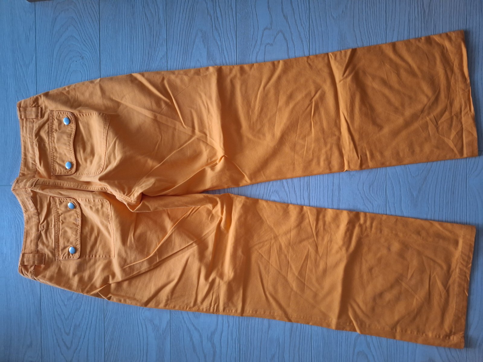 Príjemné letné nohavice melírovanej bledej oranžovej farby - presne ako na obrázku. Zapínajú sa vpredu na zips a gombík.