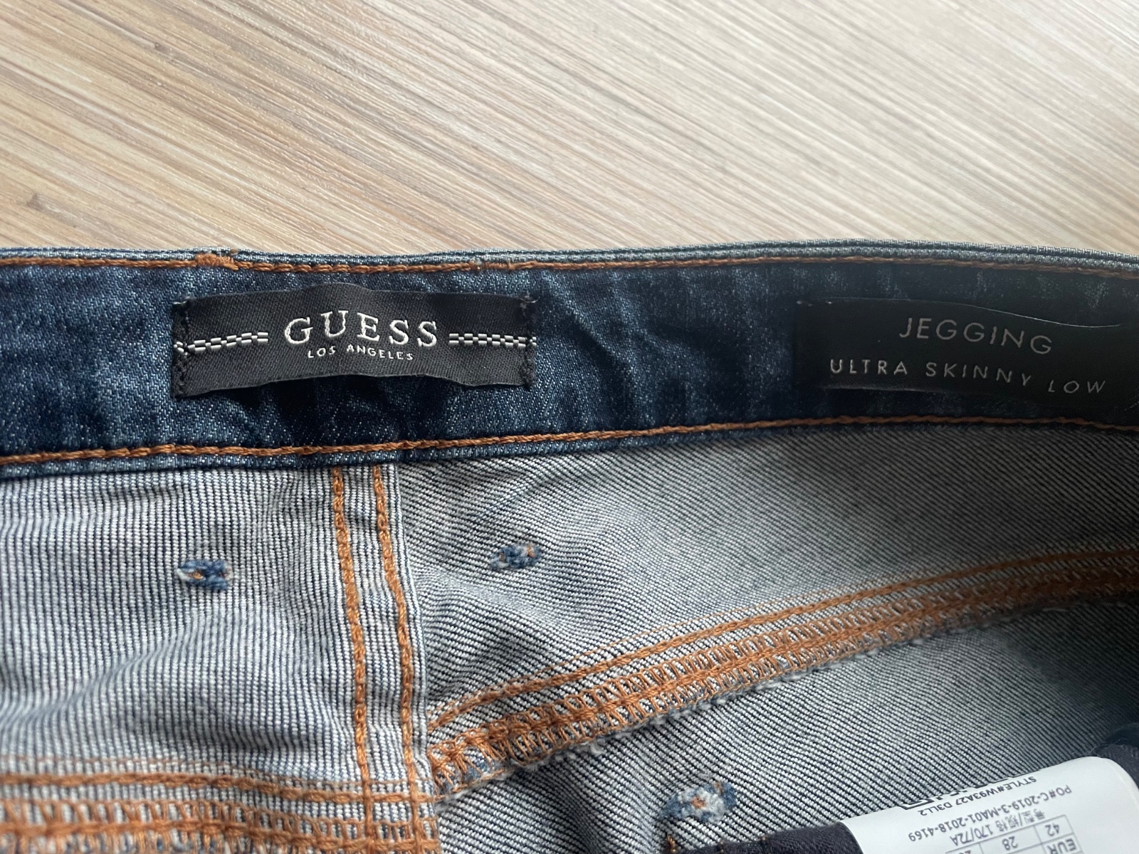 Tmavomodre rifle/jegginsy zn.Guess v zaujimavom vybijanom prevedeni, miestami i potrhany efekt, vzadu vybijane vrecka, detaily nafotene, velkost 28, raz oblecene