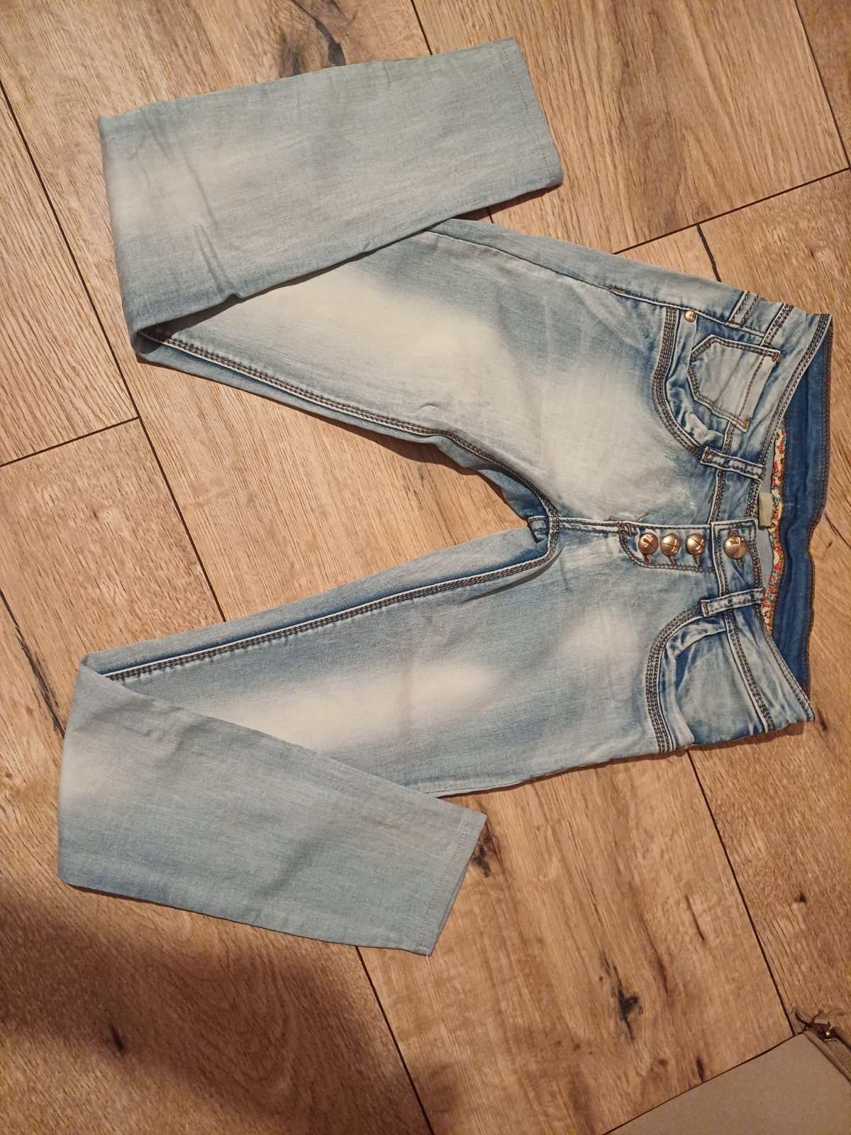 Bledomodré rifle s podšitymi dierami, bedrové. Pás 40 cm, dĺžka 87 cm. Veľkosť 32.