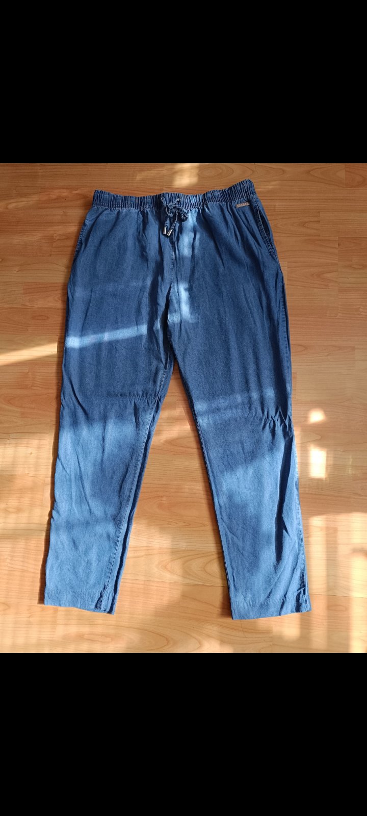 Nohavice takej petrolejovej modrej farby, oblečené asi 1x. Nesiada mi. V páse funknčná šnúrka. Dĺžka 95cm. šírka v pase v kľude- 40cm 2. Cena 8 eur plus pošta.