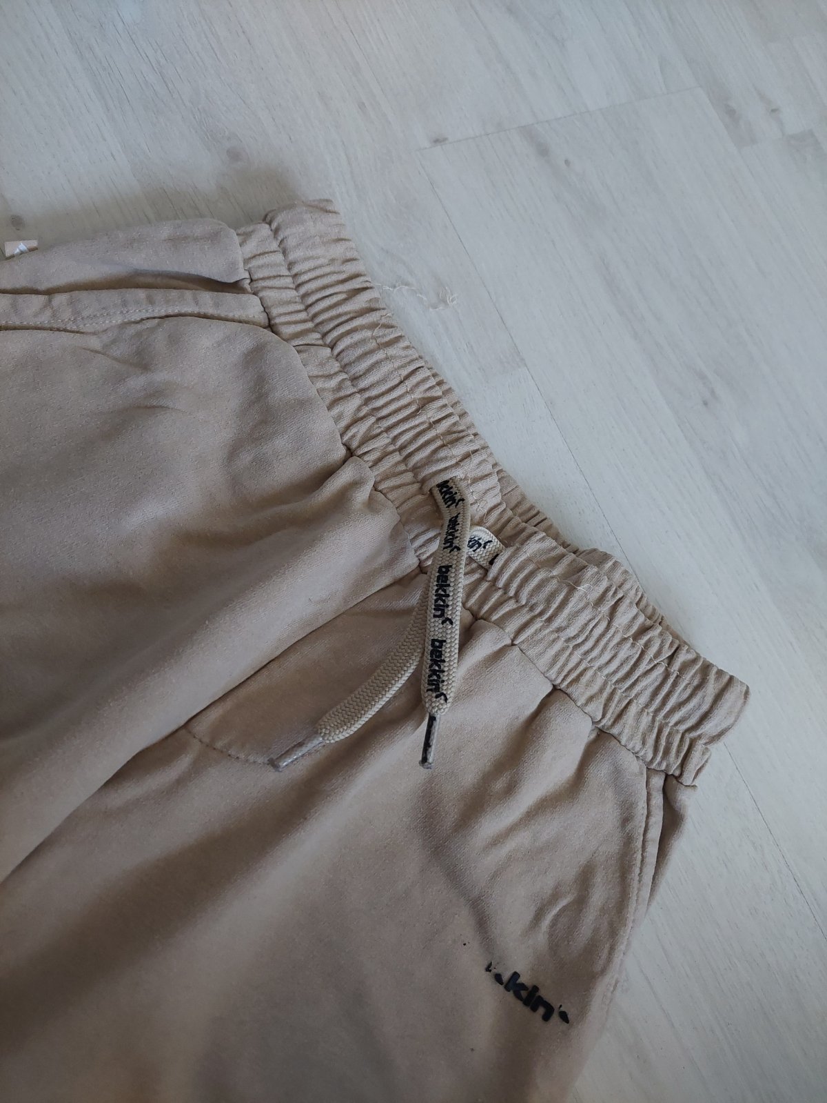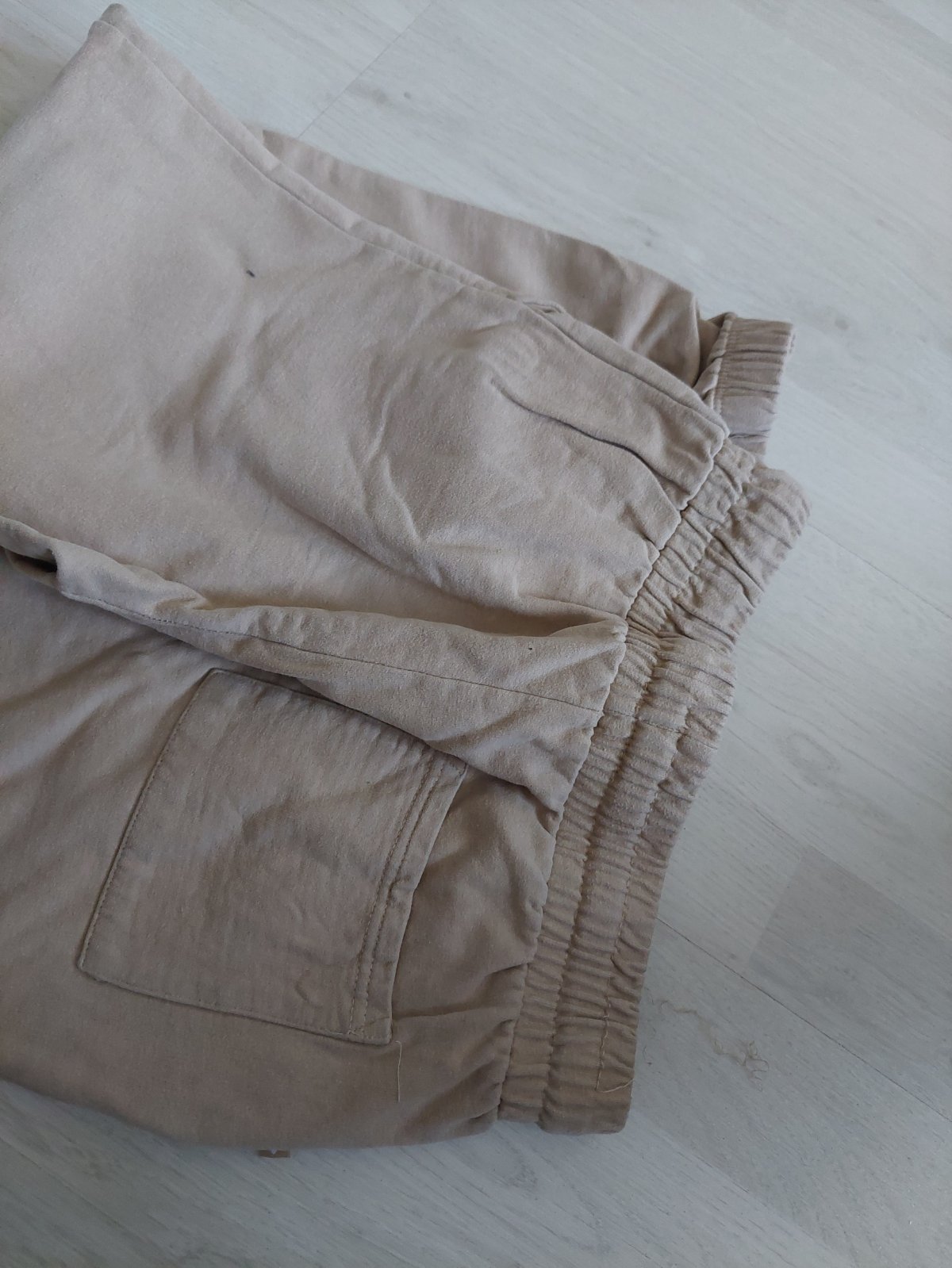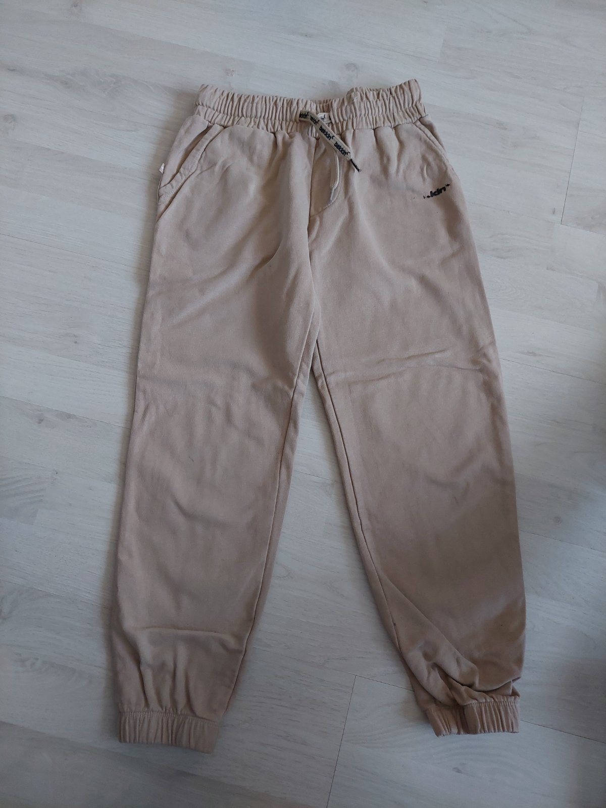 Na predaj pekne tepláky krémovej farby. Je to top stav. Majú aj vrecká. Pás má gumu v nenatiahnutom stave 34 CM x 2. Celková dĺžka je 94 CM.