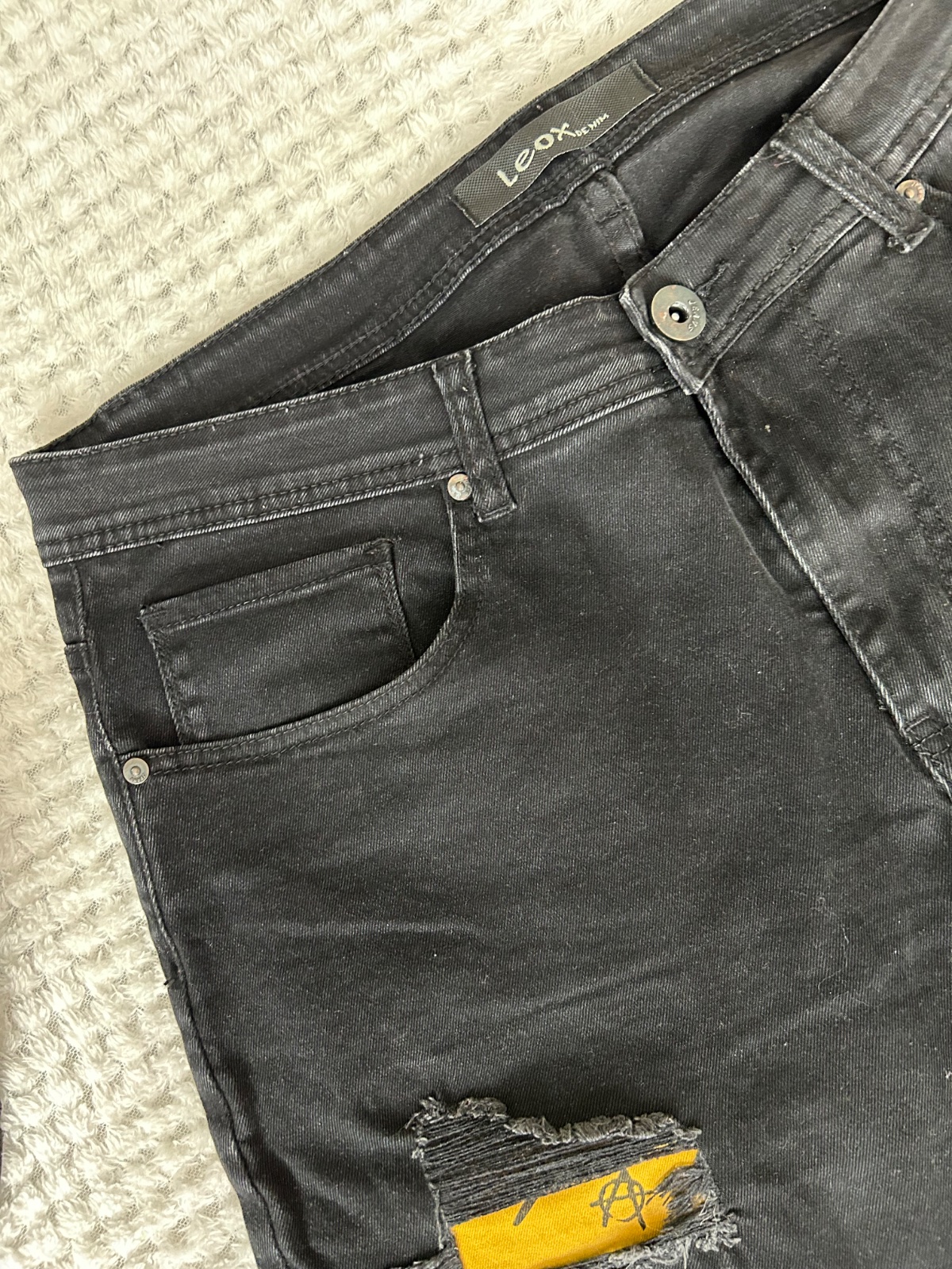 Krásne rifle ani nenosené. Na spodu dotrhané org. krásne. D - 95cm Pás - -33x2