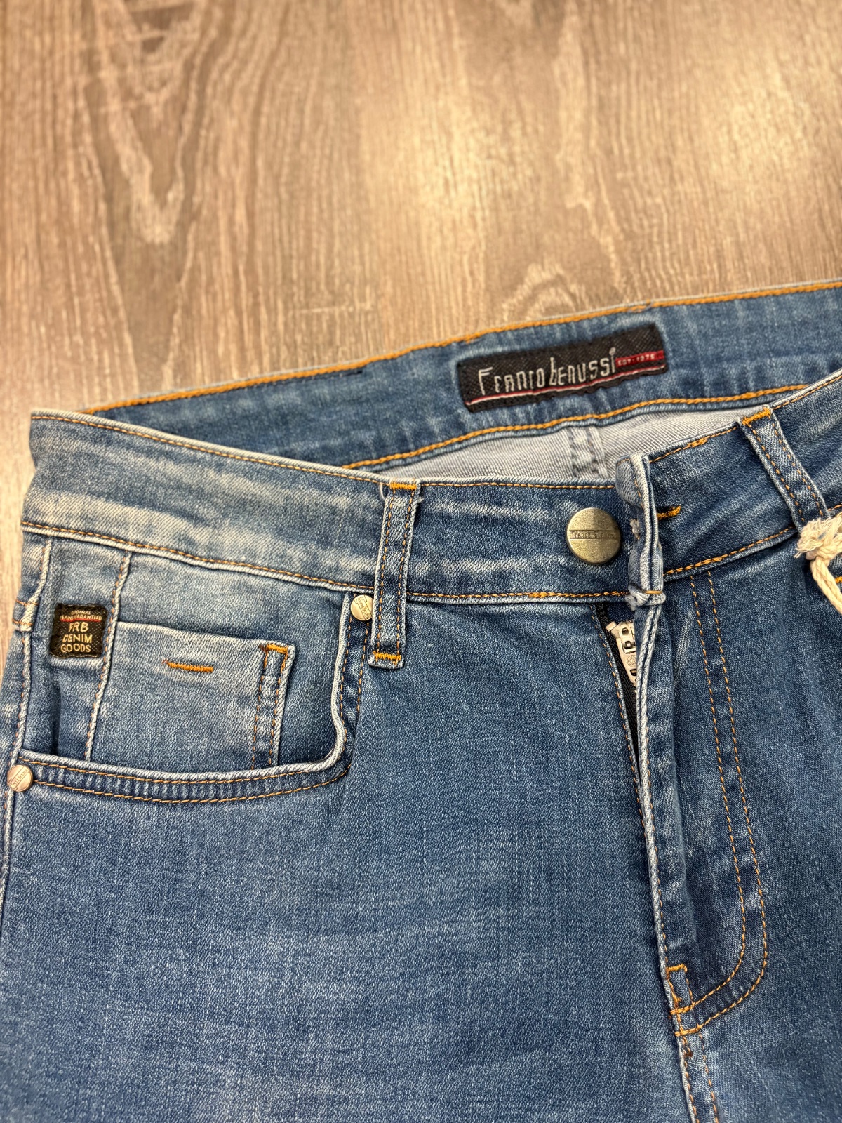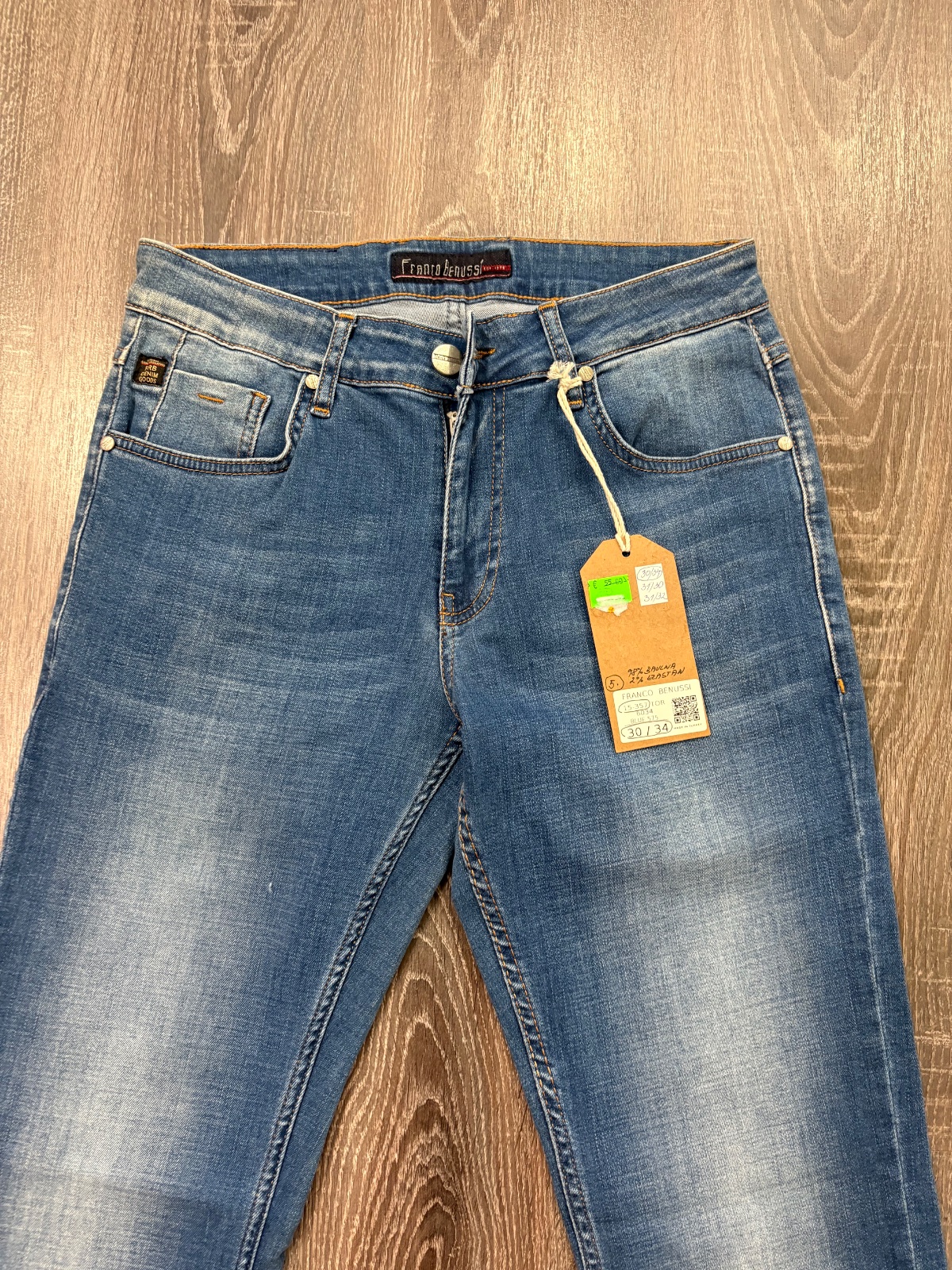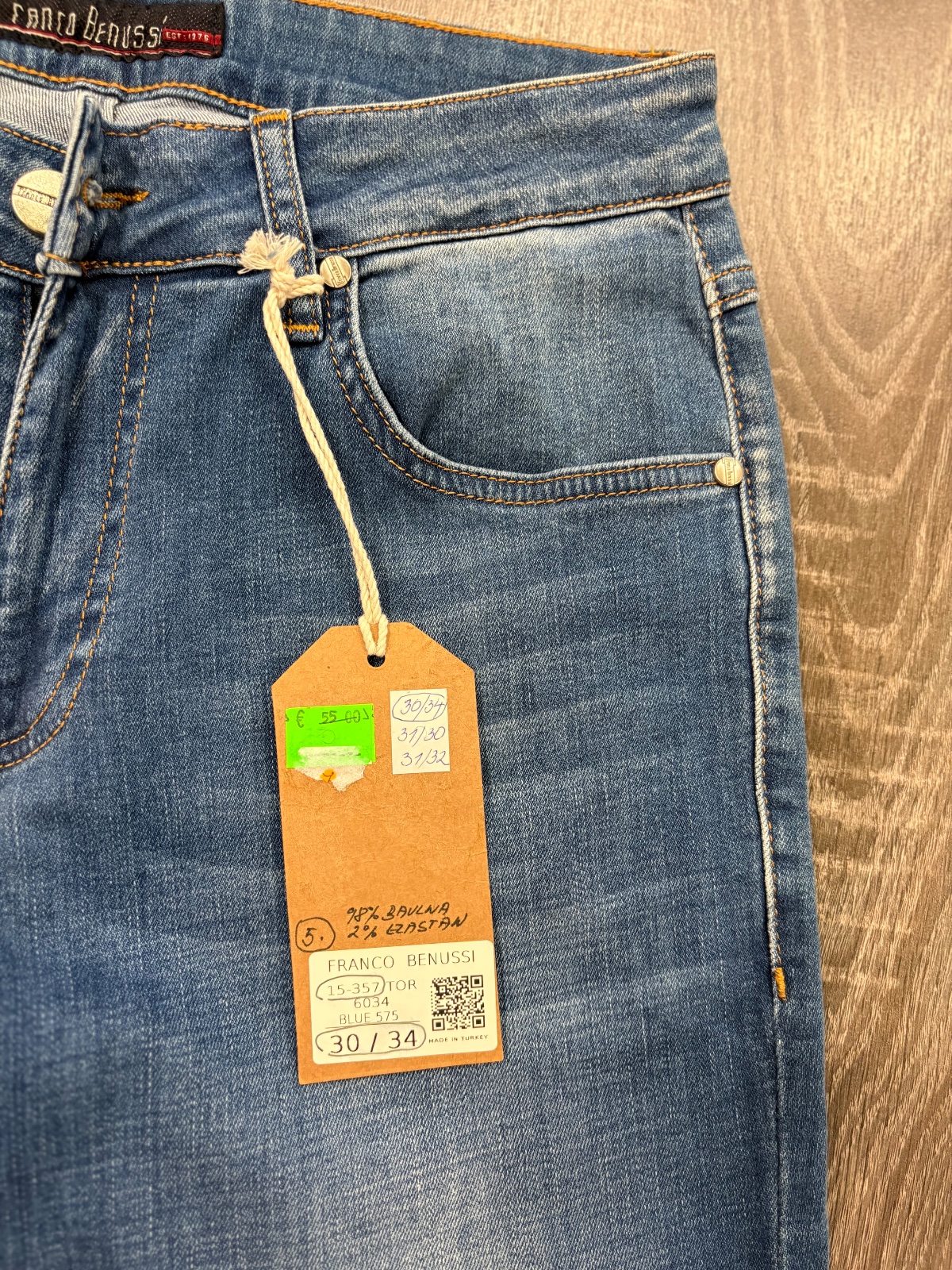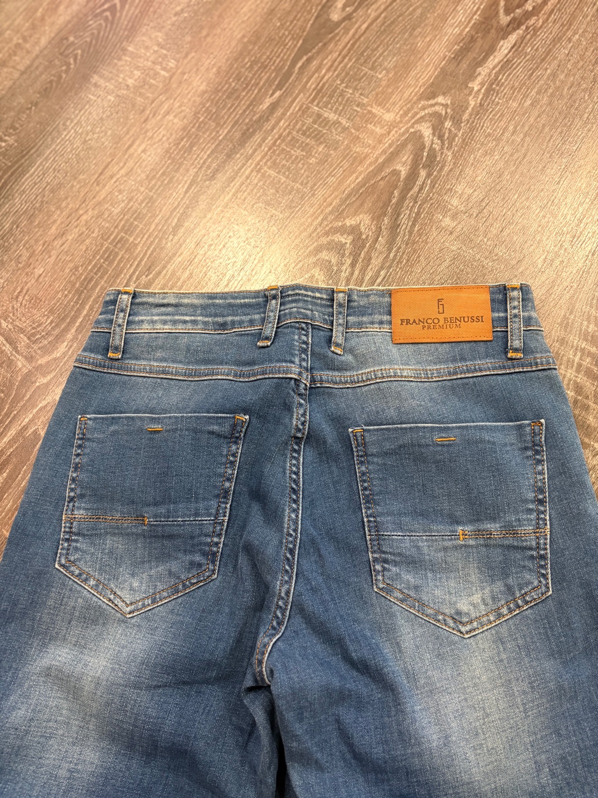 FRanco Benussi nove panske riflove nohavice,komplet s etiketou,PC 55 eur, material bavlna a elastan,velkost W30 L 34,dlzka je 107,sirka v pase je od 38x2cm do 43x2cm,predny sed je 25cm a zadny je 37cm,sirka stehna pod rozkrokom je od 29x2cm, do 33x2cm,sirka dole je 19cm