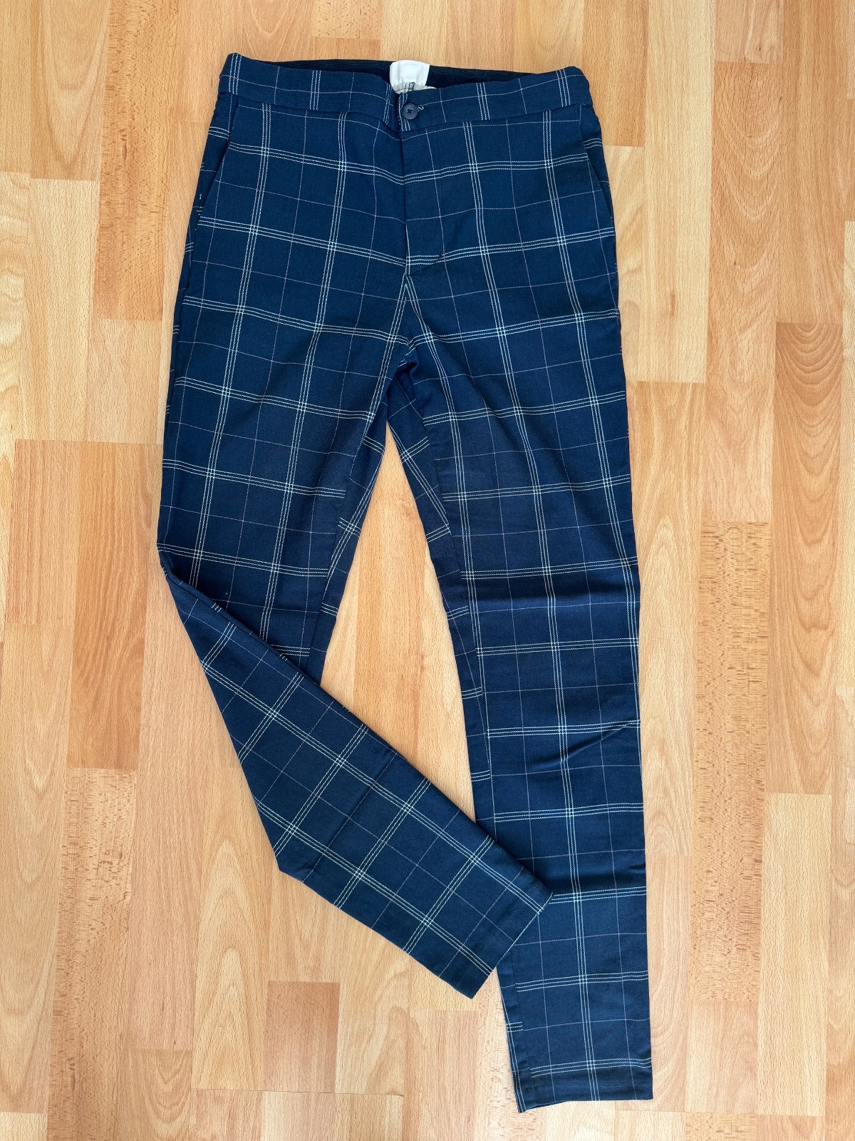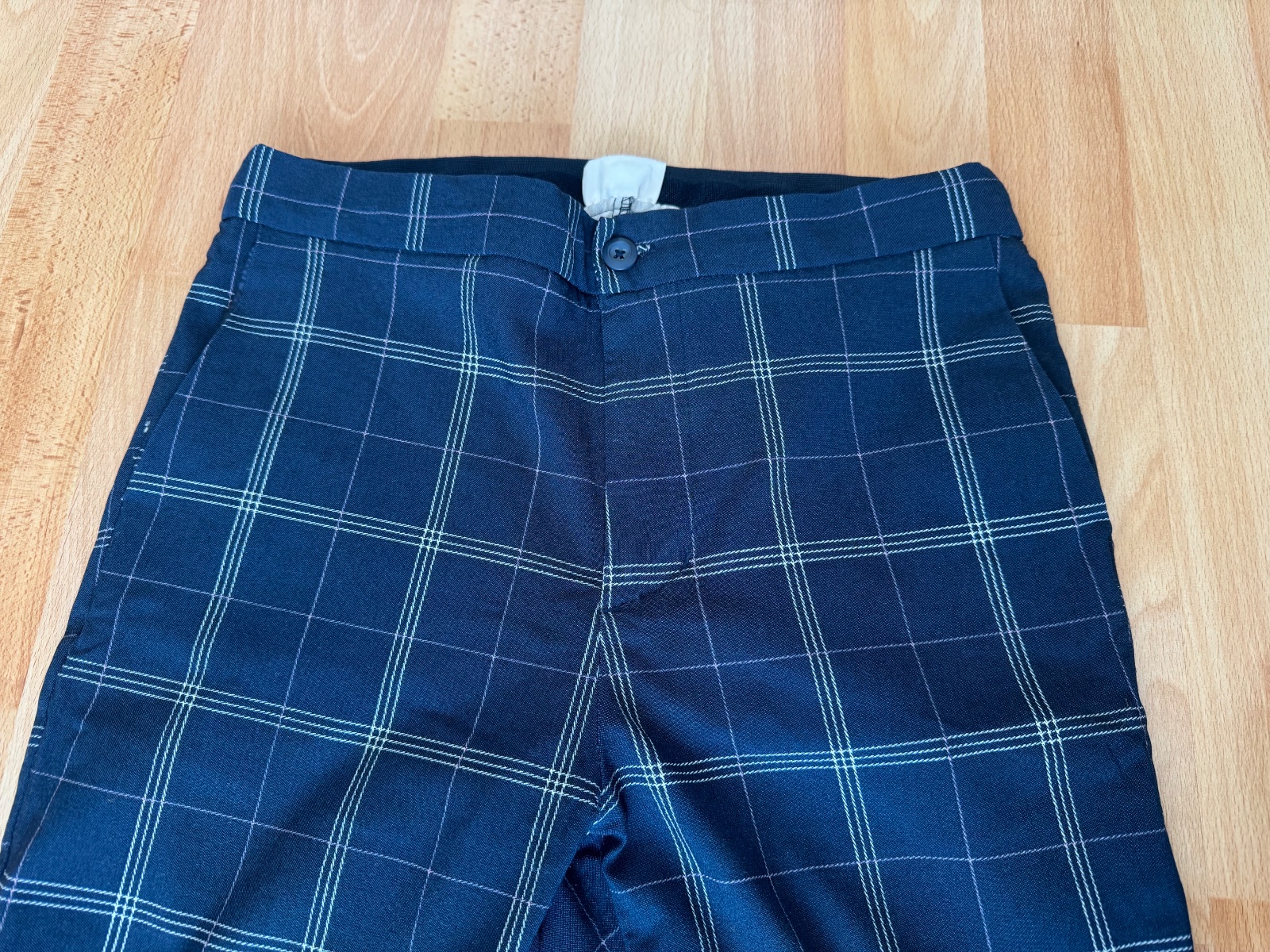 Modré nohavice so vzorom, veľkosť 38, kupované v Pepcu, minimálne nosené. Rozmery: pás 34 (zo zadu gumička), dĺžka vonkajšia93 cm, dĺžka vnútorná 70 cm, sed 32 cm