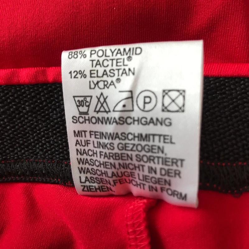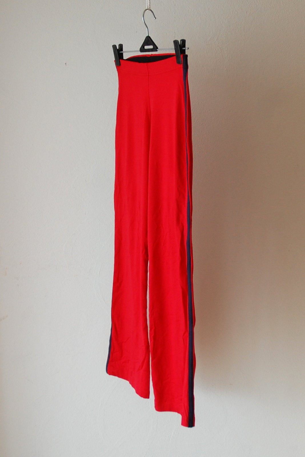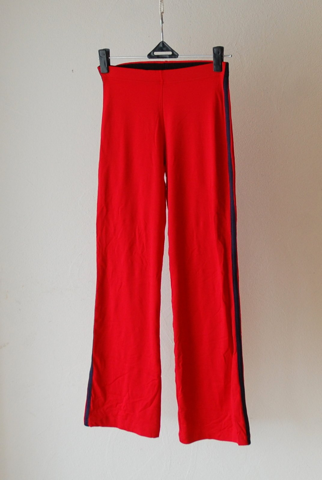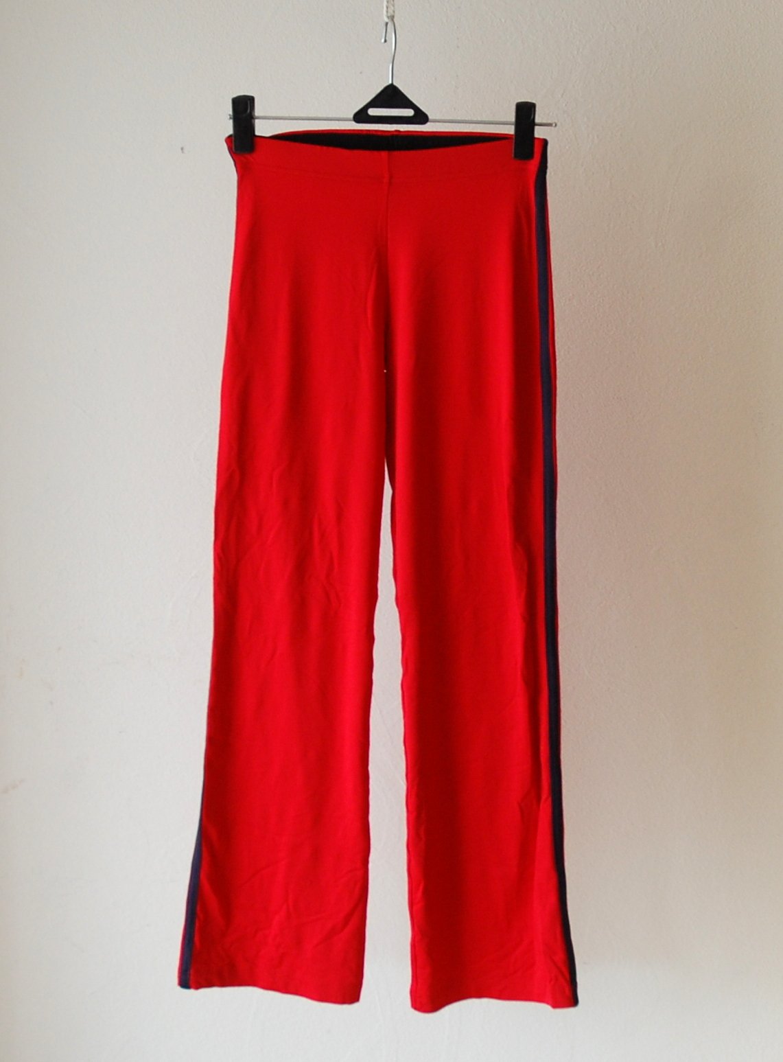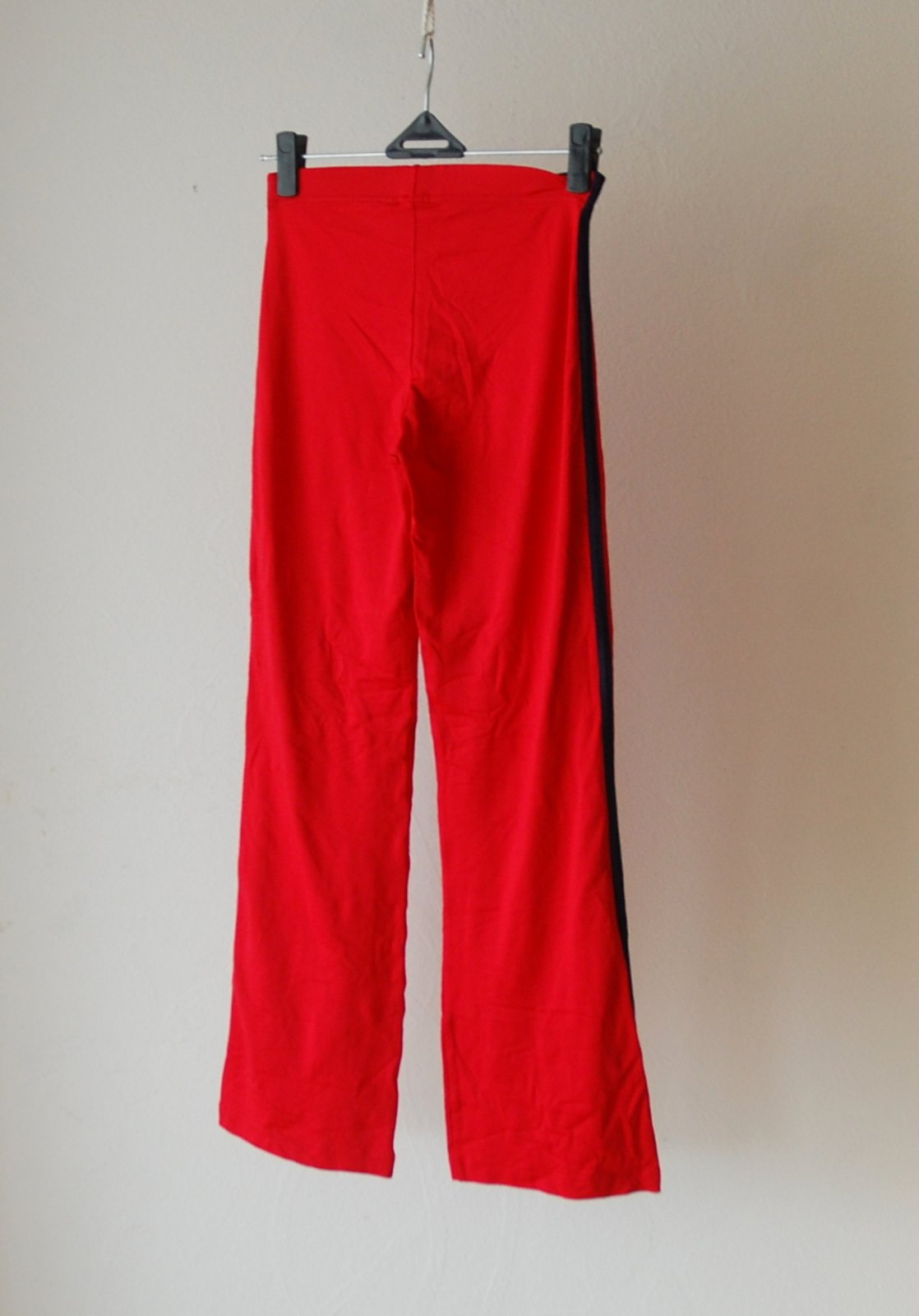 Predám trendy dámske elastické nohavice v sýtej červenej farbe s kontrastným čiernym bočným pruhom (lampasom). Tento strih opticky predlžuje a zoštíhľuje postavu. Sú ideálne na voľný čas, prechádzky, ale aj na domáce nosenie.