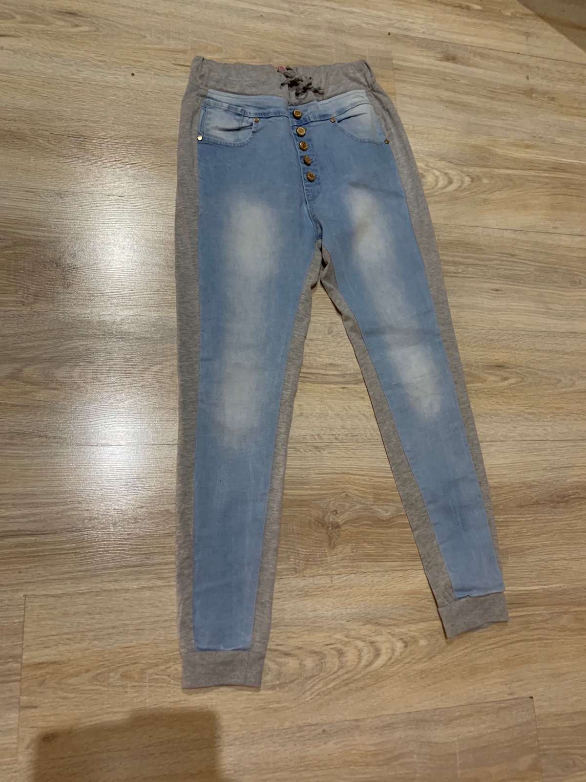 Predám zaujímavé rifloteplakove vpredu riflovina vzadu teplákove pekne úkazu na postave ok stav dĺžka101cm od rozkroku dolu73cm pas34cm ešte sa prispôsobí a šnúrka sa dá stiahnuť posta1,90 obyčajne alex nov