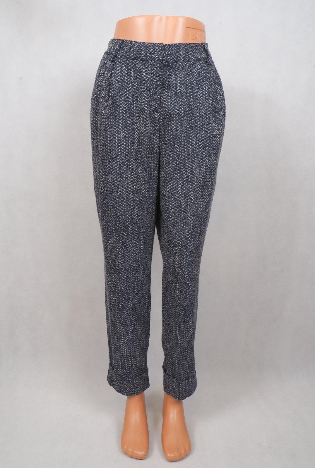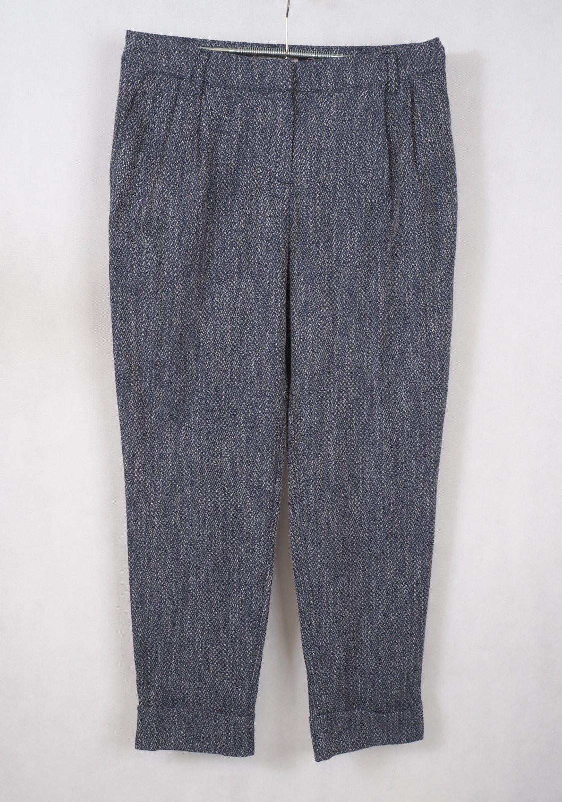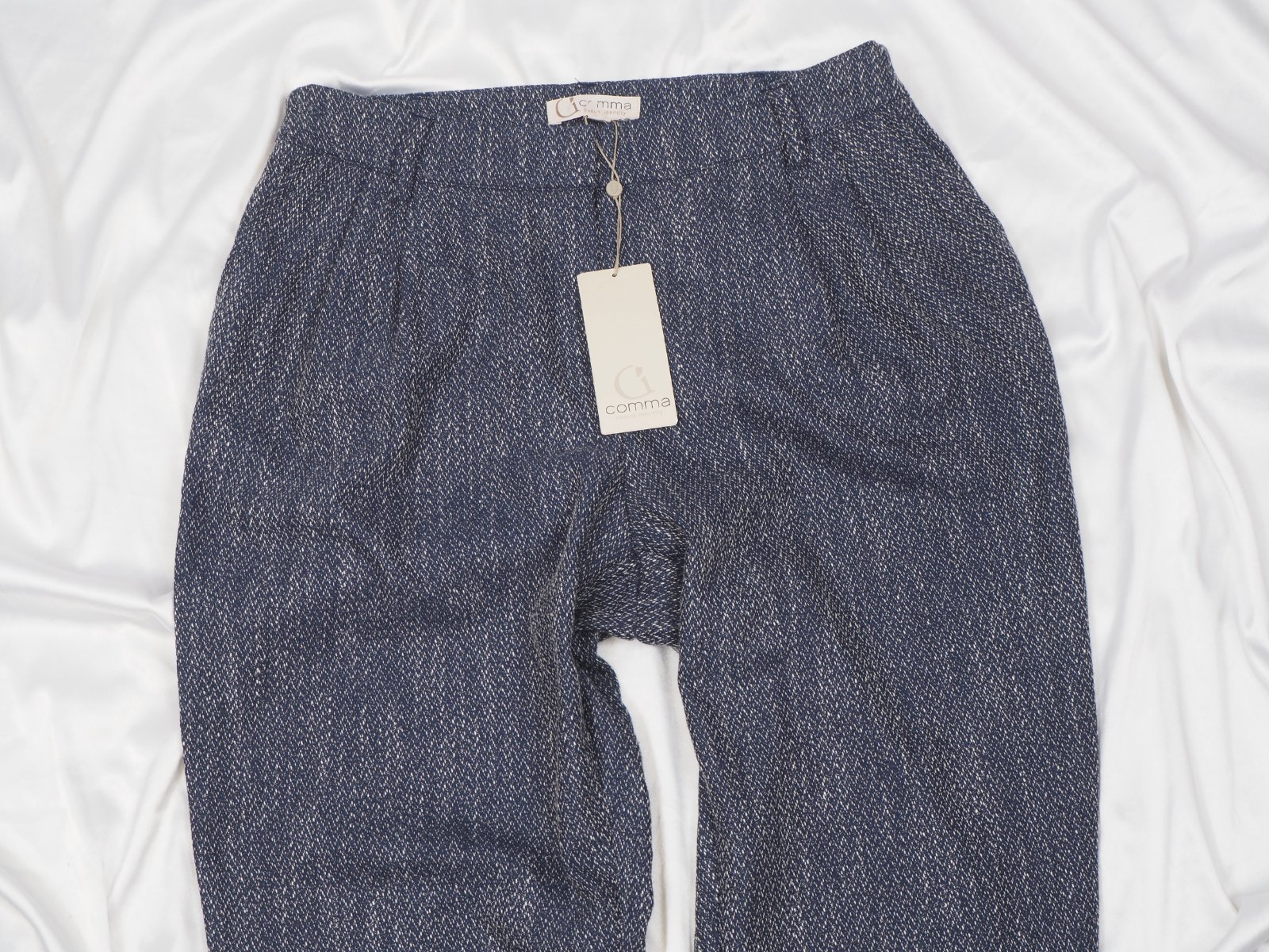Kvalitné dámske nohavice tmavomodrej farby, popretkávané bielou niťou, materiál 56% polyester, 31% viskóza, 10% bavlna, 3% elastan, všité vrecká, vpredu jemne nariasené, dole zahnuté, nové s visačkou.