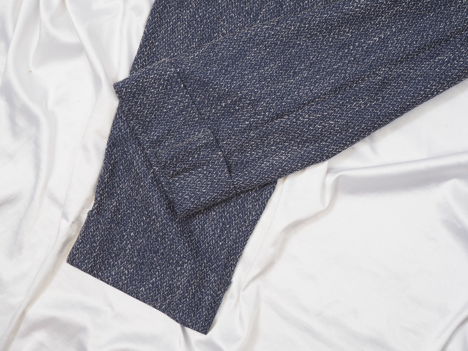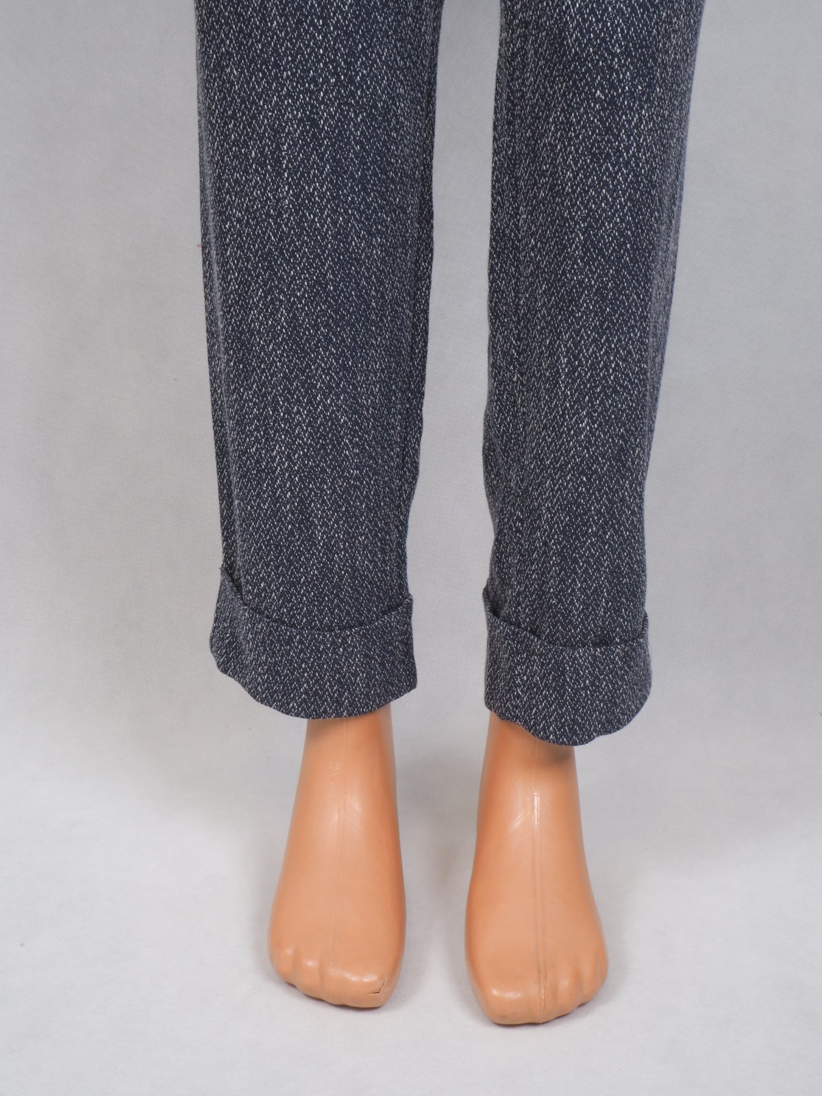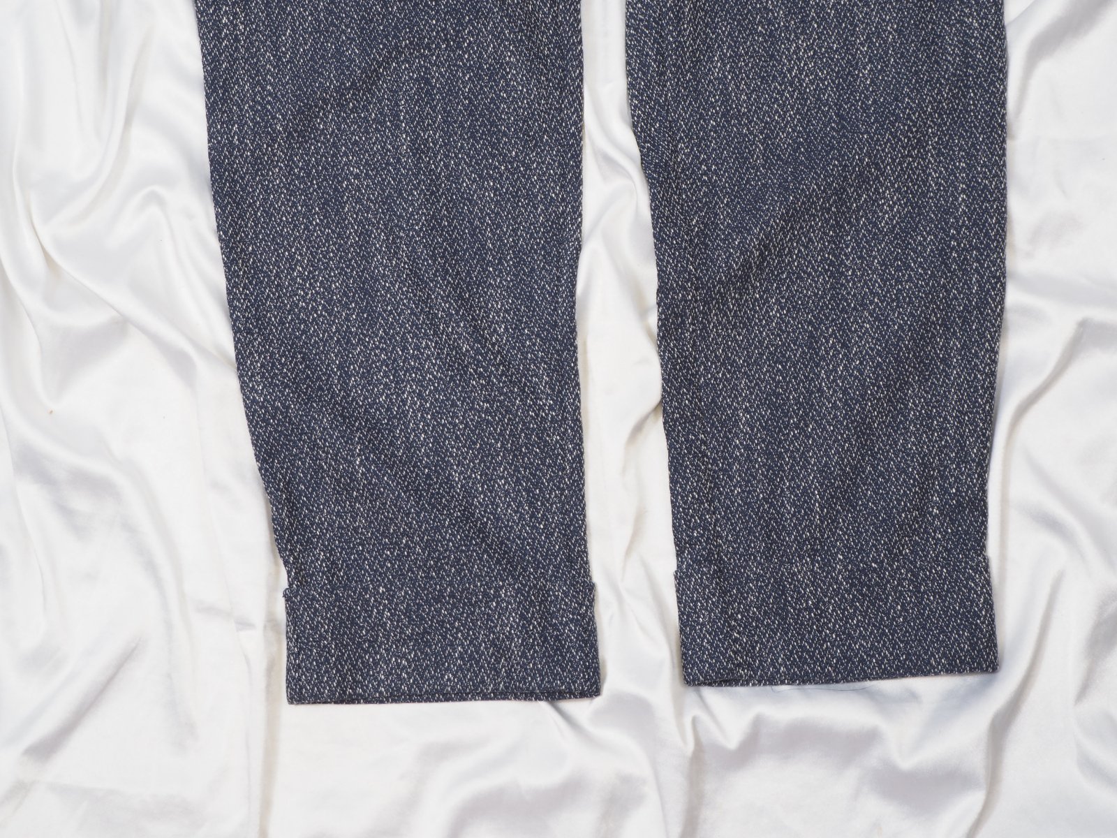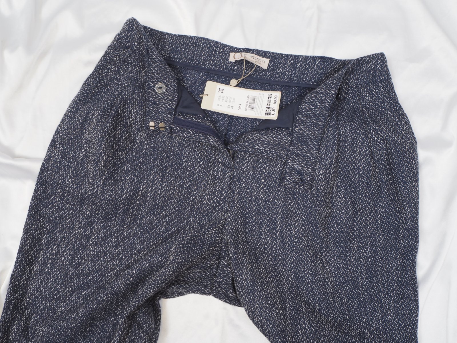 Kvalitné dámske nohavice tmavomodrej farby, popretkávané bielou niťou, materiál 56% polyester, 31% viskóza, 10% bavlna, 3% elastan, všité vrecká, vpredu jemne nariasené, dole zahnuté, nové s visačkou.