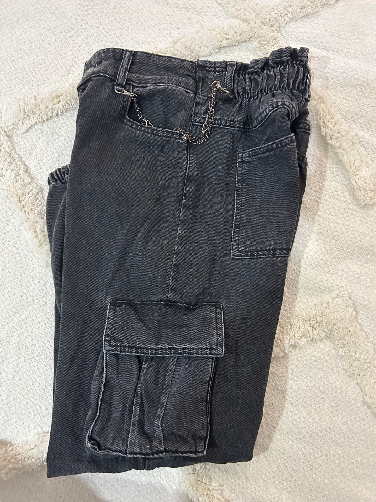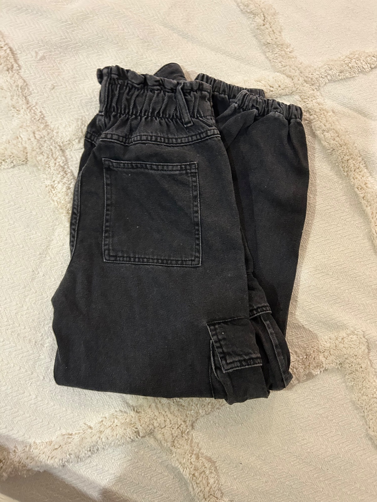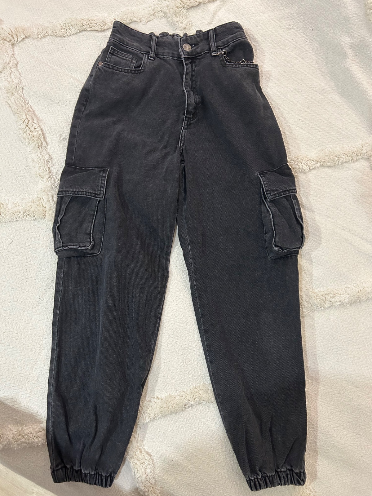 Priliehavé nohavice z bavlnenej denimovej látky, vypraný efekt, elastický pás, skrytý zips a zašité vrecká na prednom diele. Nosene malo, bez poskodenia. dlzka 89 cm, pas 29 cm.