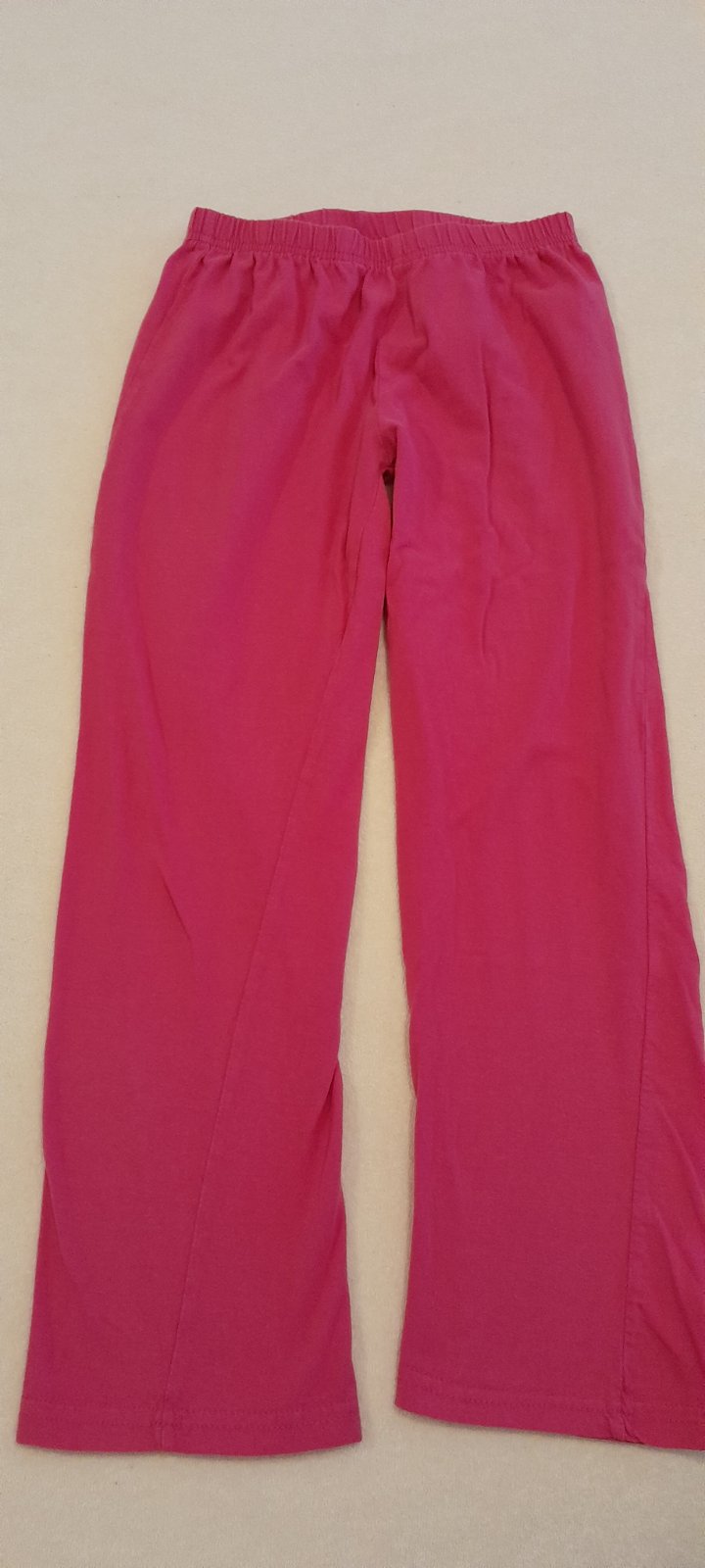pekne teplakove nohavice pre dievčata sytej ružovej farby s nápisom, a s dvoma vreckami ..bez dierok, žmoliek... velkost je písana 6A ...podla mojho odhadu asi 116 až 122 velkost... v páse šir...