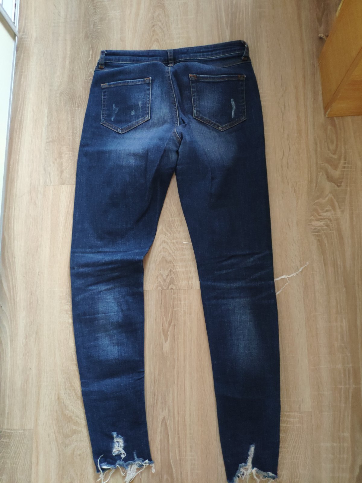 Krasne tenucke rifle, su elasticke, velkost 36-38, farba mi nesla dobre odfotit je pekna tmavomodra, nie taka cierna ako na fotke, dlzka 95 cm, pas 2x 37,5cm