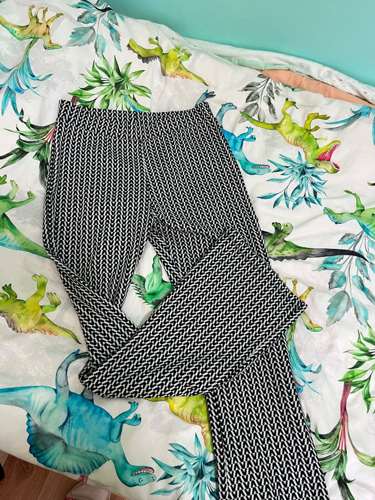 nohavice z imitácie kože, voľné nohavice, zvýšený pás, vzadu aj vpredu vrecká, zapínanie na cvok a zips, v 100% stave, minimum použité, po jednom dieťati, kúpené nové rozmery: pás-32 cm/nastaviteľ...