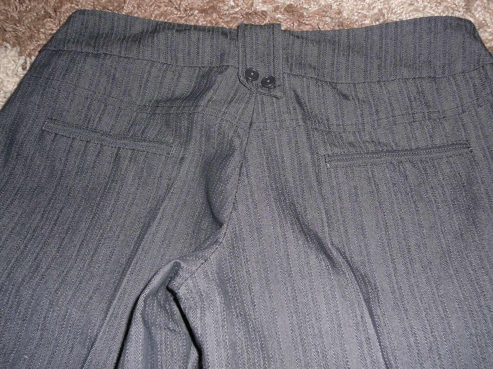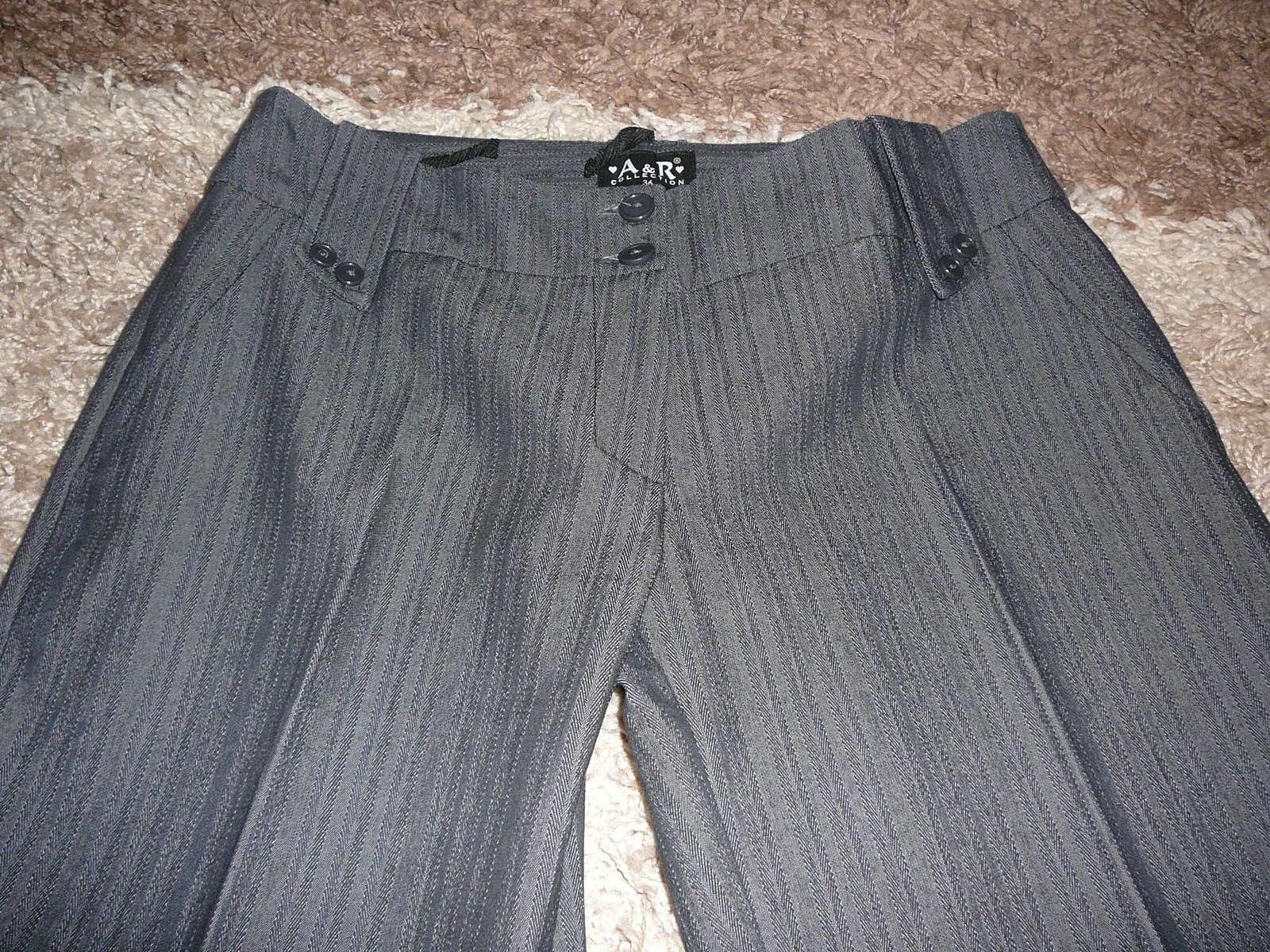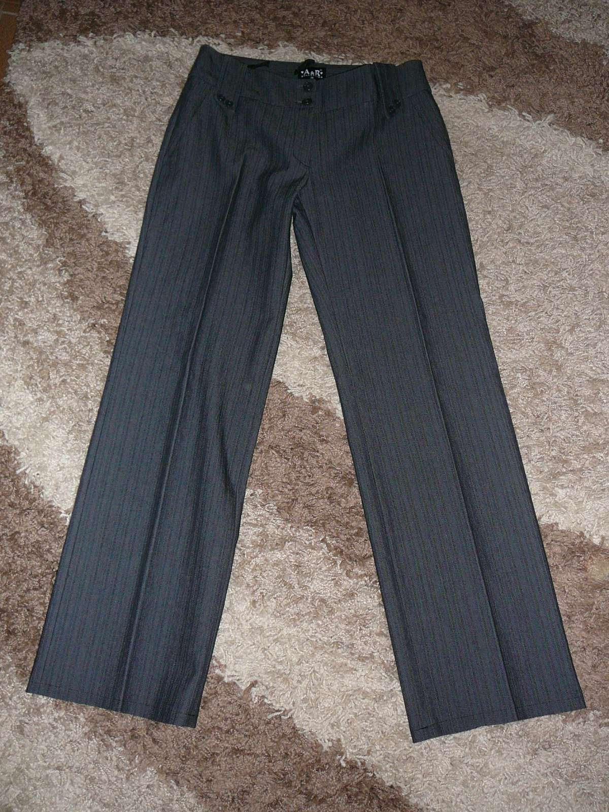 Nohavice sú v 100% stave, keďže boli málo nosené, majú znížený pás, sú sivej farby s prúžkom, vpredu aj vzadu sú falošné vrecká, zapínanie na zips plus 2 gombíky nad sebou.