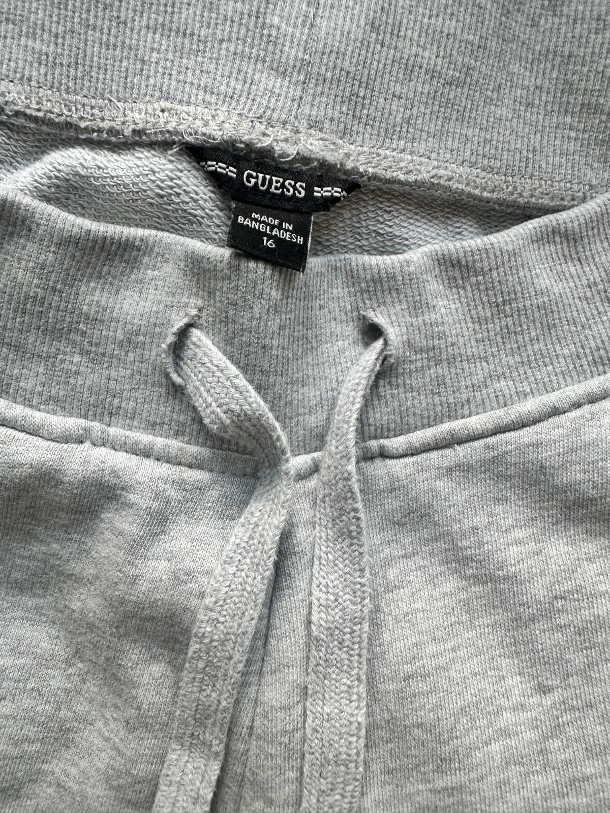 Príjemné bavlnené tepláky s vreckami po bokoch a vreckom vzadu (s logom guess), v super stave, bez poškodení. V elastickom páse je uťahovacia šnúrka. Uvedená veľkosť je 16, boli nosené na veľkosť S, sedia na S.