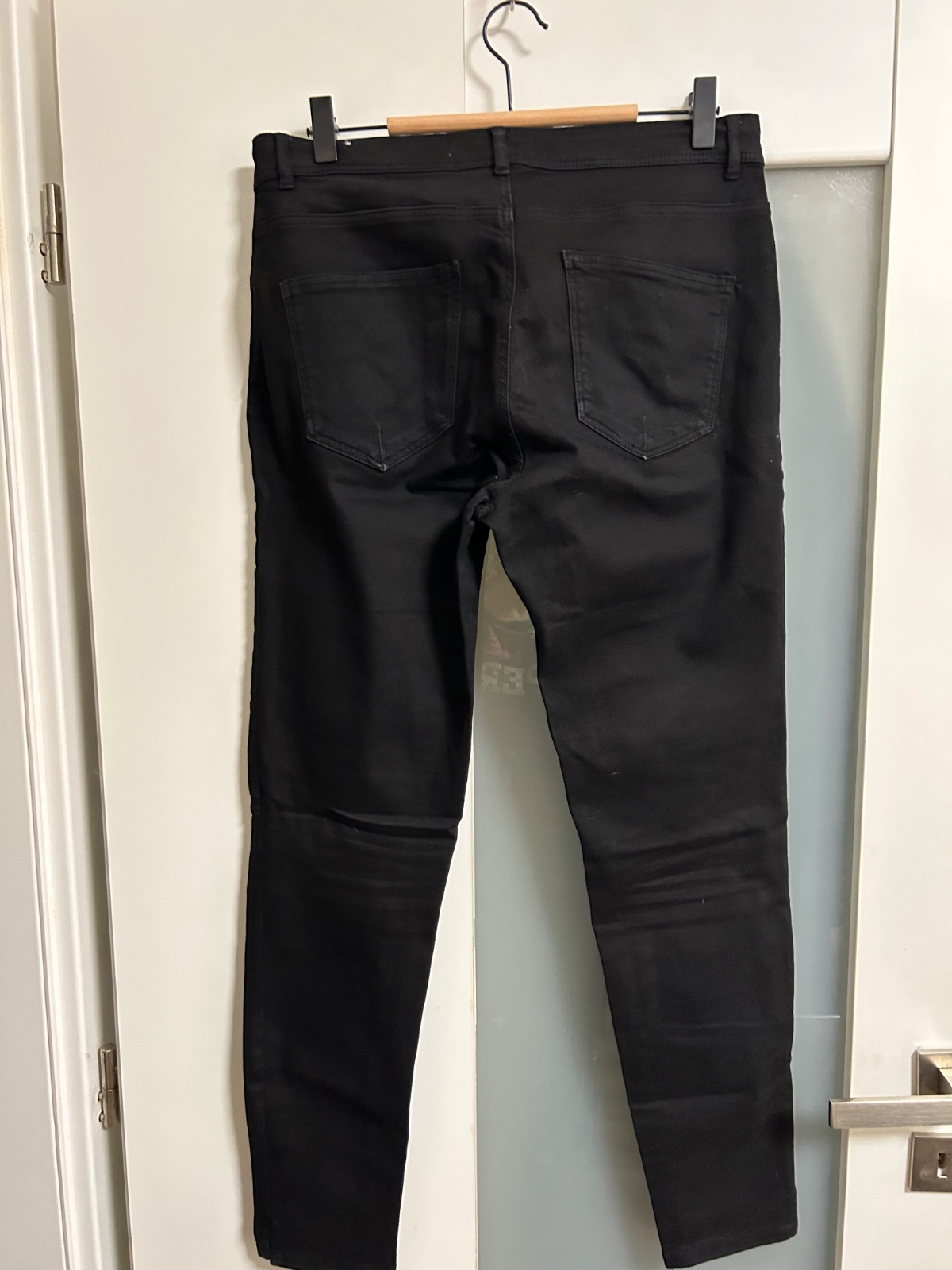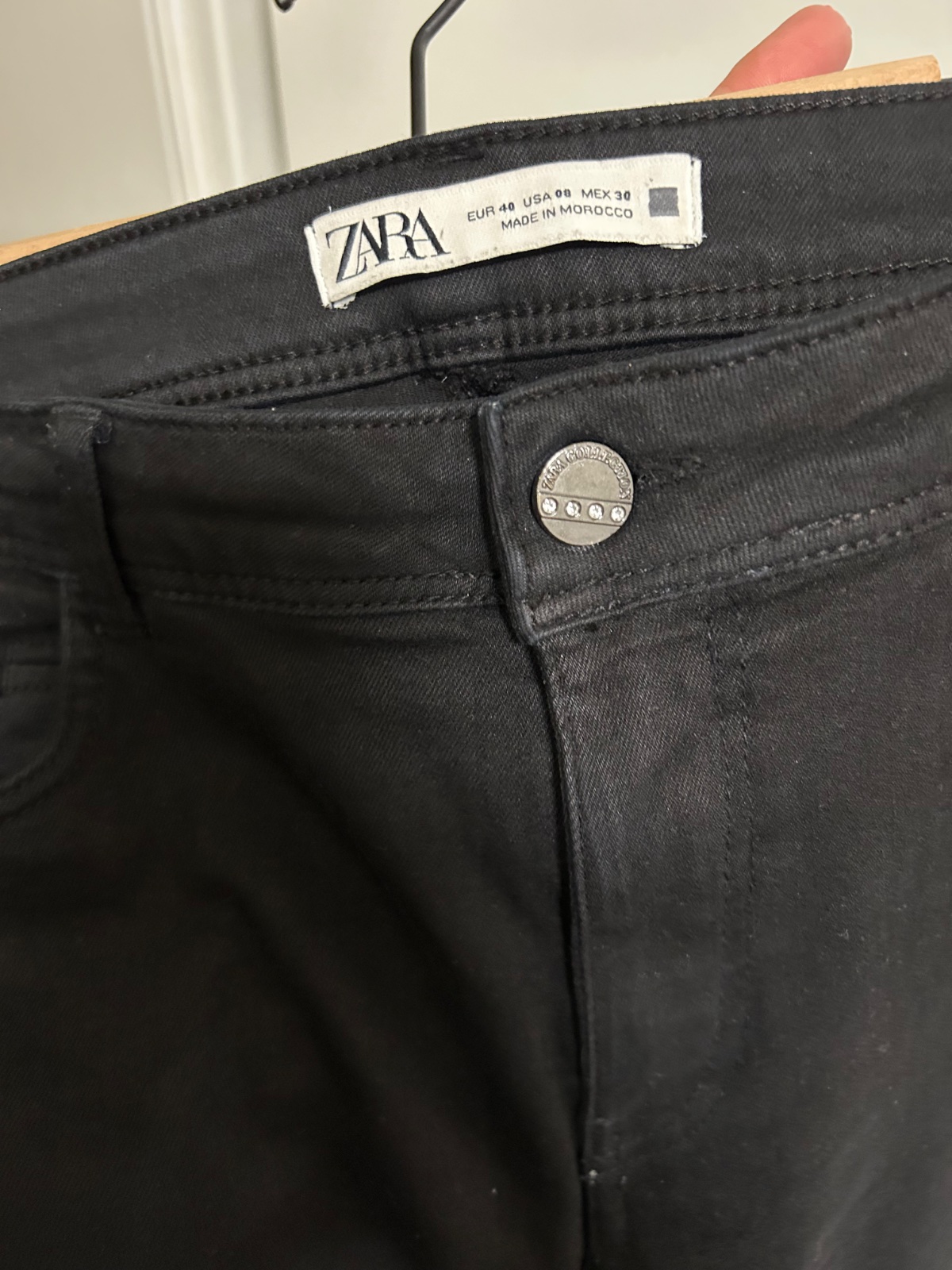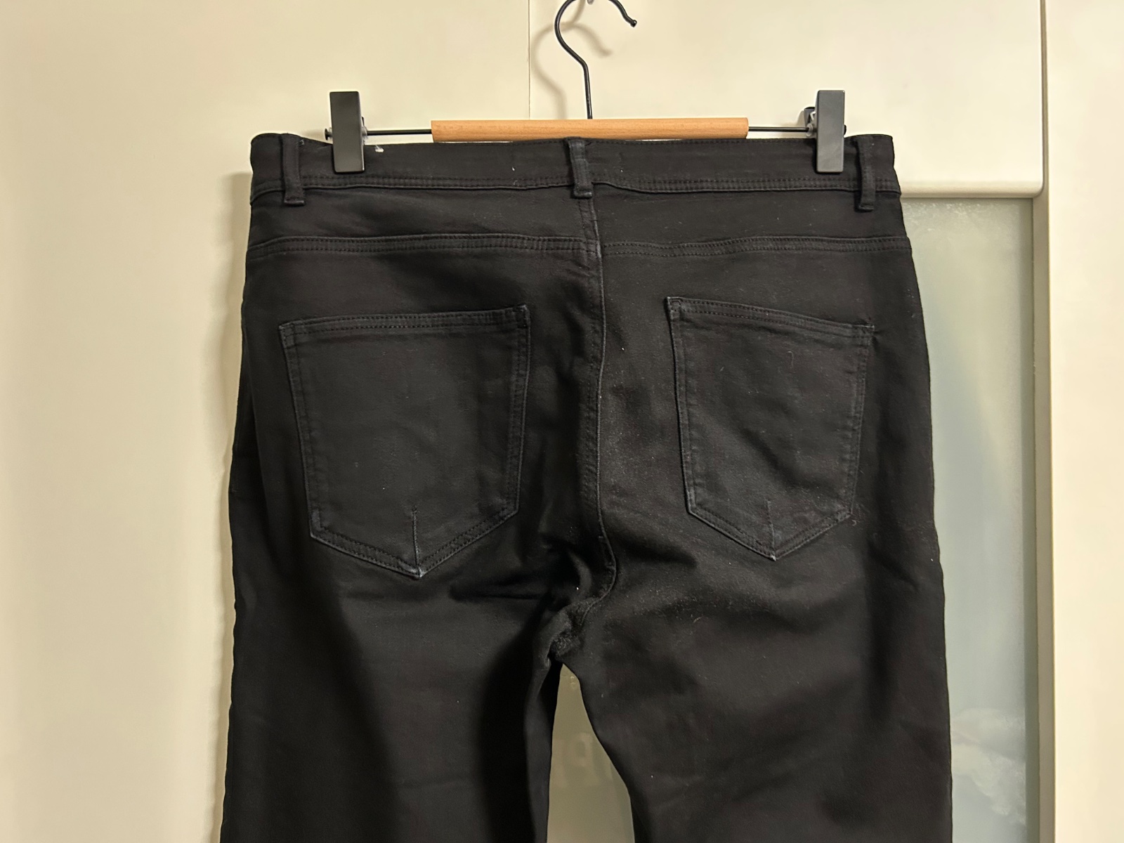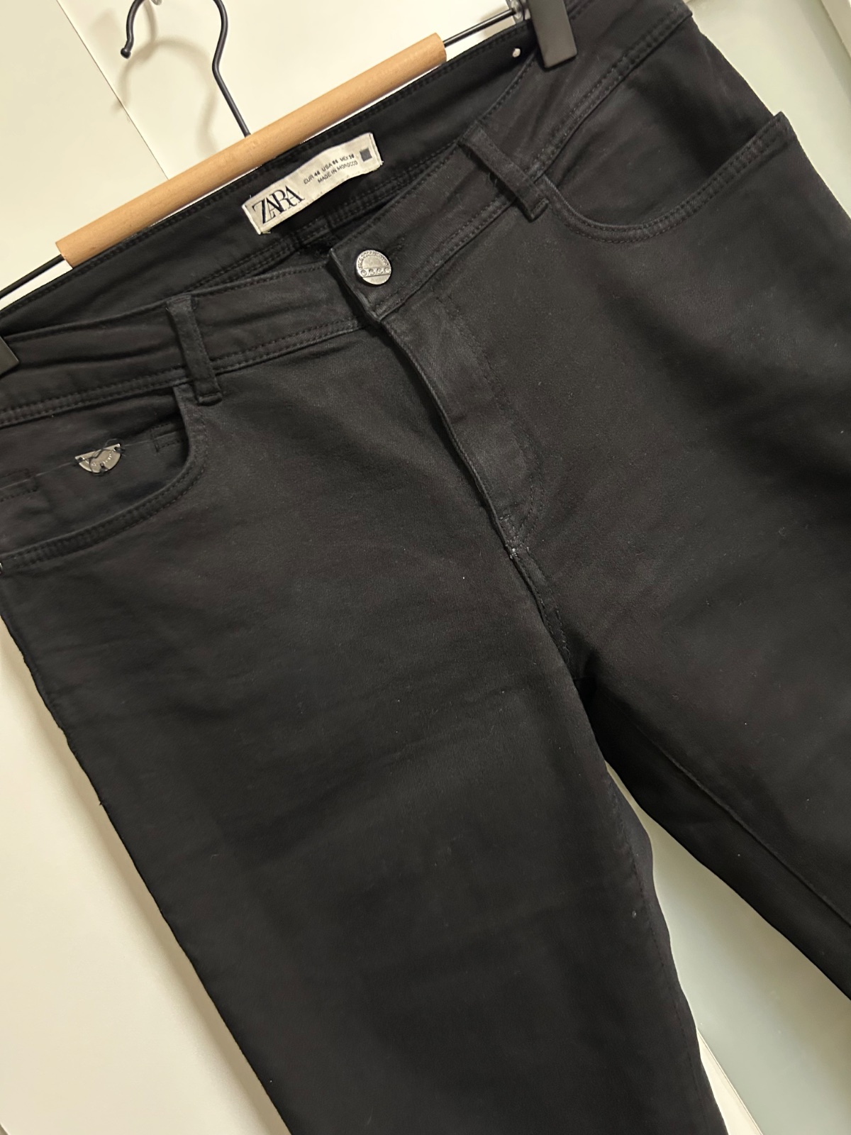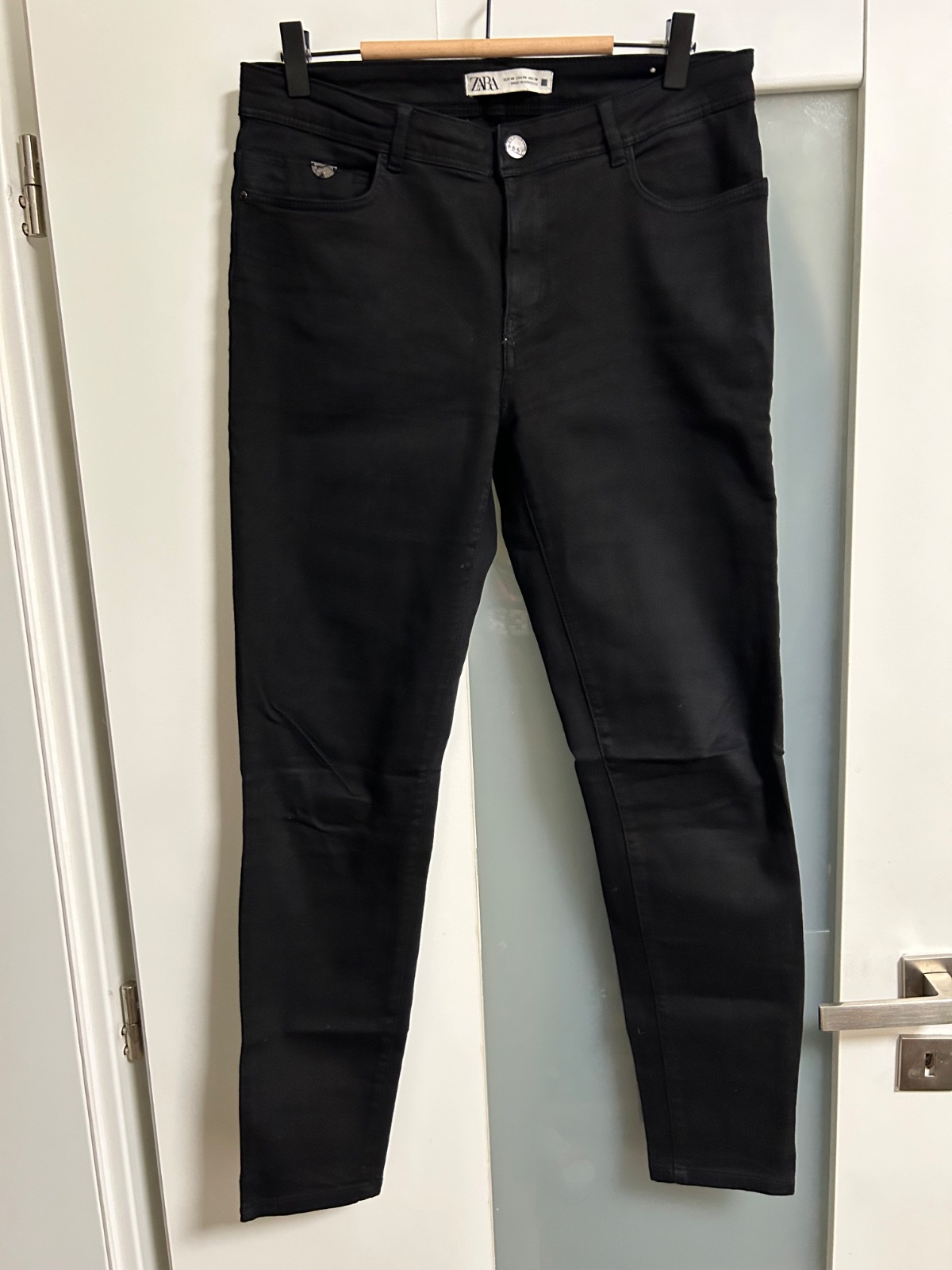 Top stav, oblečené pár krát, pružný elasticky materiál, sýta čierna farba (zle sa fotí zblízka), nie sú spraté ani vyblednuté, veľ.40, dl.95, š.39, sed 24/38,5, dole 13