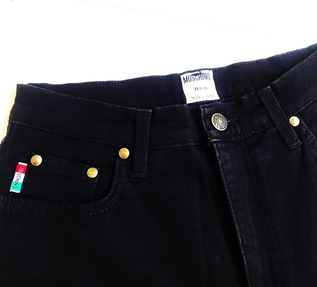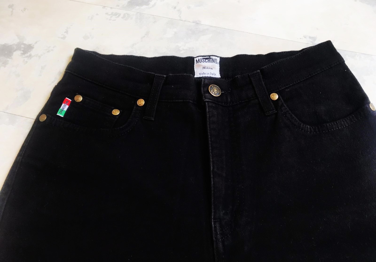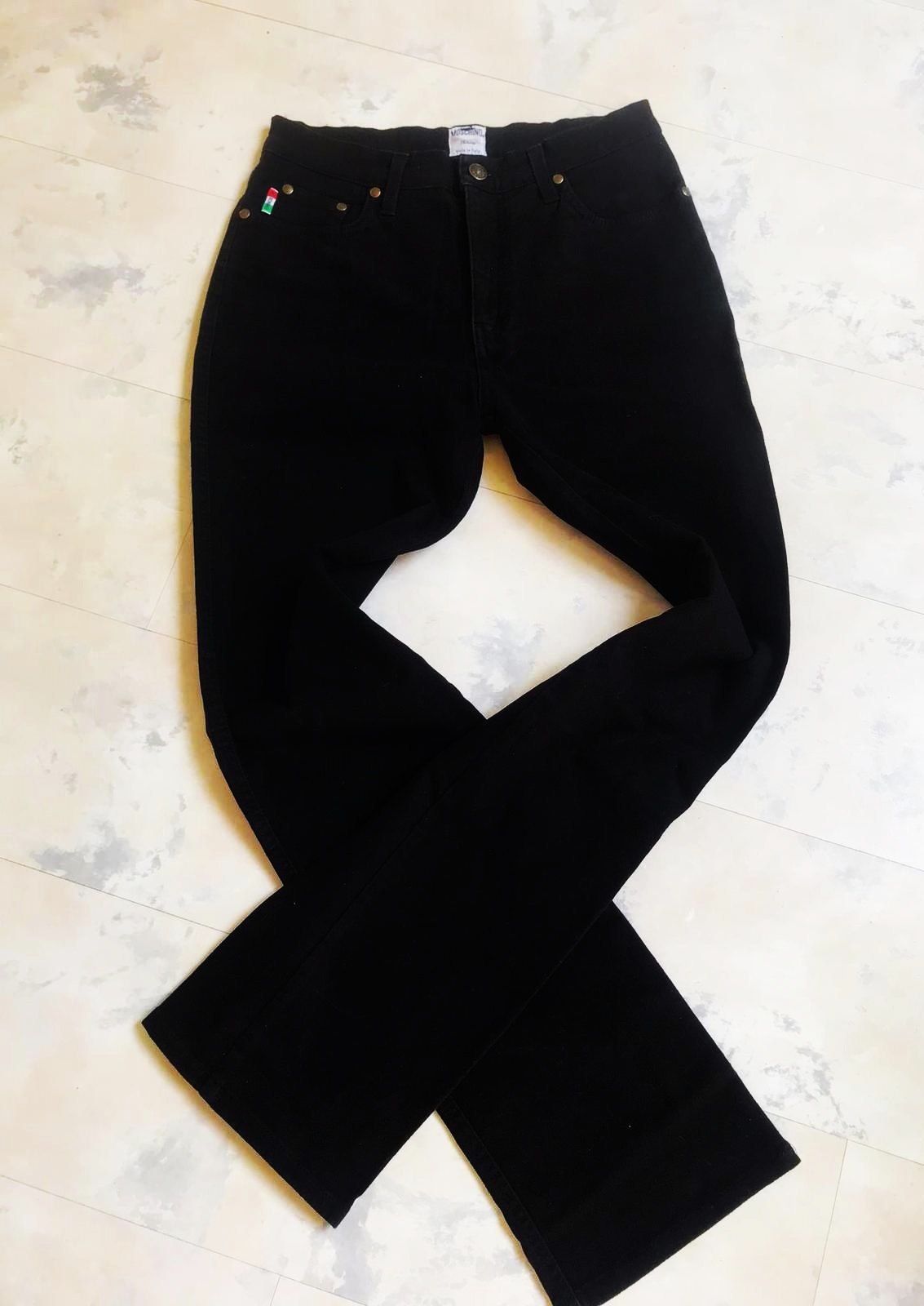 krásne ušité a dobre sadnúce kvalitné značkové rifle Moschino ,kto pozná značku - ocení,vysoký pás,perfektný materiál,sýta čierna farba,rifle sú skoro nenosené - ako nové,predávam za tretinovú cenu 95% bavlna,5% elastan,špičkový materiál jemne podobný diftínu, uvedená veľkosť 30