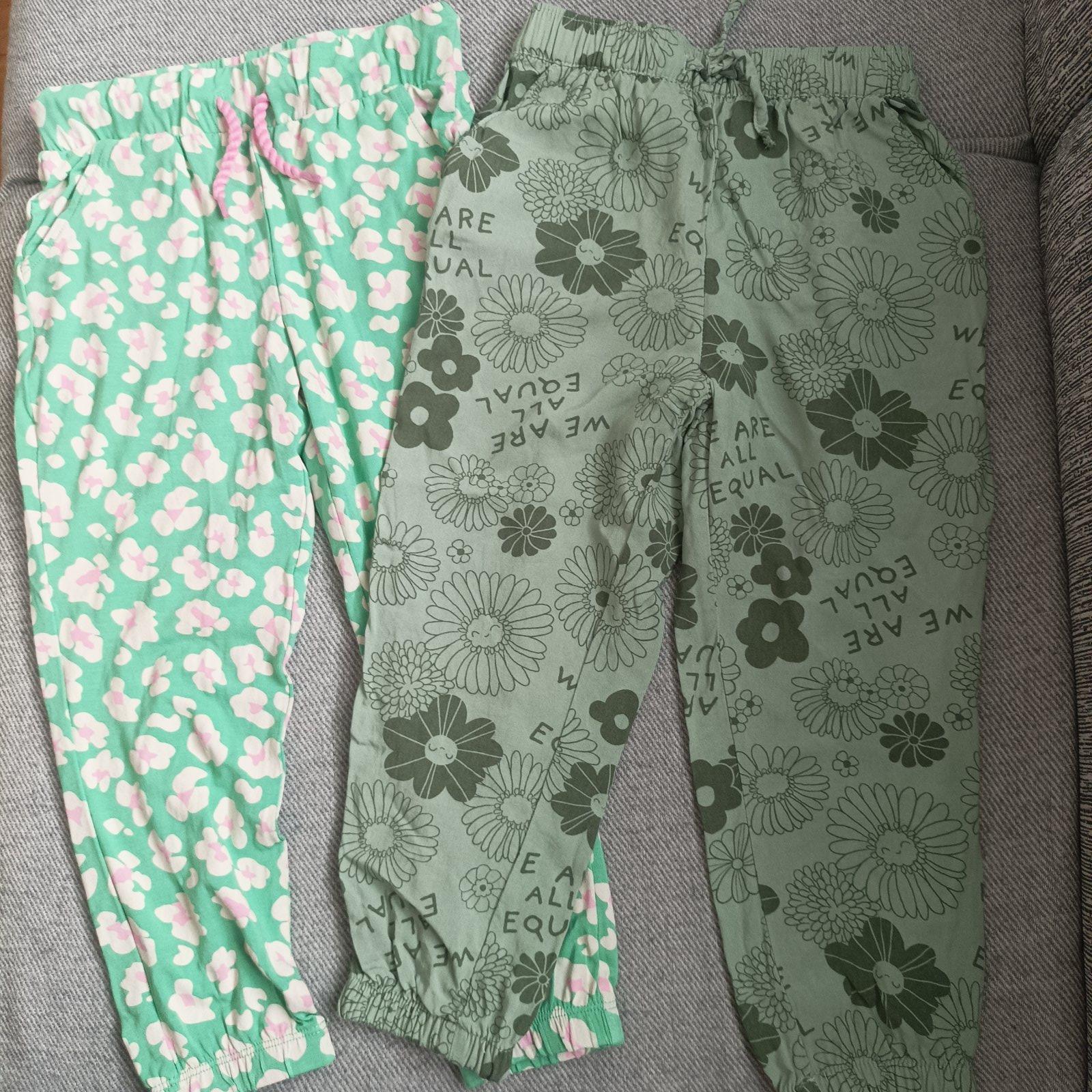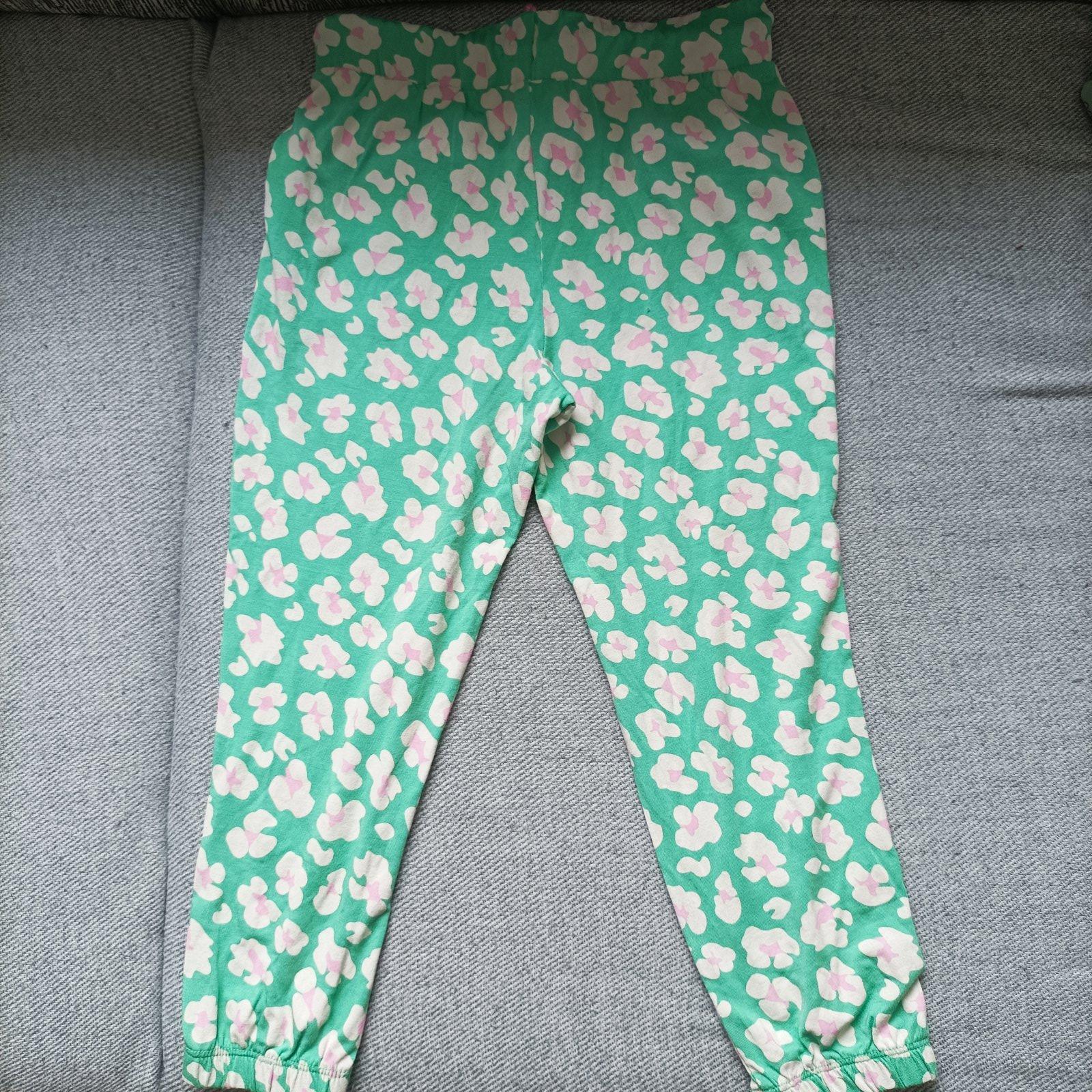Zelene s ružovými kvietkami Tchibo, písaná veľkosť 98/104, ale sú omnoho vacsie. Dĺžka 60 cm, od rozkroku 40,5 cm, pás v kľude 27 cm, v páse široká guma aj šnúrka na stiahnutie, ukončené tenkou gumičkou, 2 vrecká, elastické, 95 %viskóza, 5% elastan.